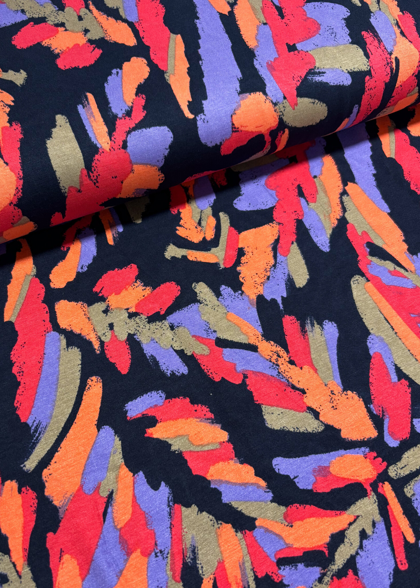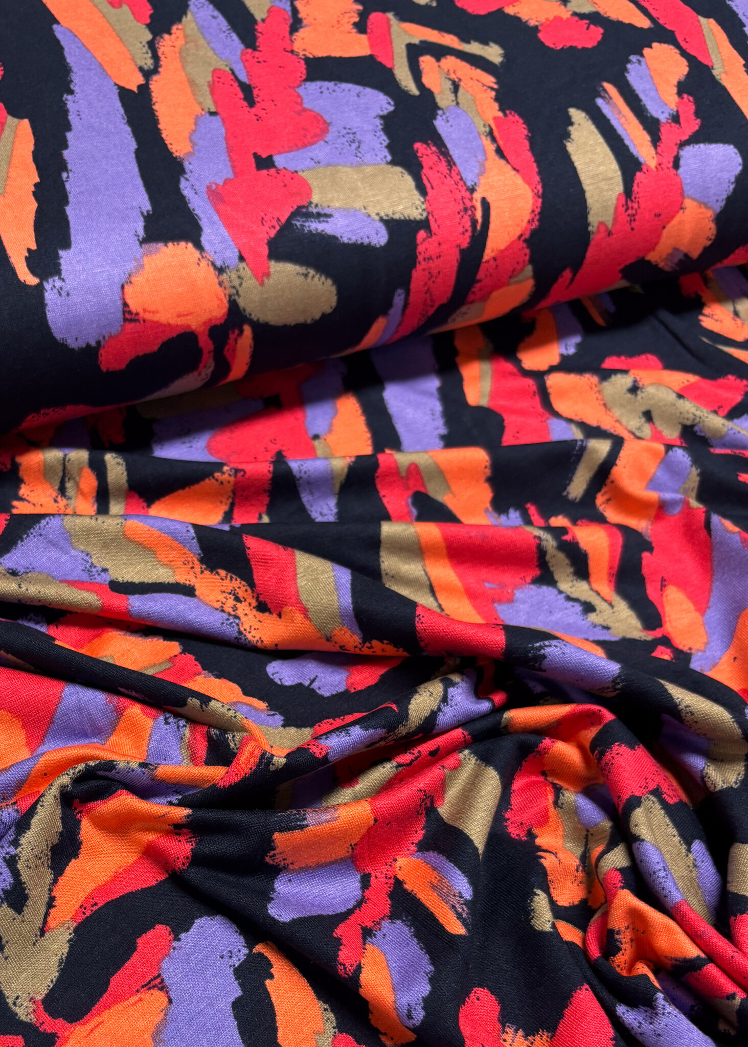 A fine viscose jersey with abstract print. OEKO TEX. Soft and supple fabric, very suitable for T-shirts and sporty dresses for women.