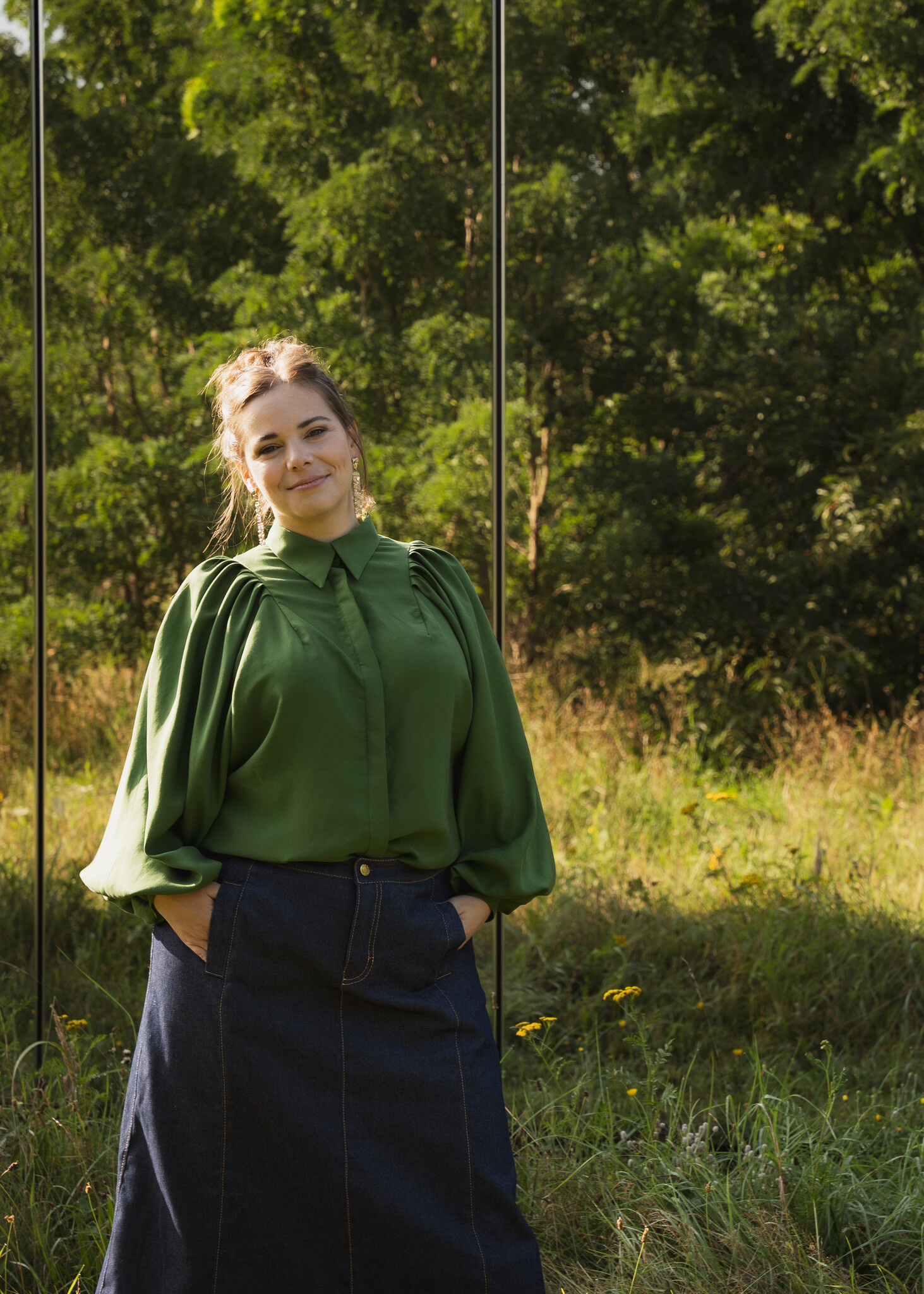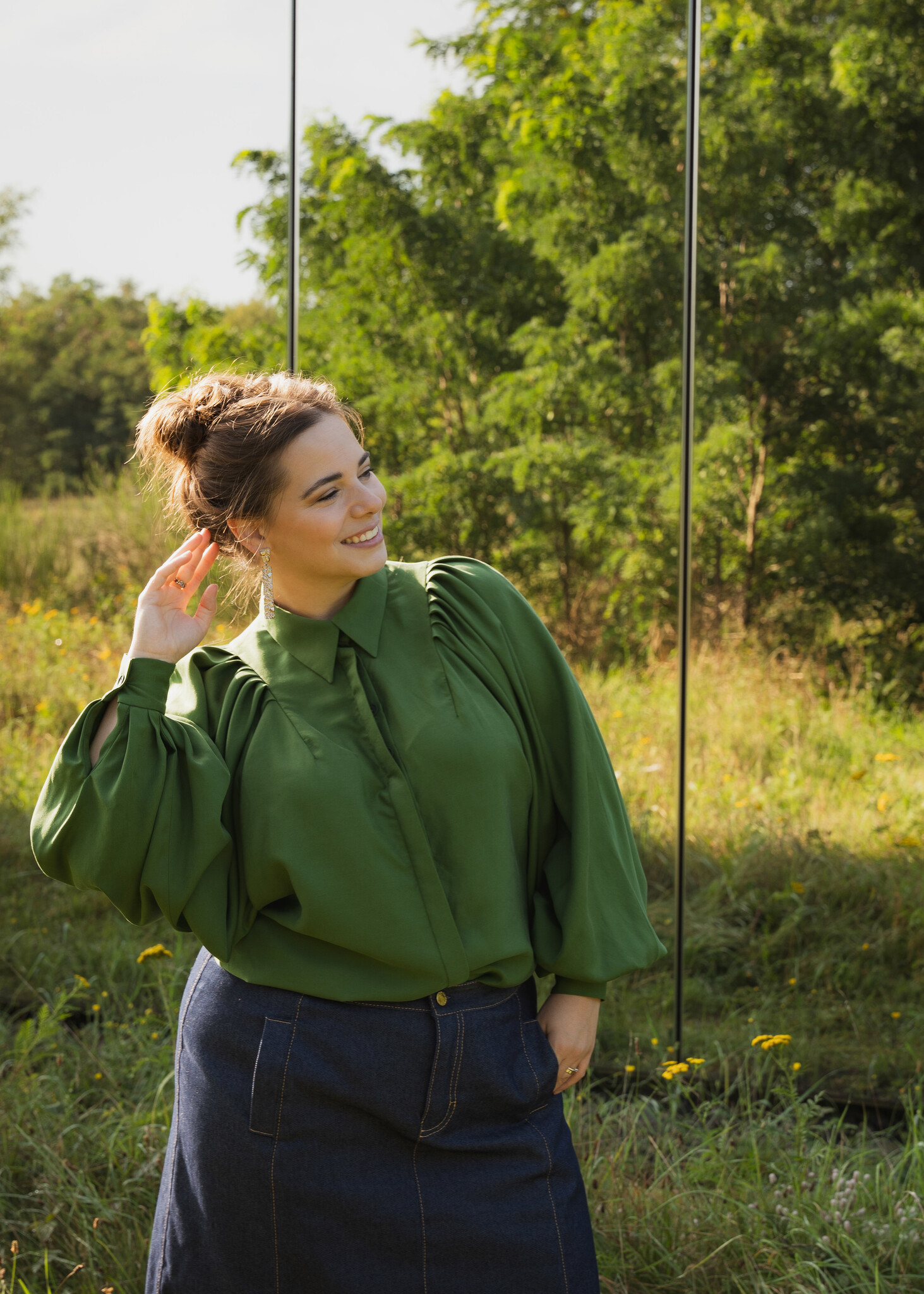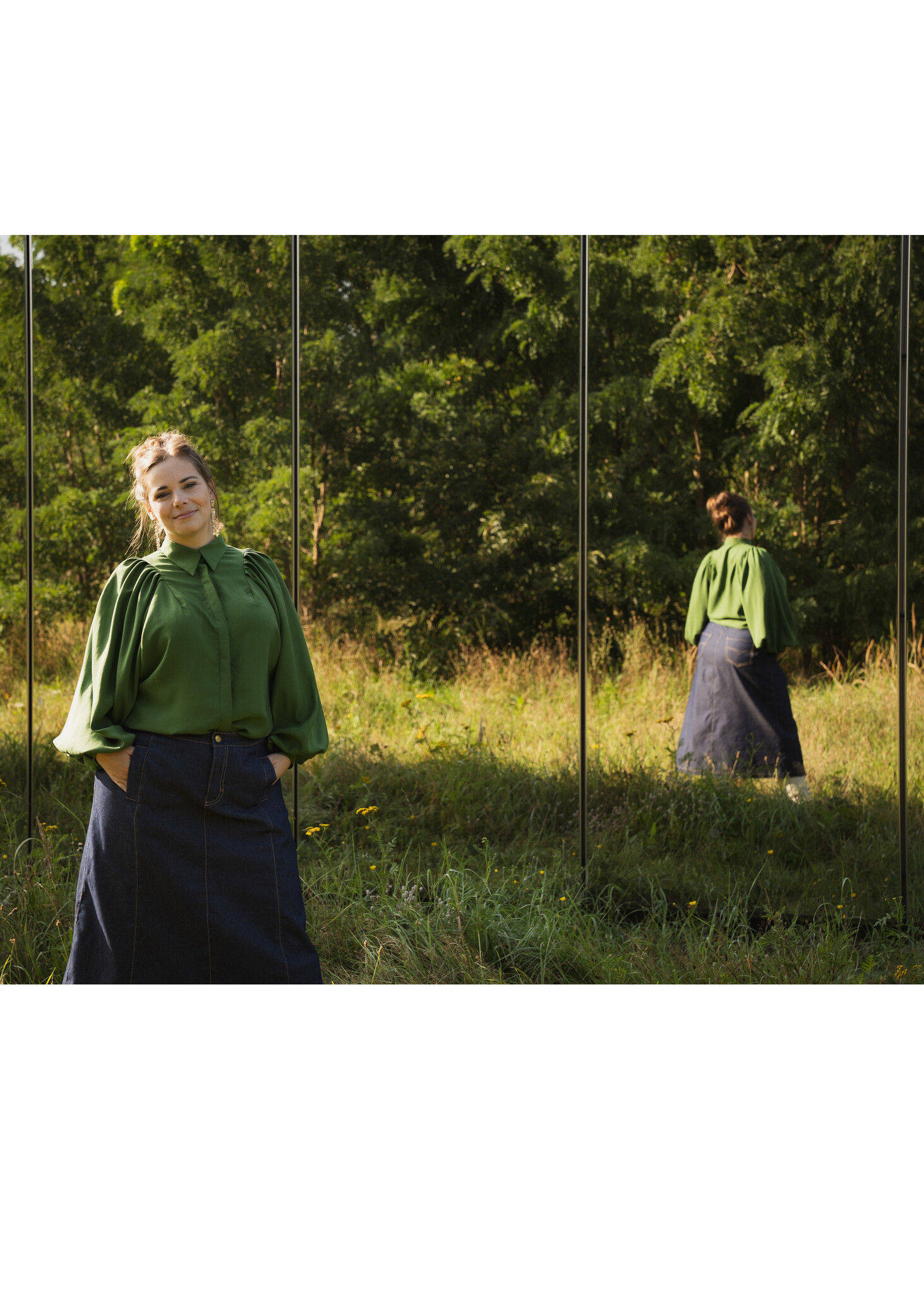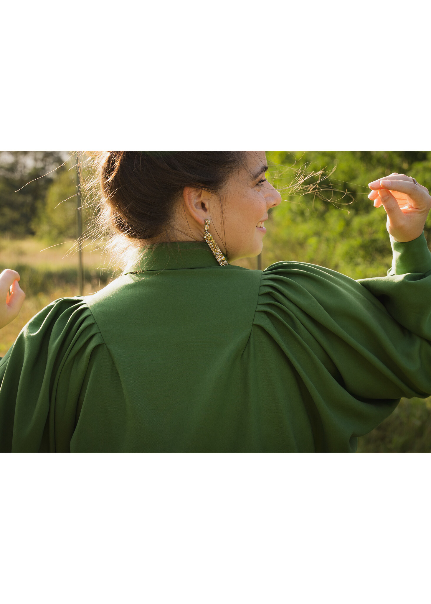 Arya is a real statement blouse with large puff sleeves. You can go in many directions with this blouse.