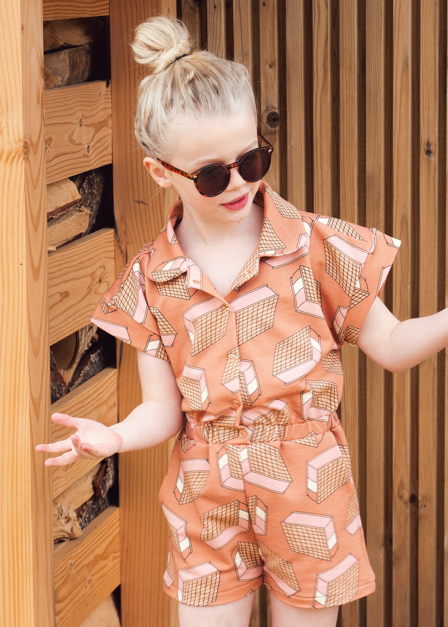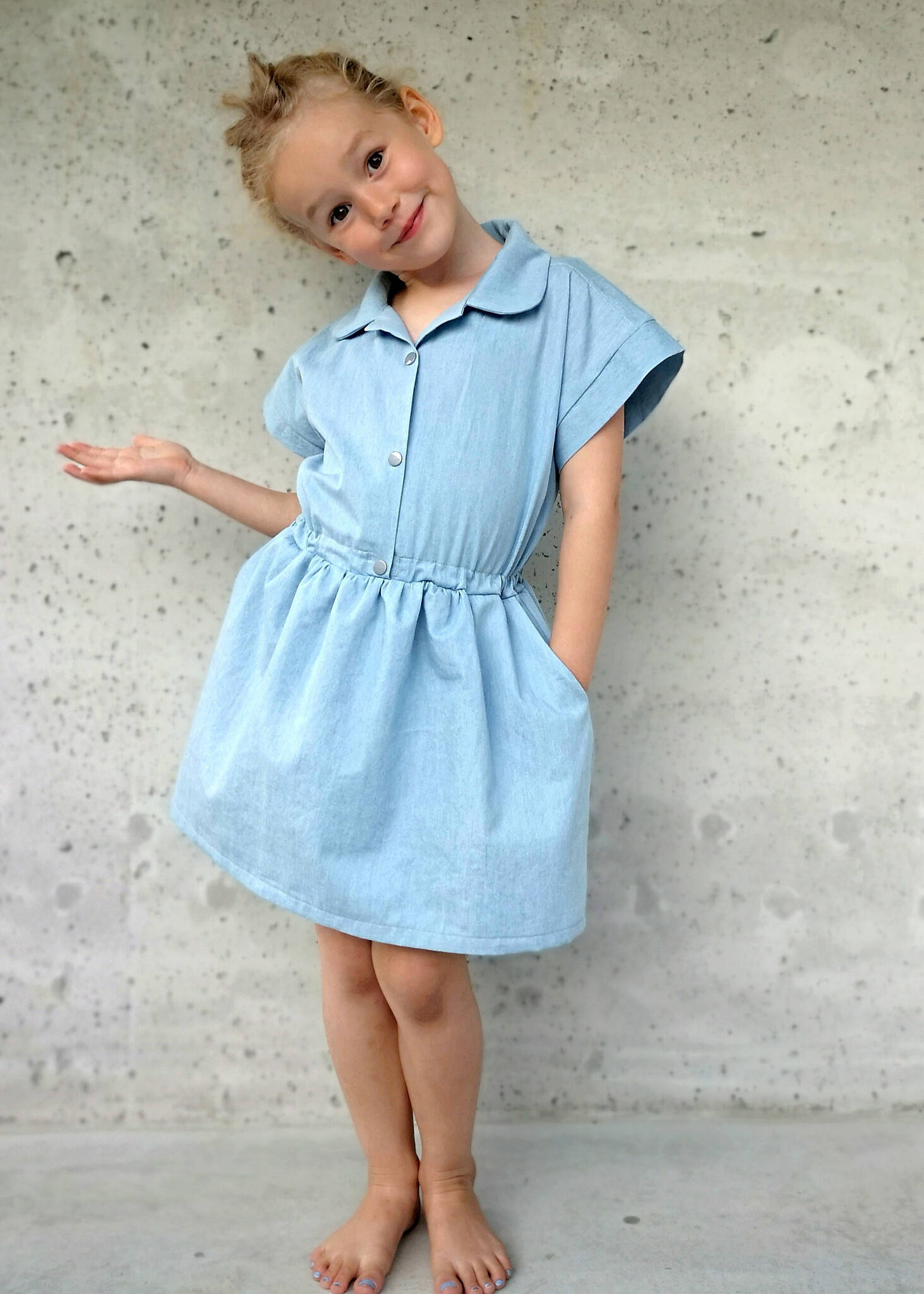Asi is a cheerful pattern for a playsuit (shorts), jumpsuit (long pants) or dress with side pockets. The top has a collar and facing and closes with buttons. Put in a round or pointy collar. The sleeves have cuffs and the waist has a thin elastic.