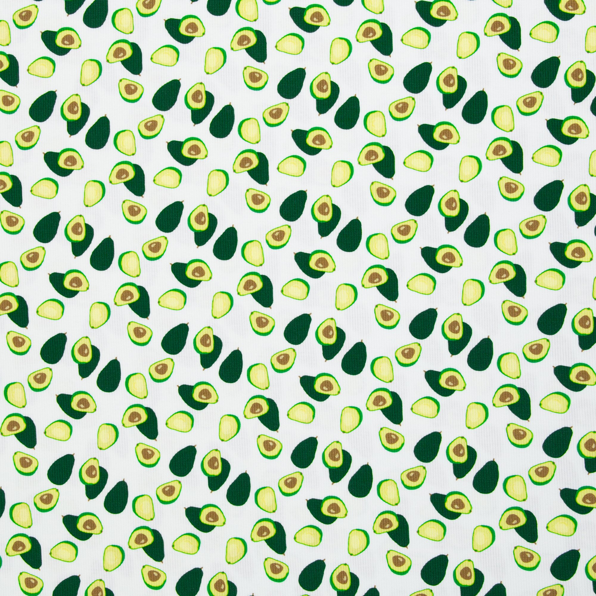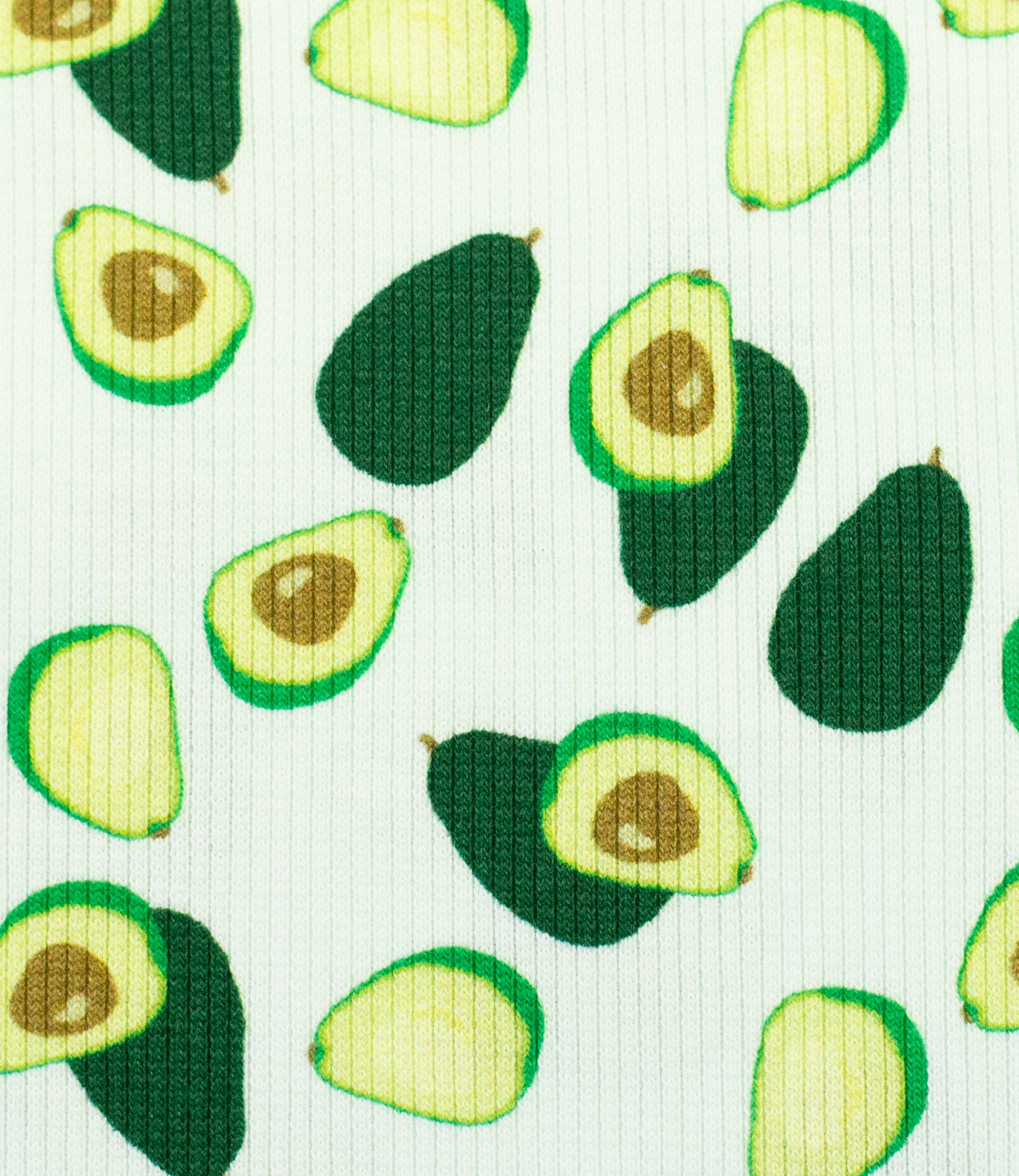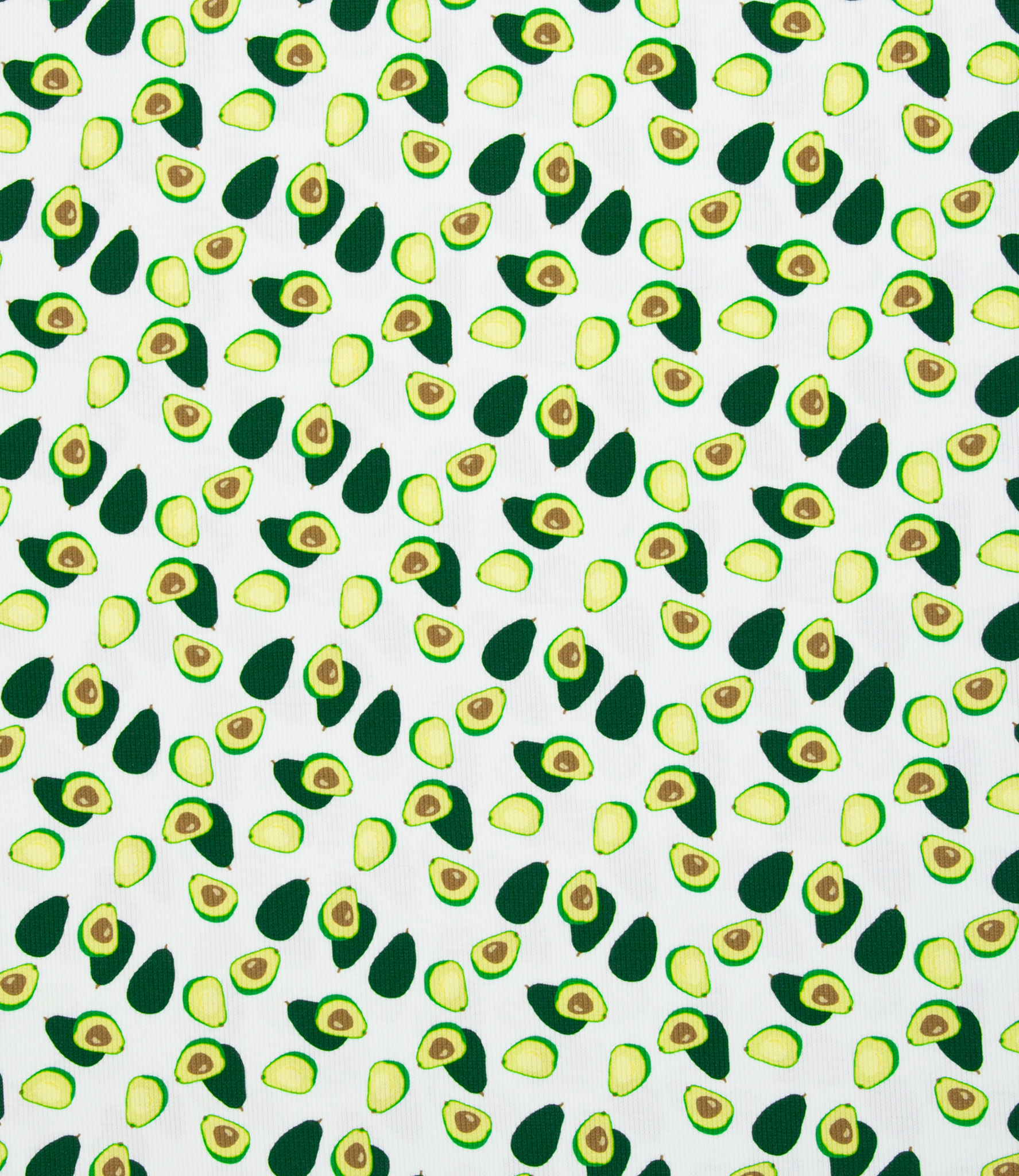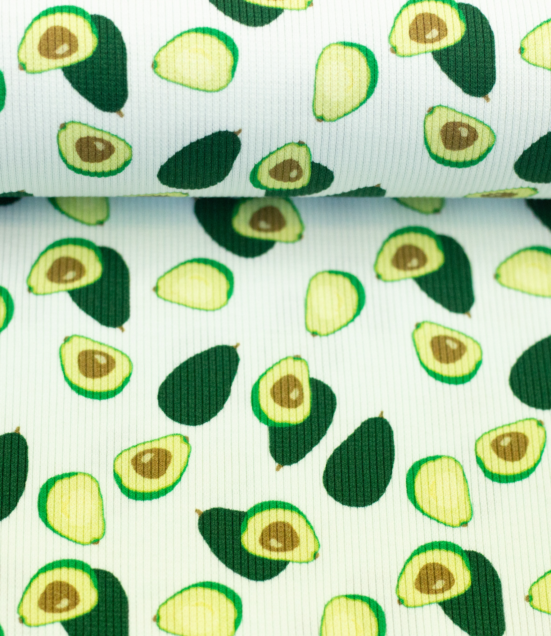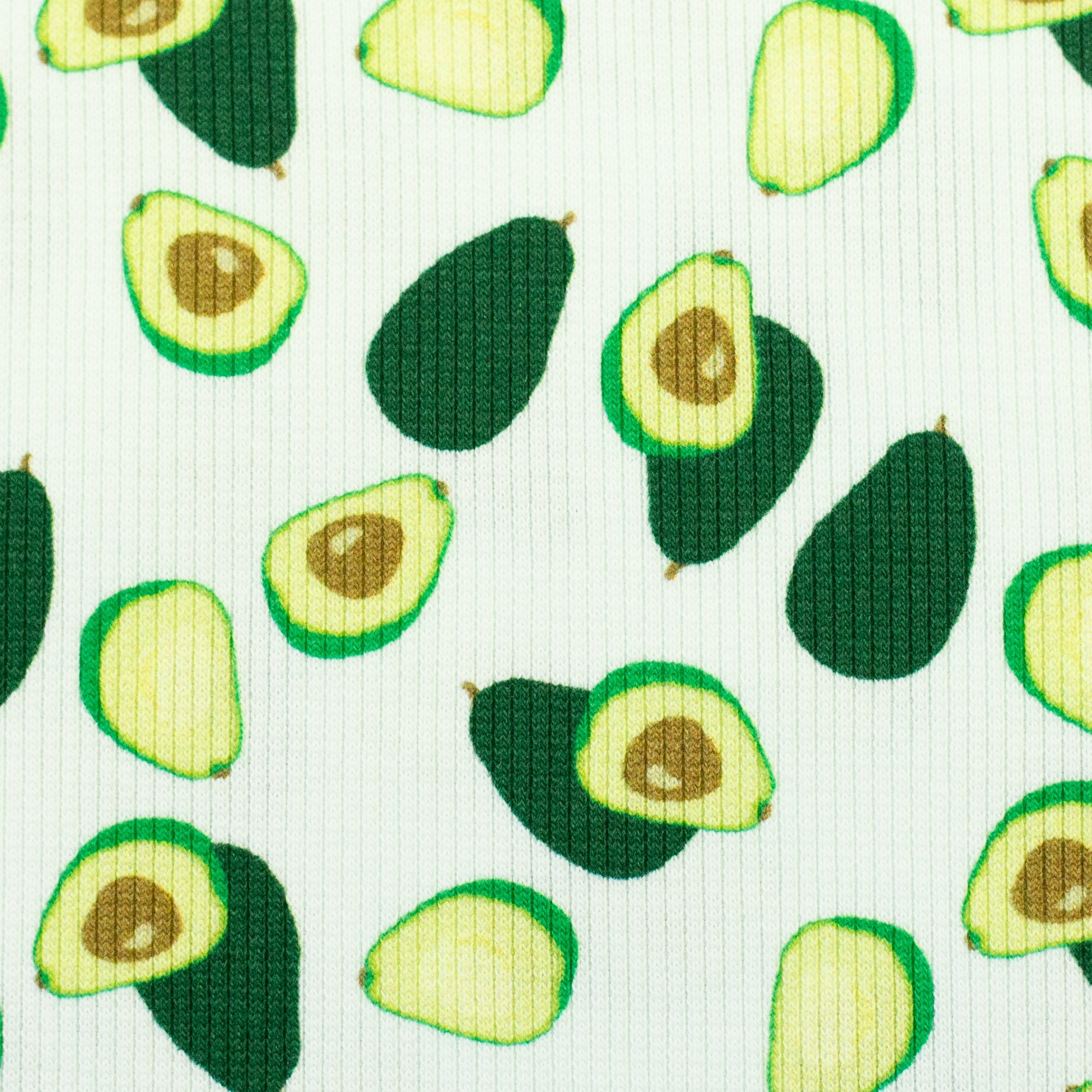 A ribbed knit with avocados. Swafling fabric. Super cool for children's and baby clothes. OEKO-tex