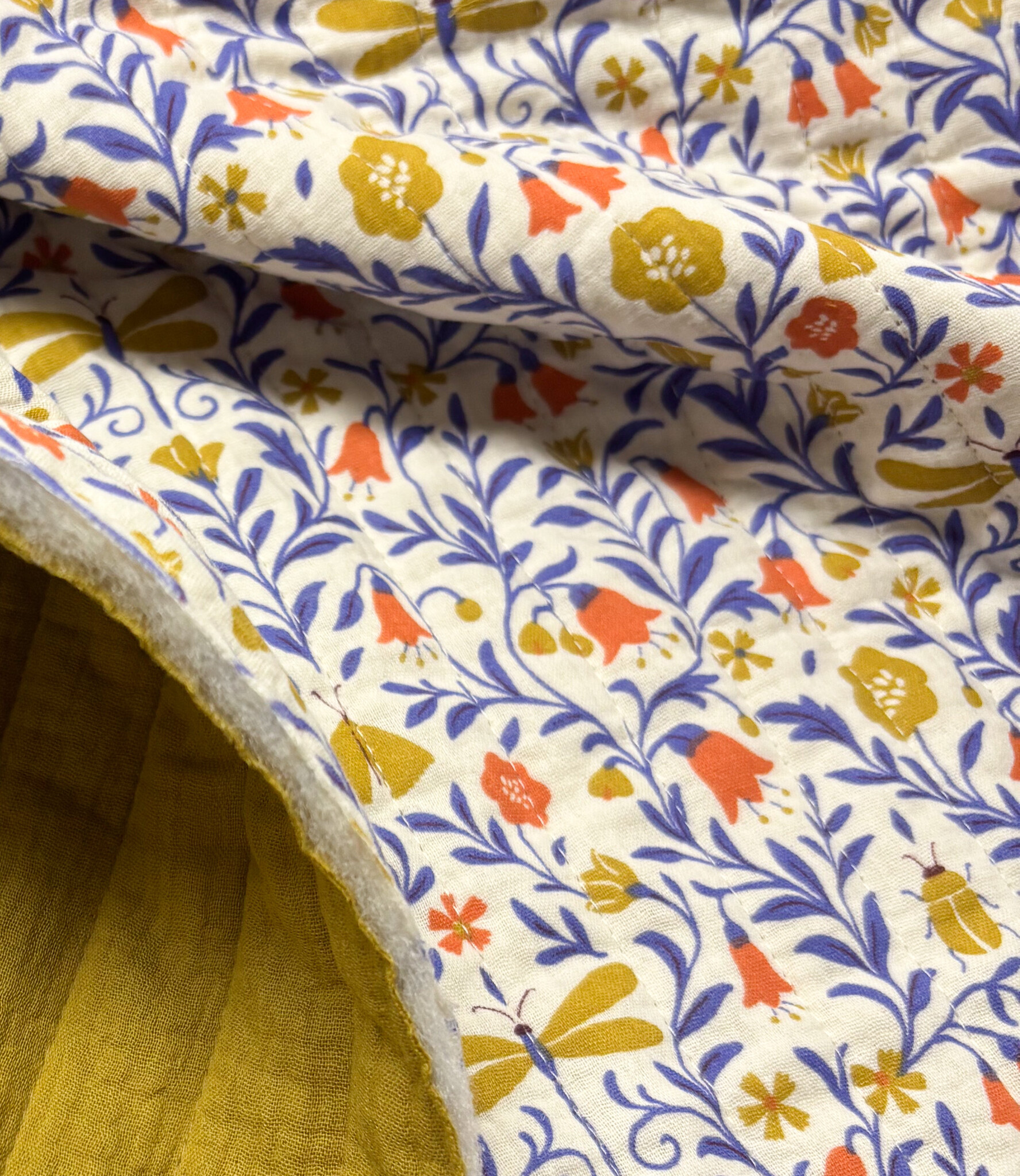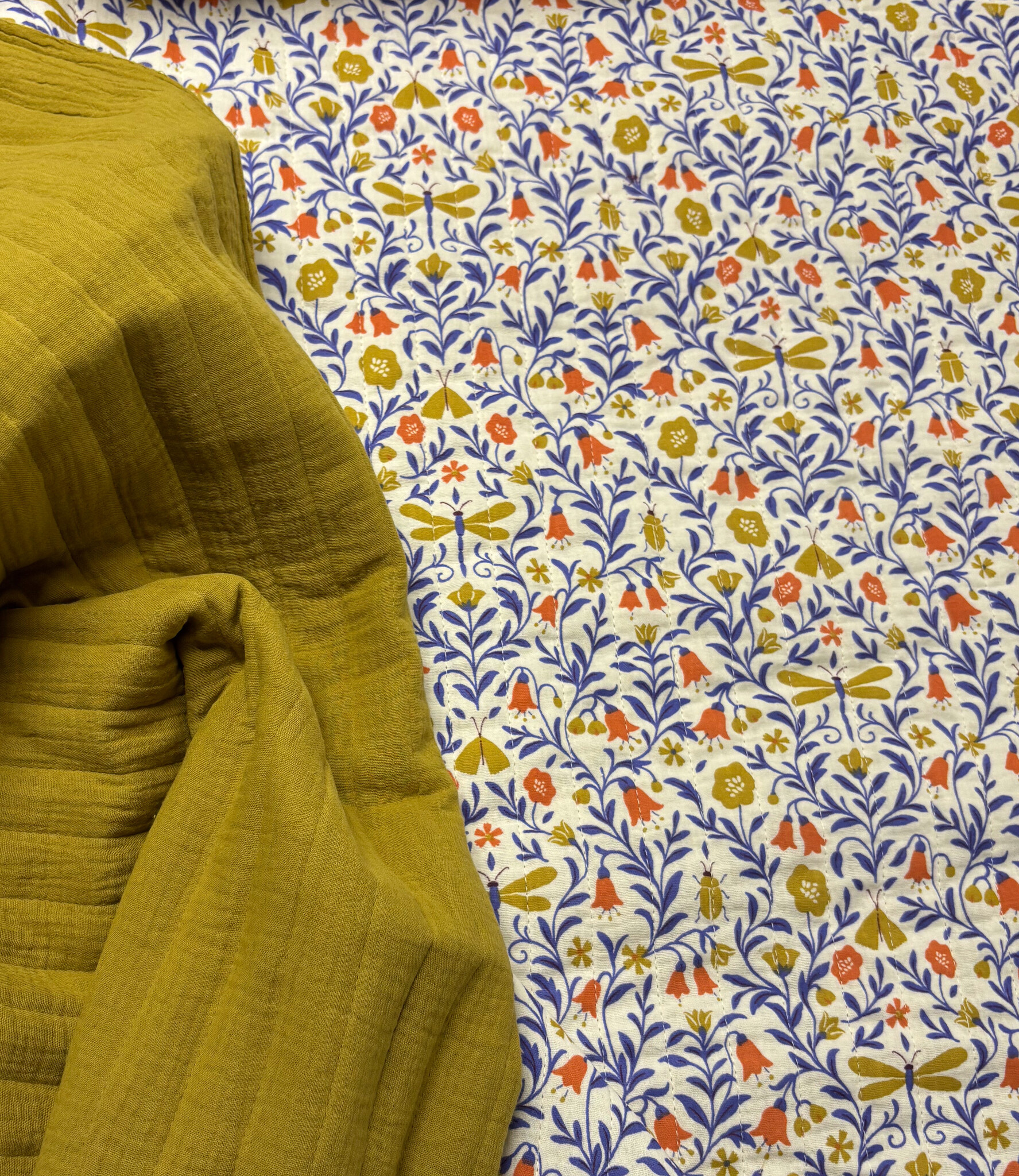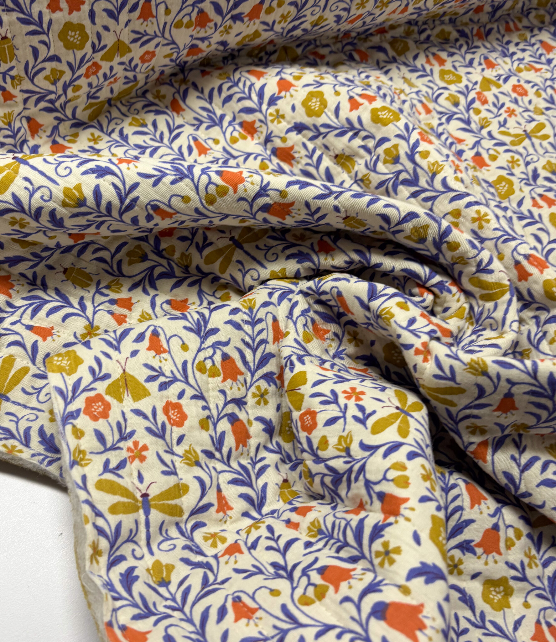 A soft, quilted double gauze tetra with an abstract print. Double-faced, this fabric can be used on both sides. One side has a beautiful print, the other is plain. Perfect for jackets, body warmers, blankets, toiletry bags, and more.