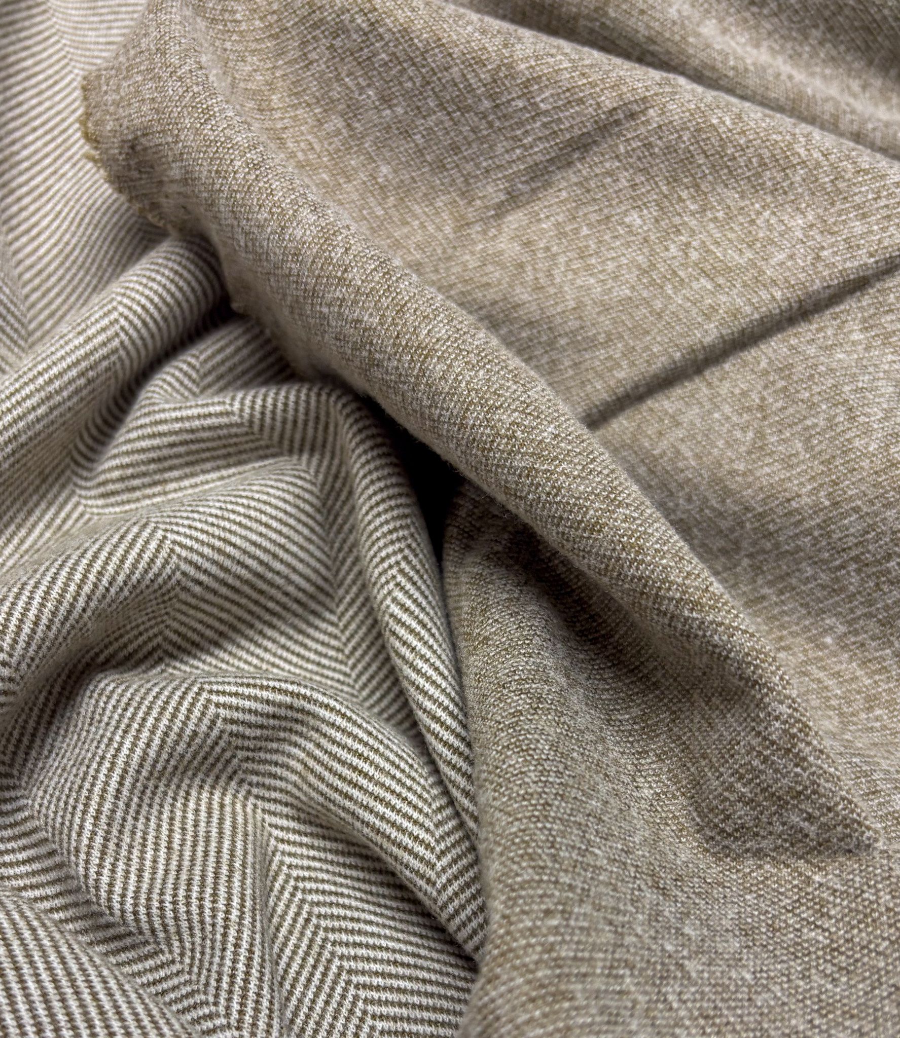 A soft herringbone fabric for trousers. This fabric has a wool feel and is perfect for warm trousers, cardigans, skirts, and more.