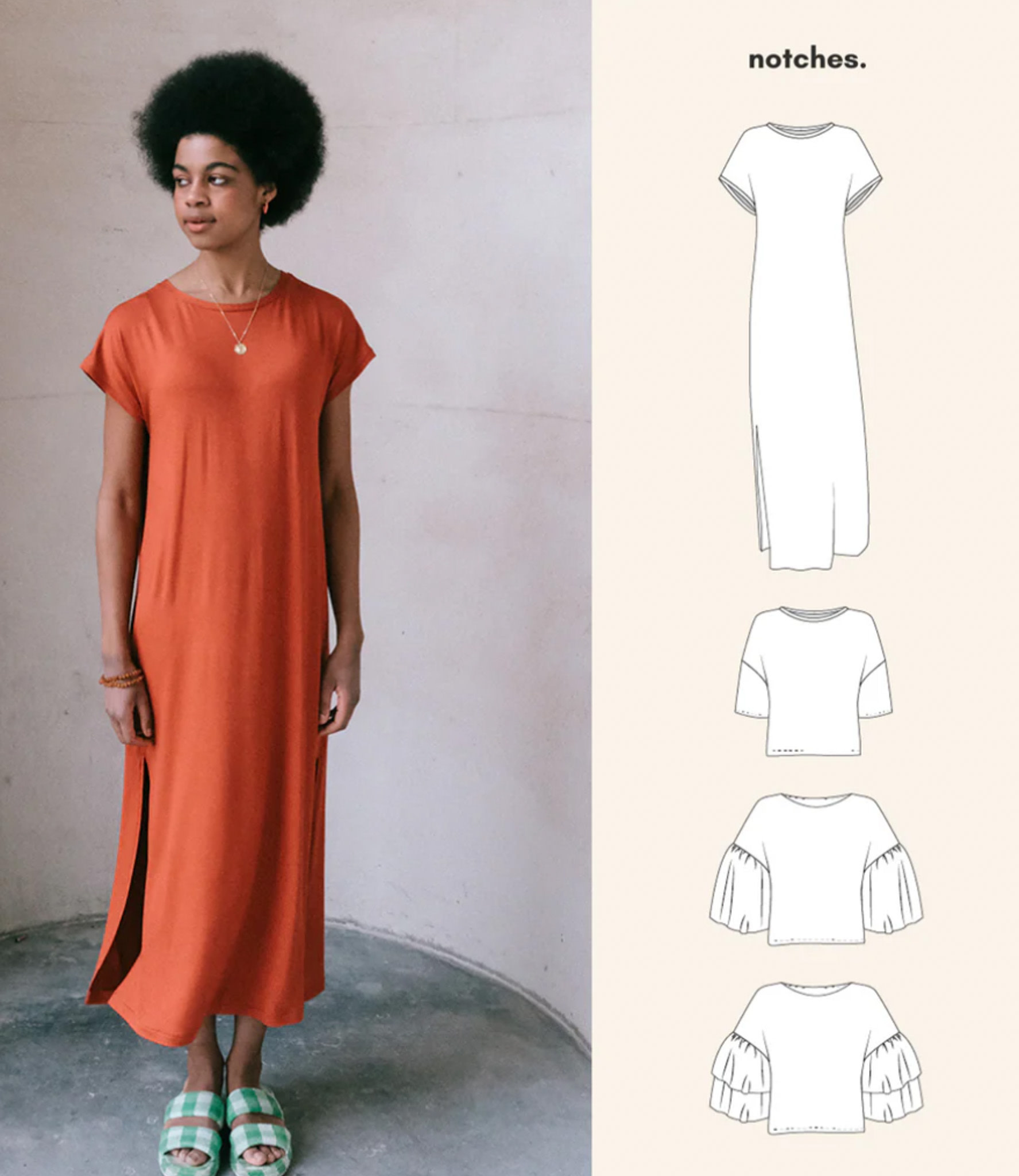 The loose cut makes the pattern suitable for a wide range of knit fabrics regardless of their elasticity, such as interlock, French terry, or lightweight sweater fabrics for a casual look, or a flowing viscose or bamboo knit for a more elegant appearance.