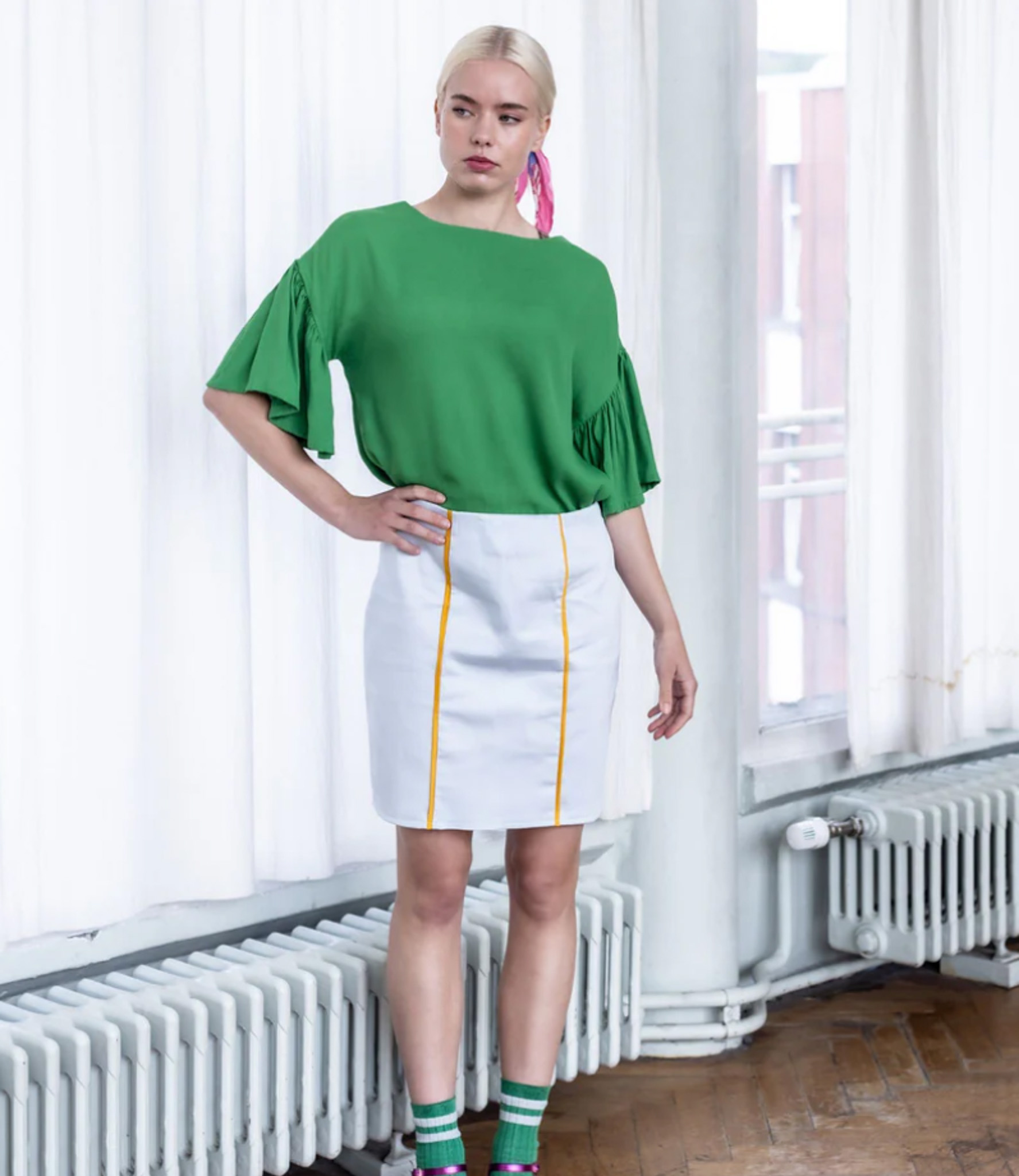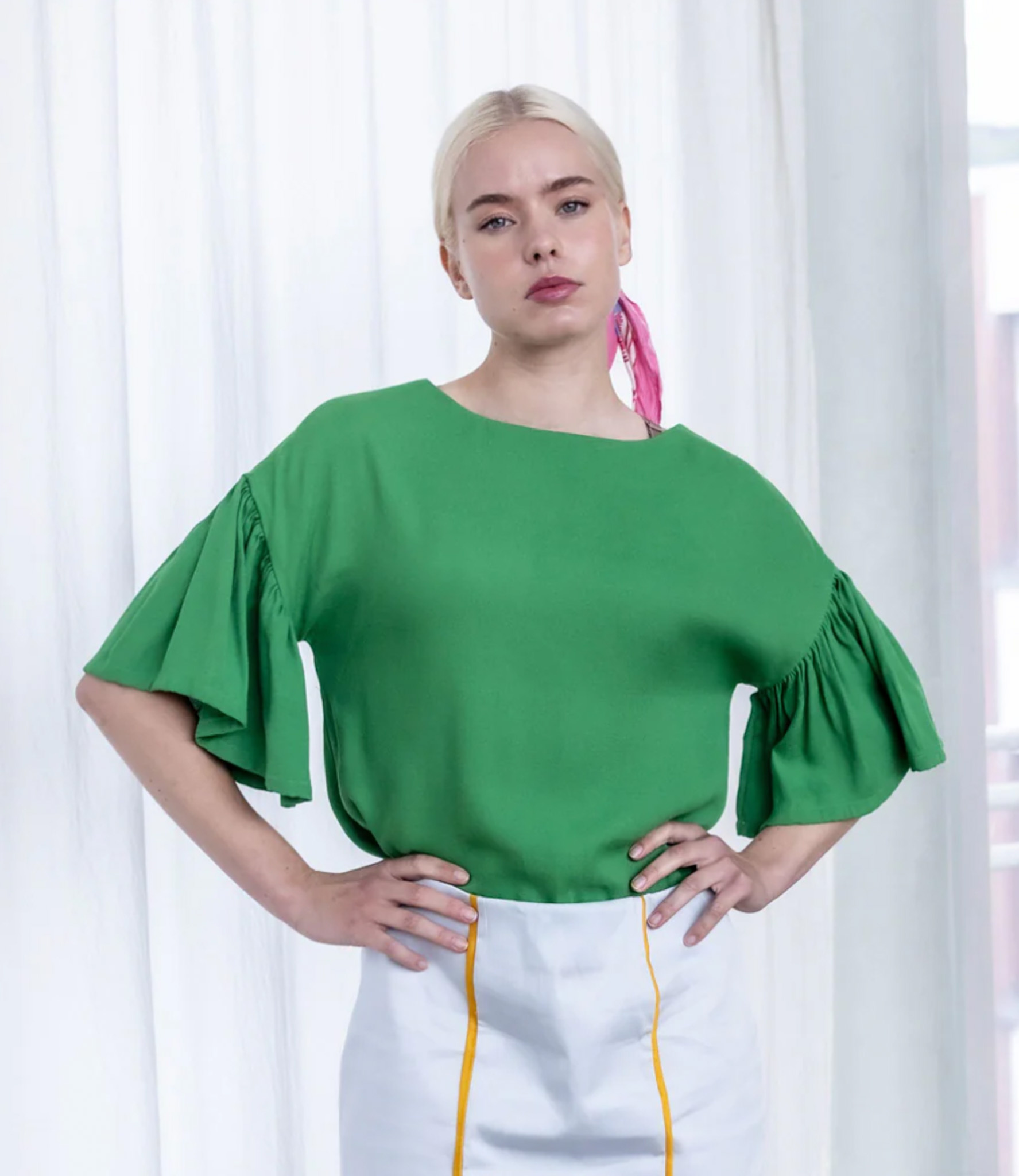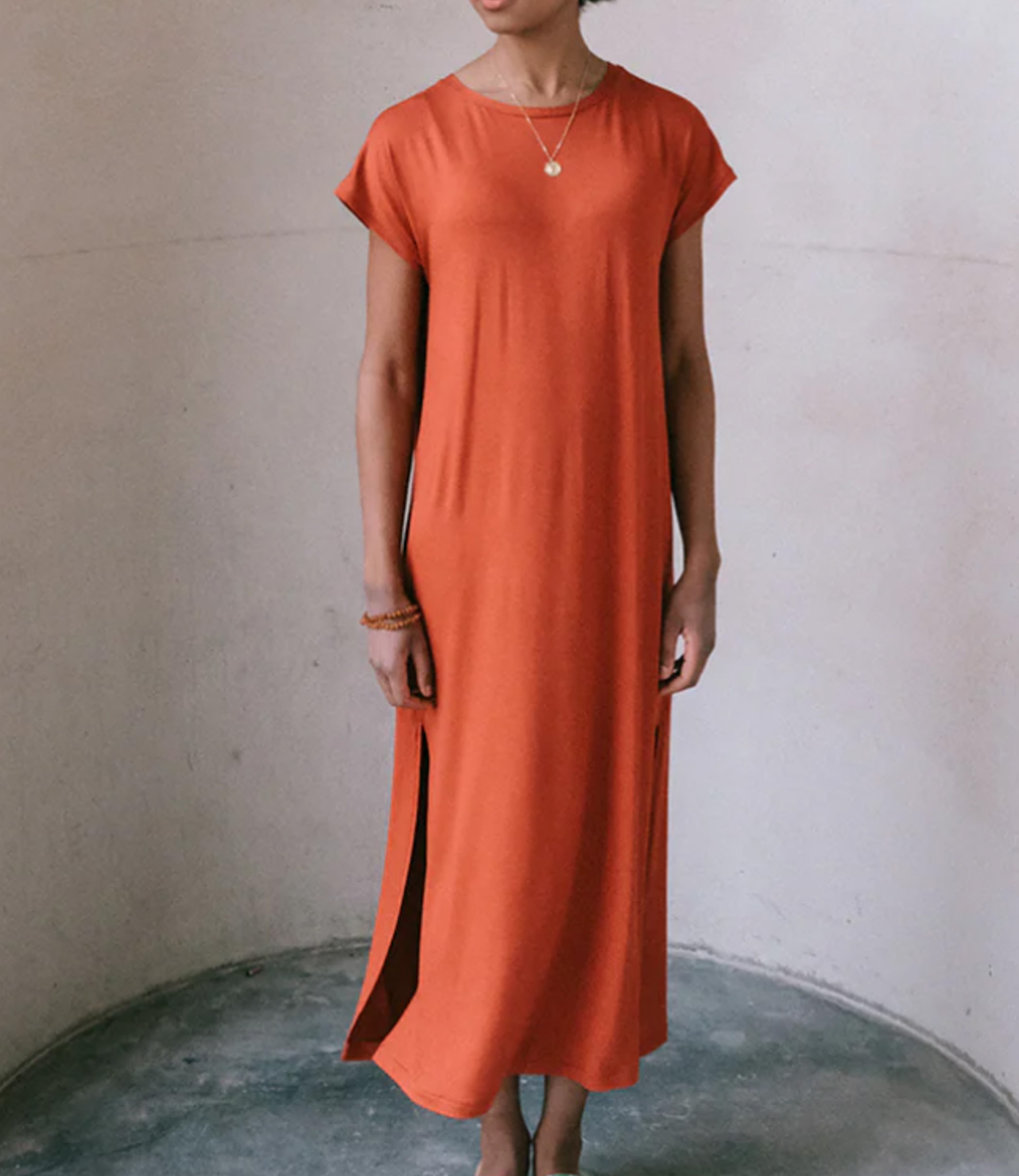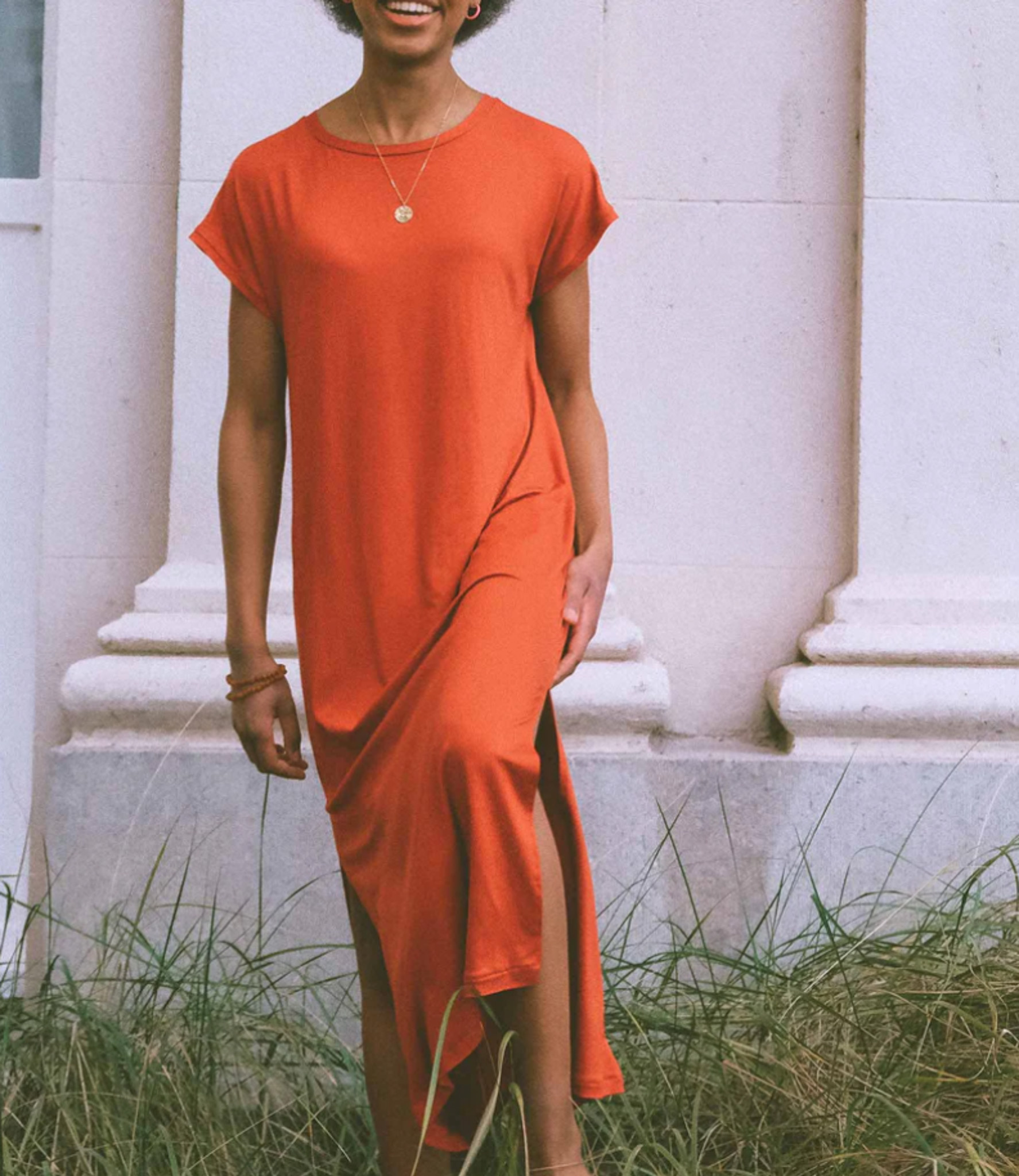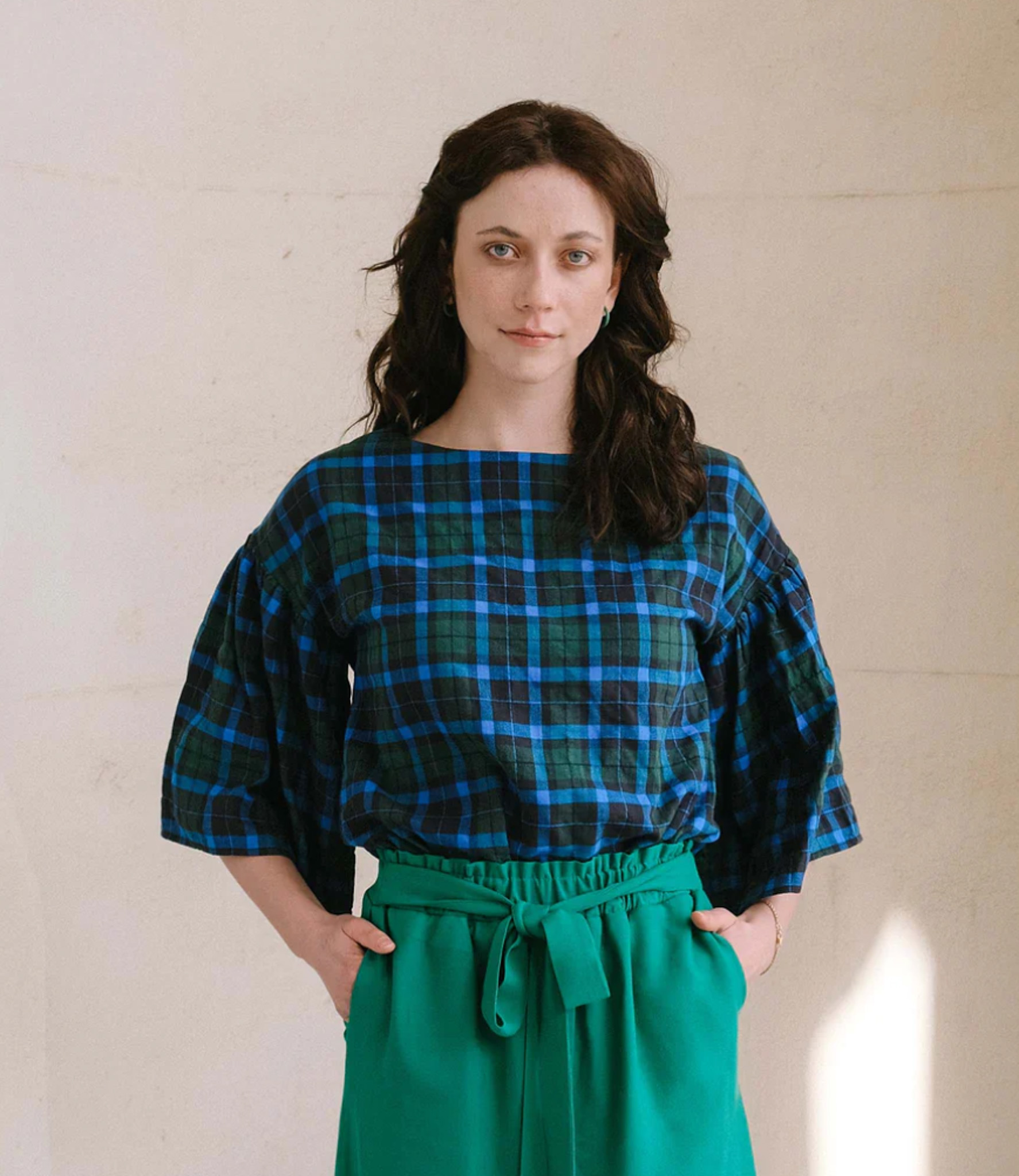 Billy has a wide, straight cut, which is suitable for many body types. There is no bust dart. The dress comes in two lengths: just above the knee and mid-calf. The long version has two slits in the side seam for ample freedom of movement. The armholes are wide, but do not reveal too much if you choose the sleeveless version.