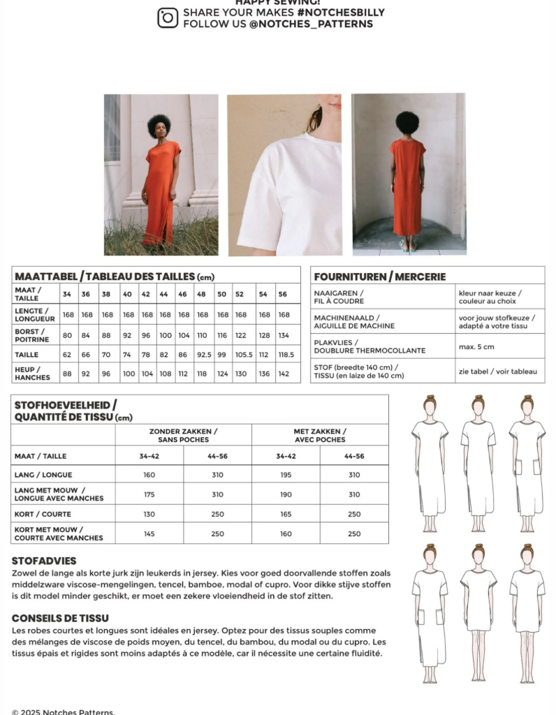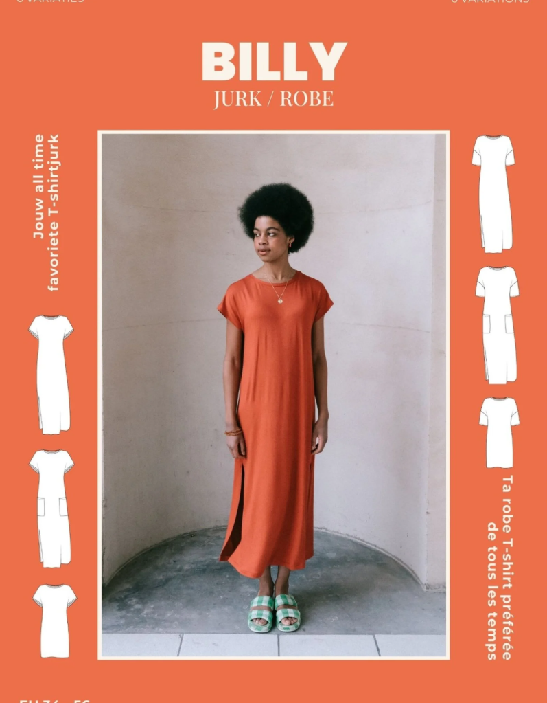 Billy is a straightforward model that you can make as a long or short T-shirt dress. It features a dropped shoulder and a choice of straight T-shirt sleeves or sleeveless, finished with a ribbed cuff. You can choose whether or not to include patch pockets on the front.