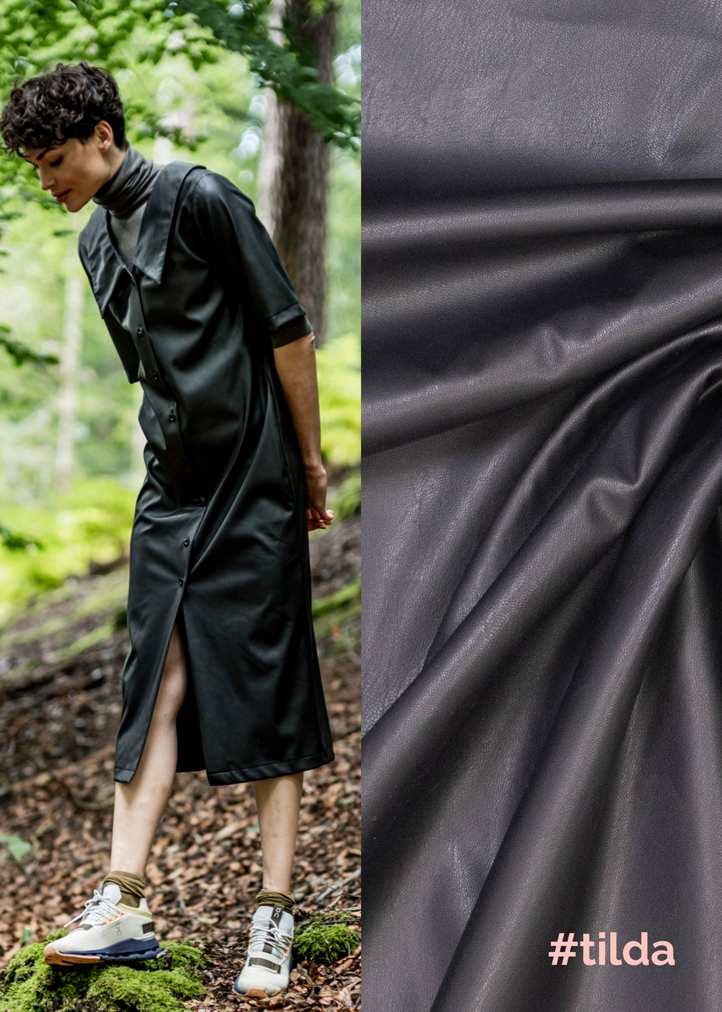 Vegan imitation leather with some stretch. Perfect for clothes. Used in Fibremood.