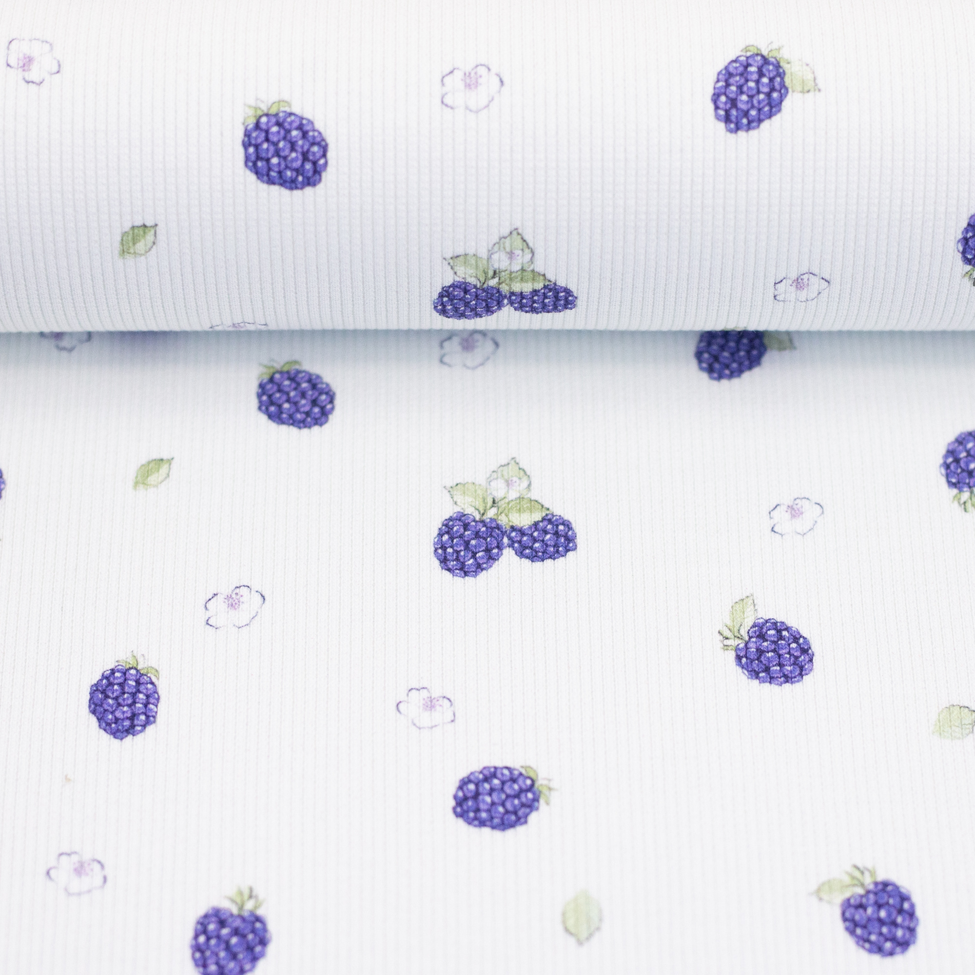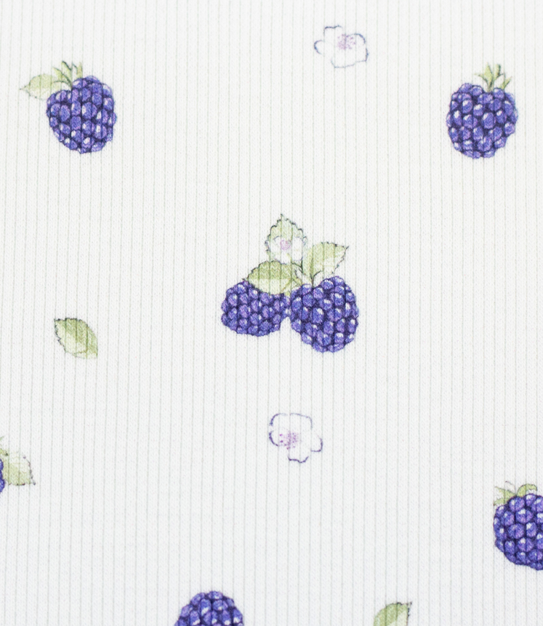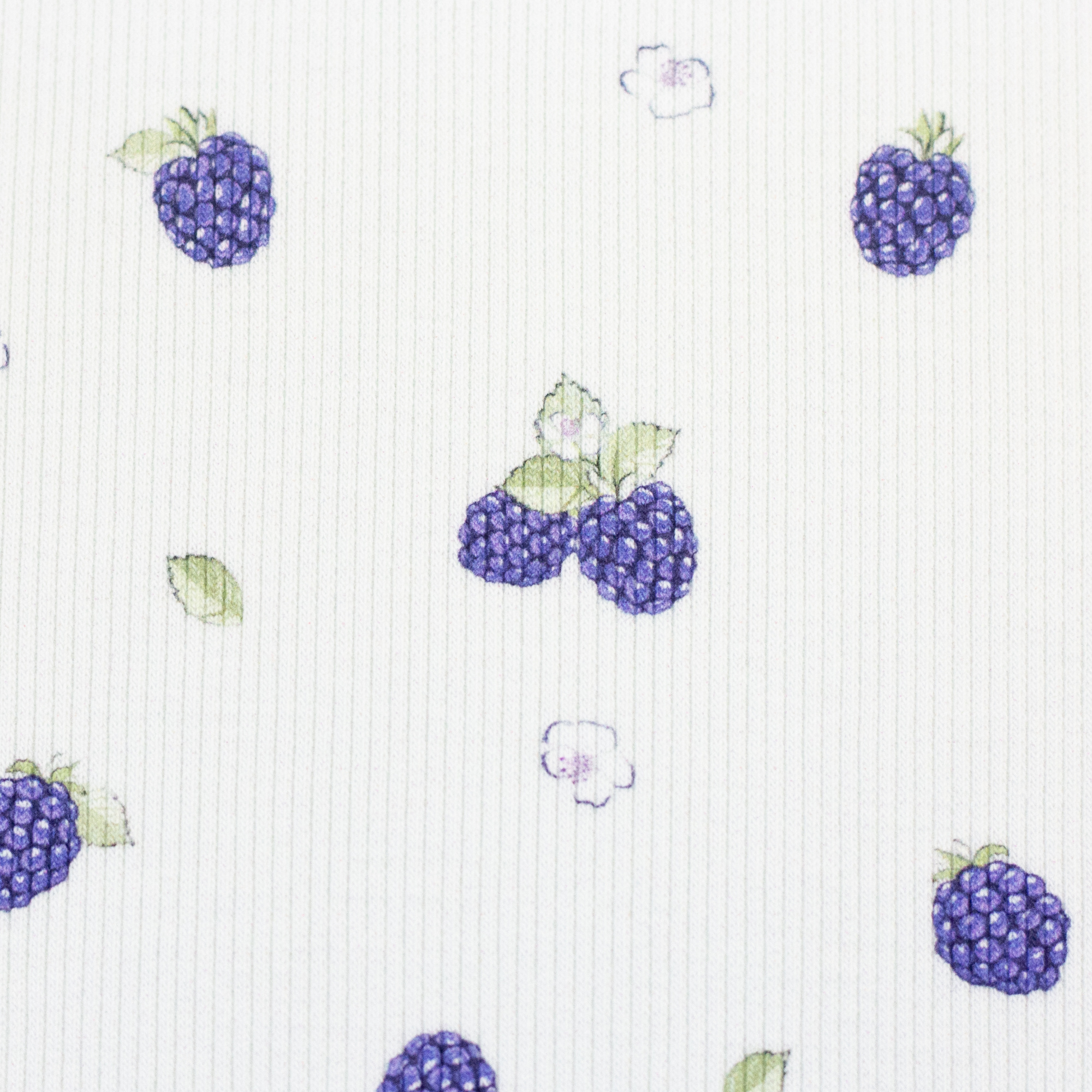 A ribbed knit with blackberries. Swafling fabric. Super cool for children's and baby clothes. OEKO-tex