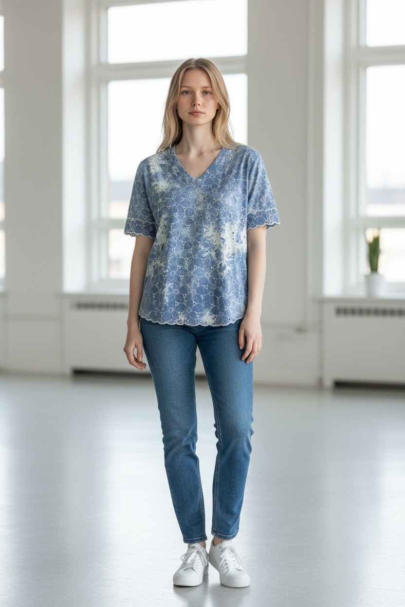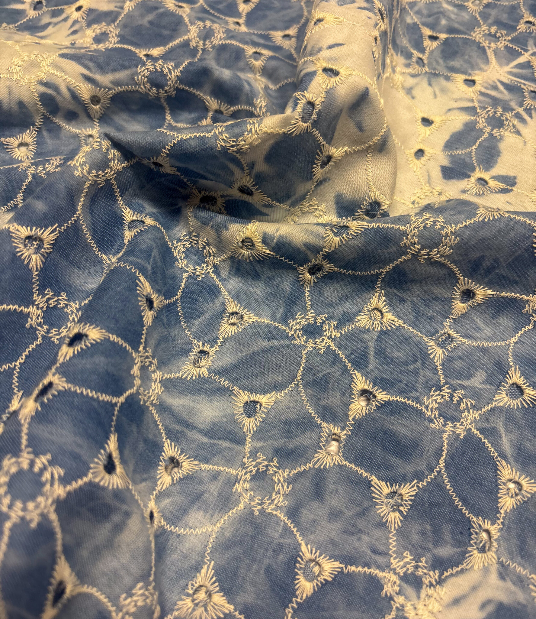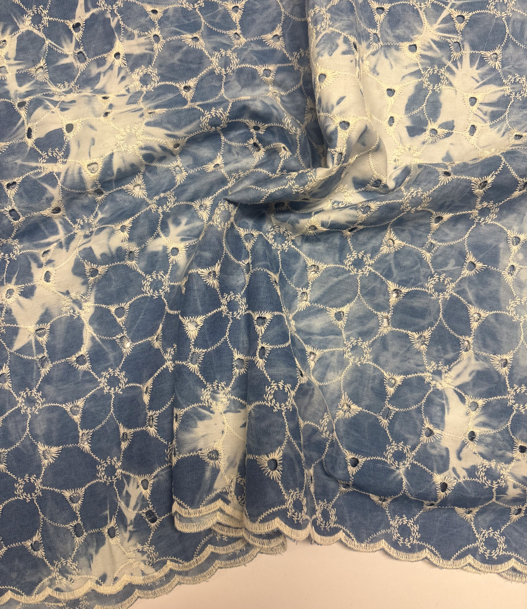 A beautiful embroidered cotton with a scalloped edge. You can use this scalloped edge on the sleeve, for example.