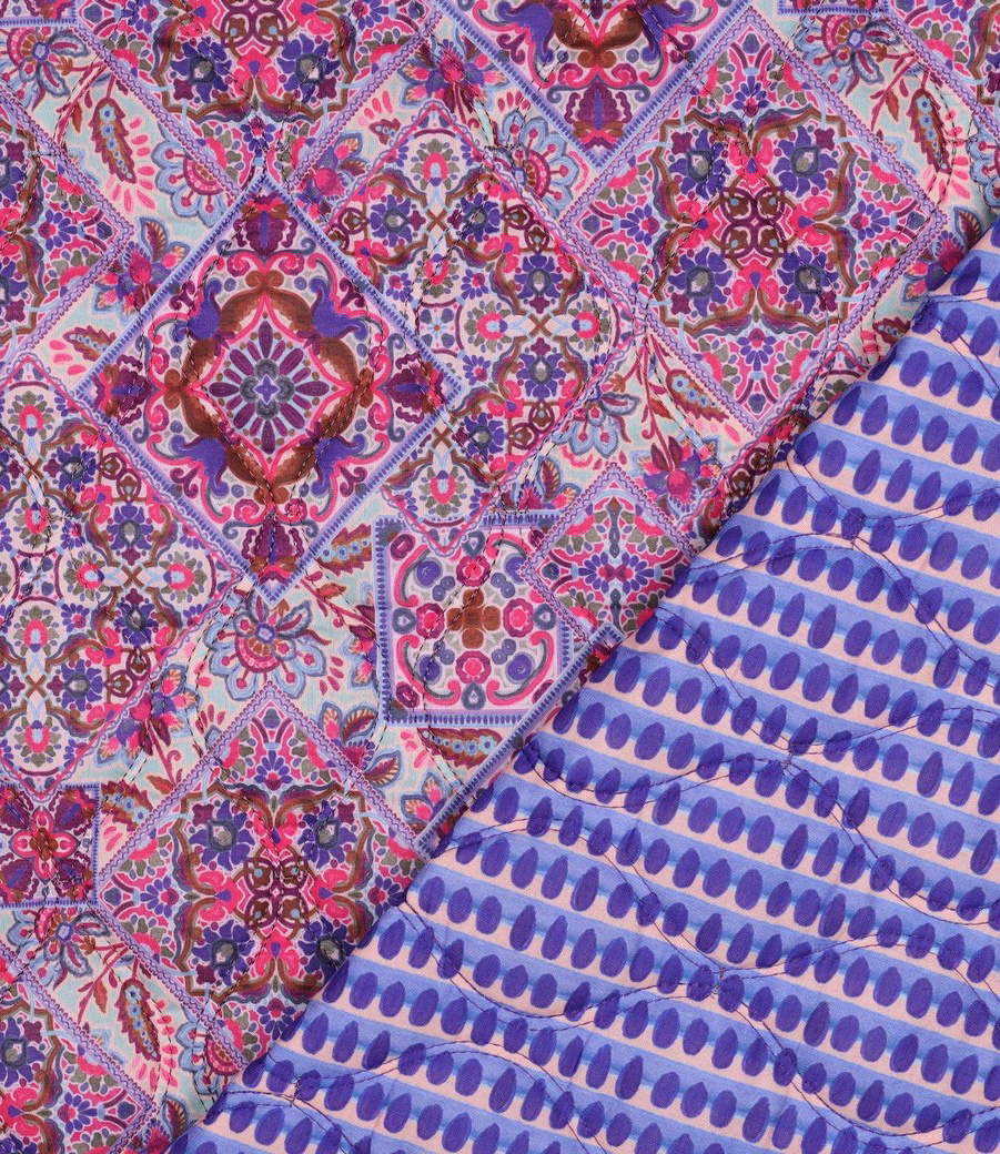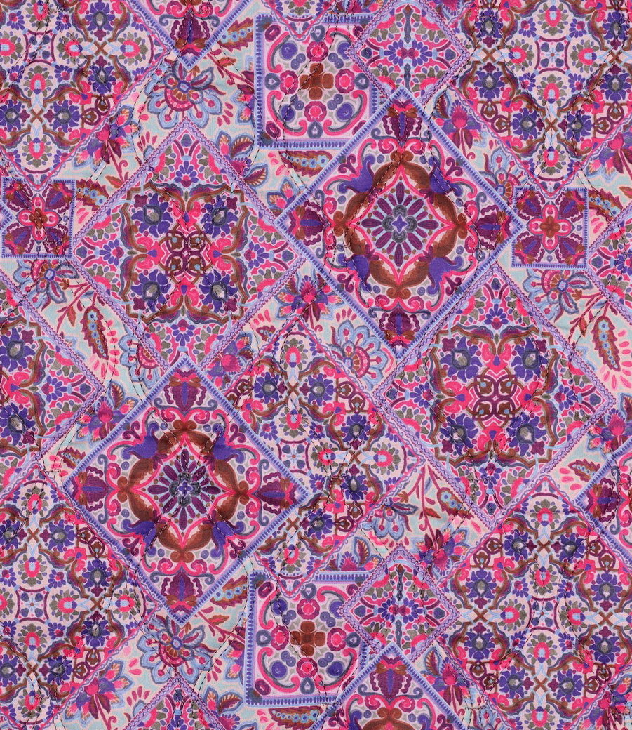 A quilted cotton with a blue print. This fabric is used in Poppy Meets Pommé edition 26 .