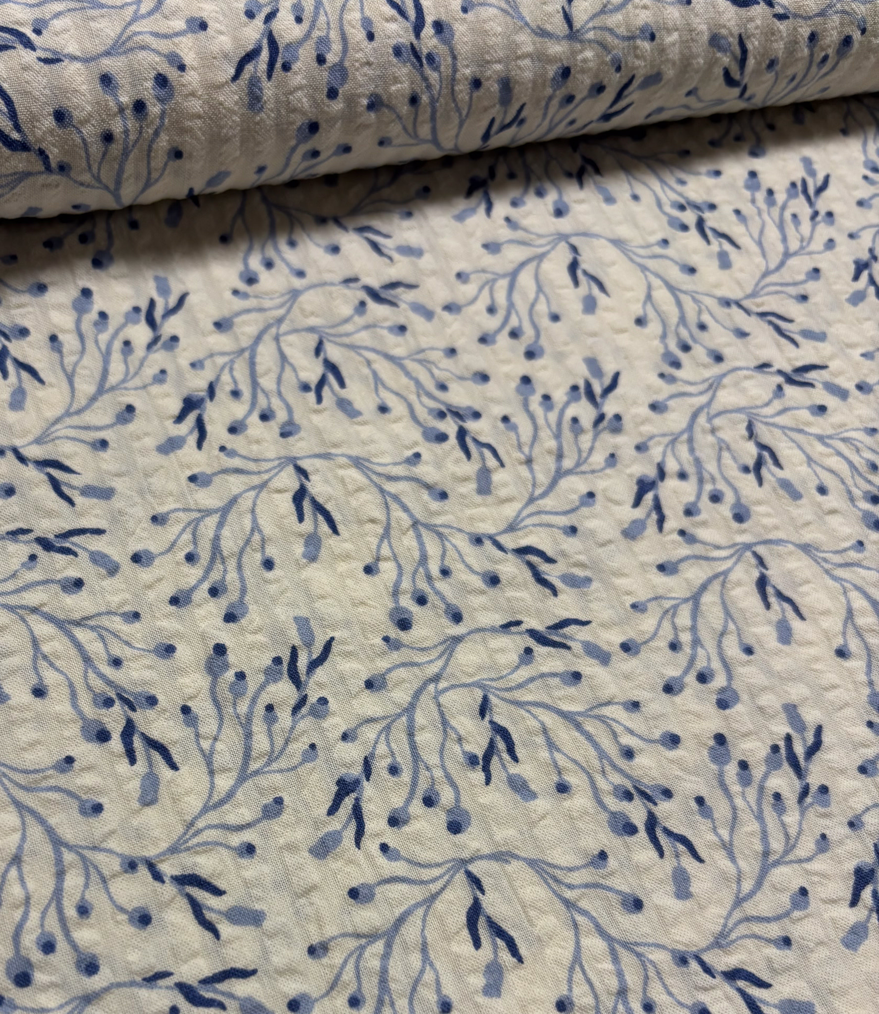 A beautiful seersucker with a print. Perfect for blouses and airy, flowing clothing. OEKO-tex certified.