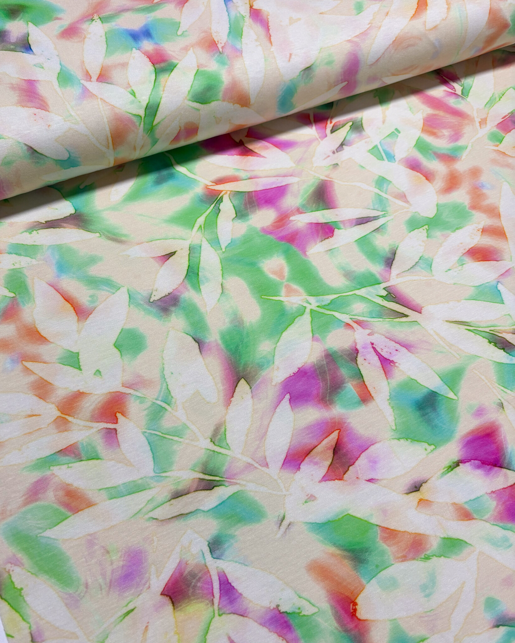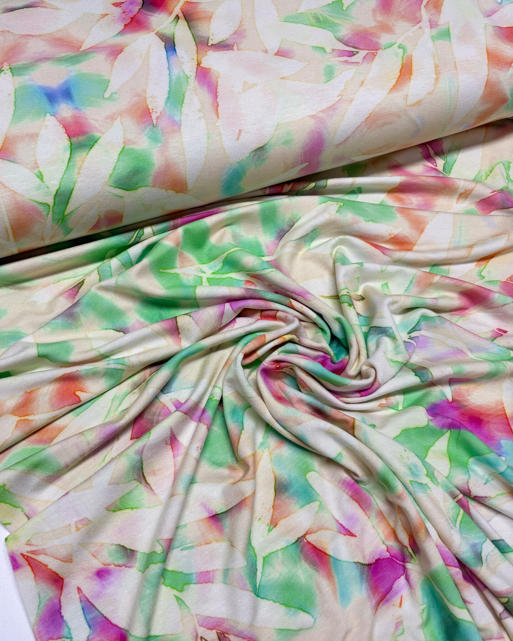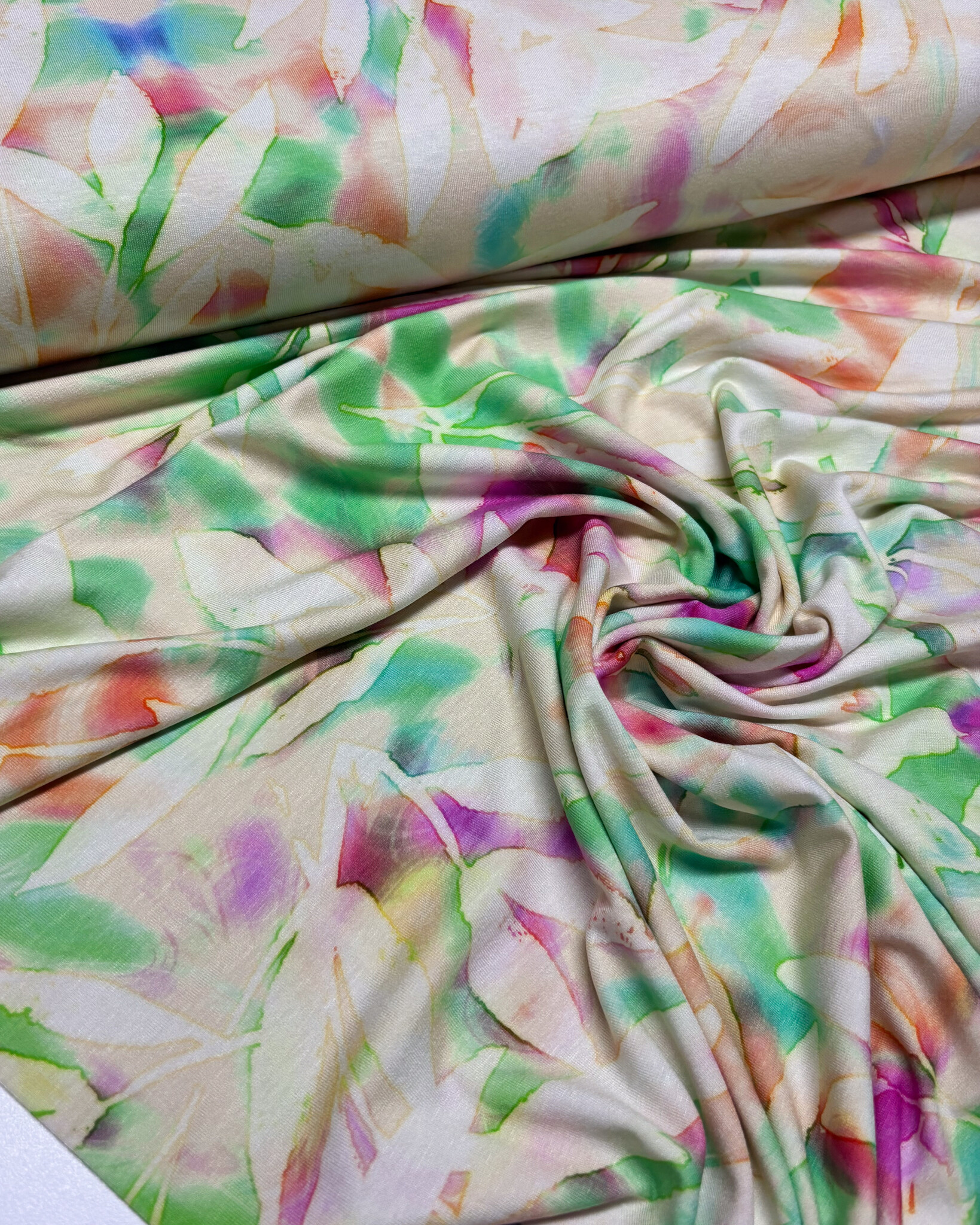 A fine viscose jersey with blossoms. OEKO TEX. Soft and supple fabric, very suitable for T-shirts and sporty dresses for women.