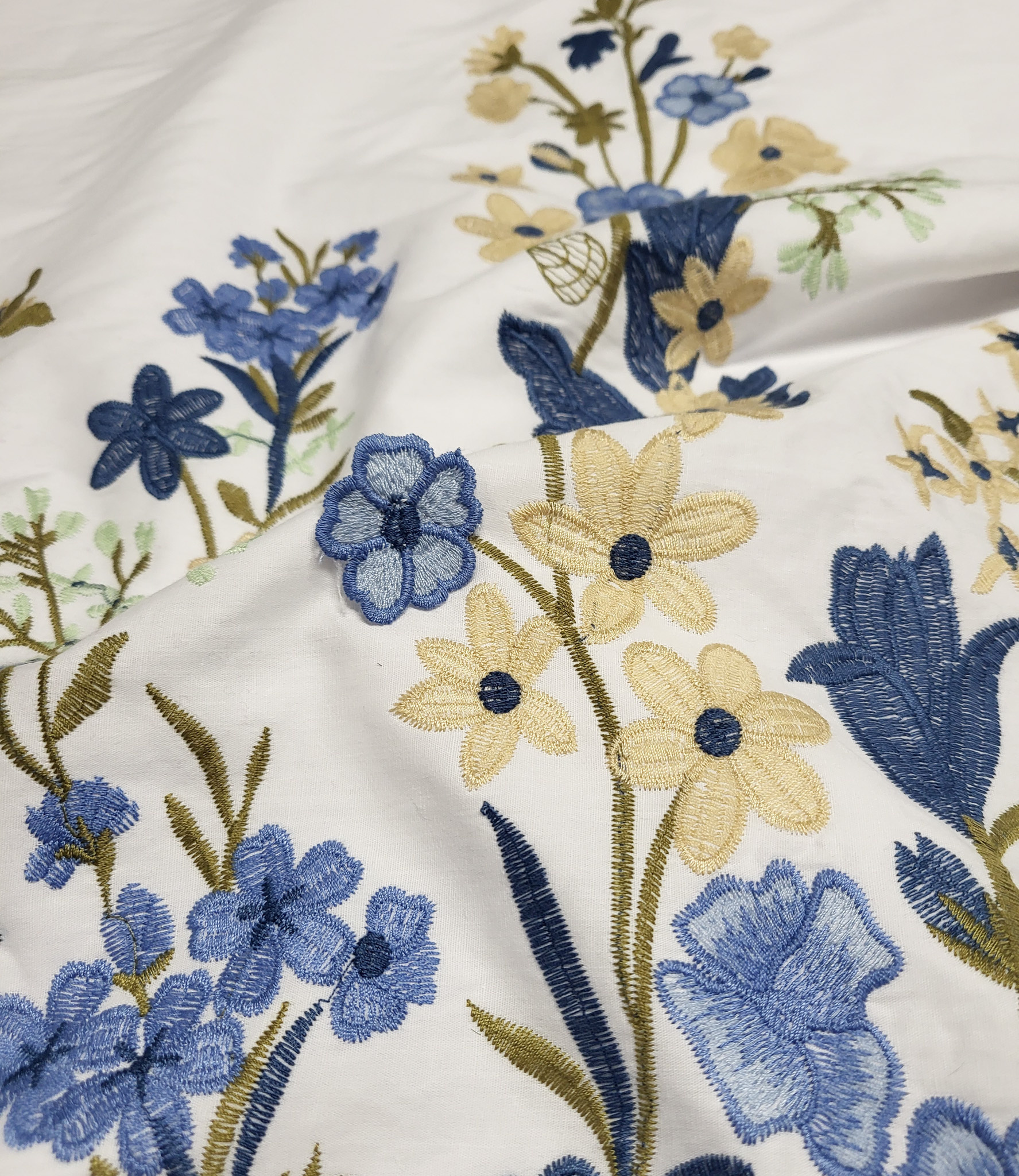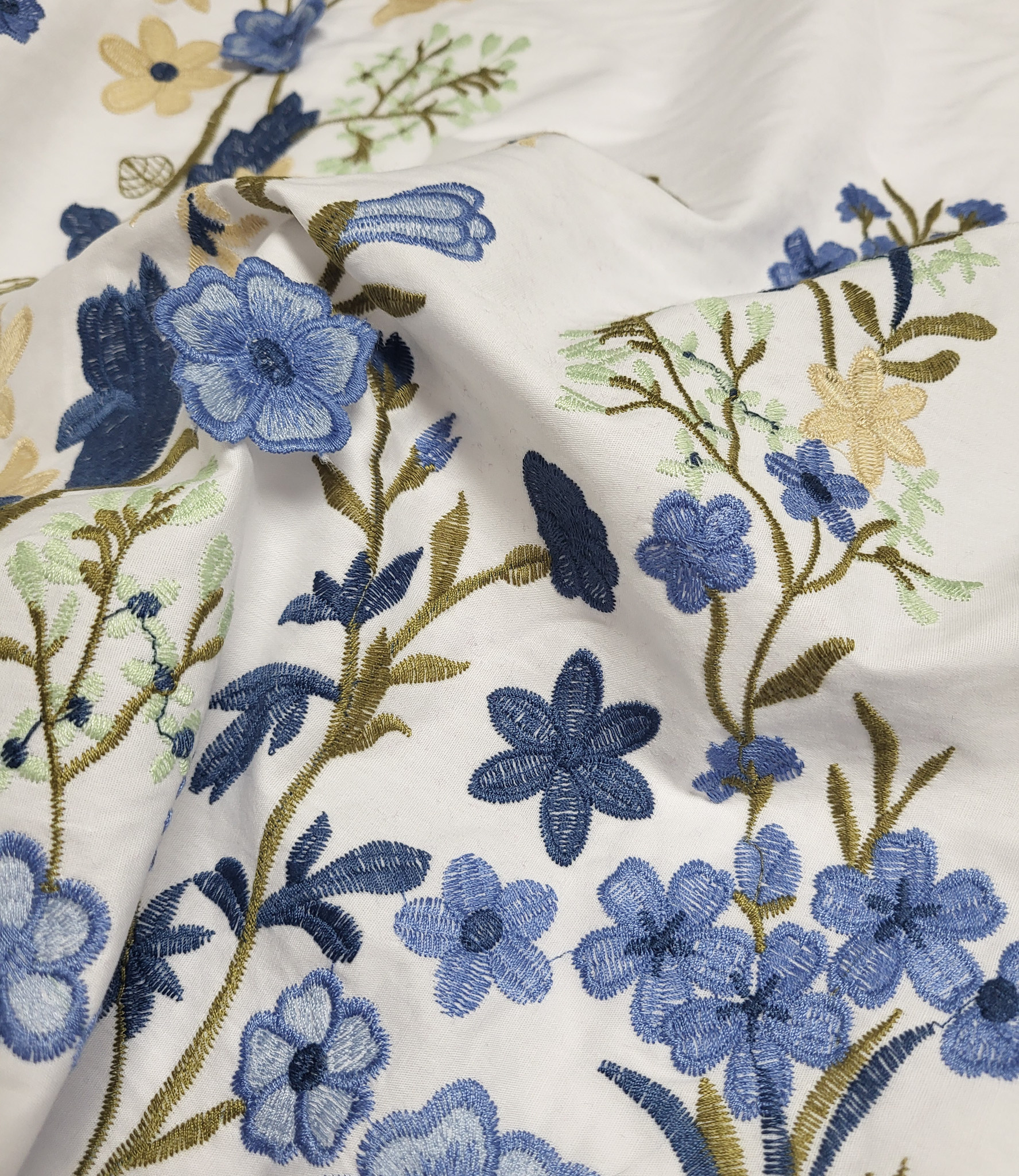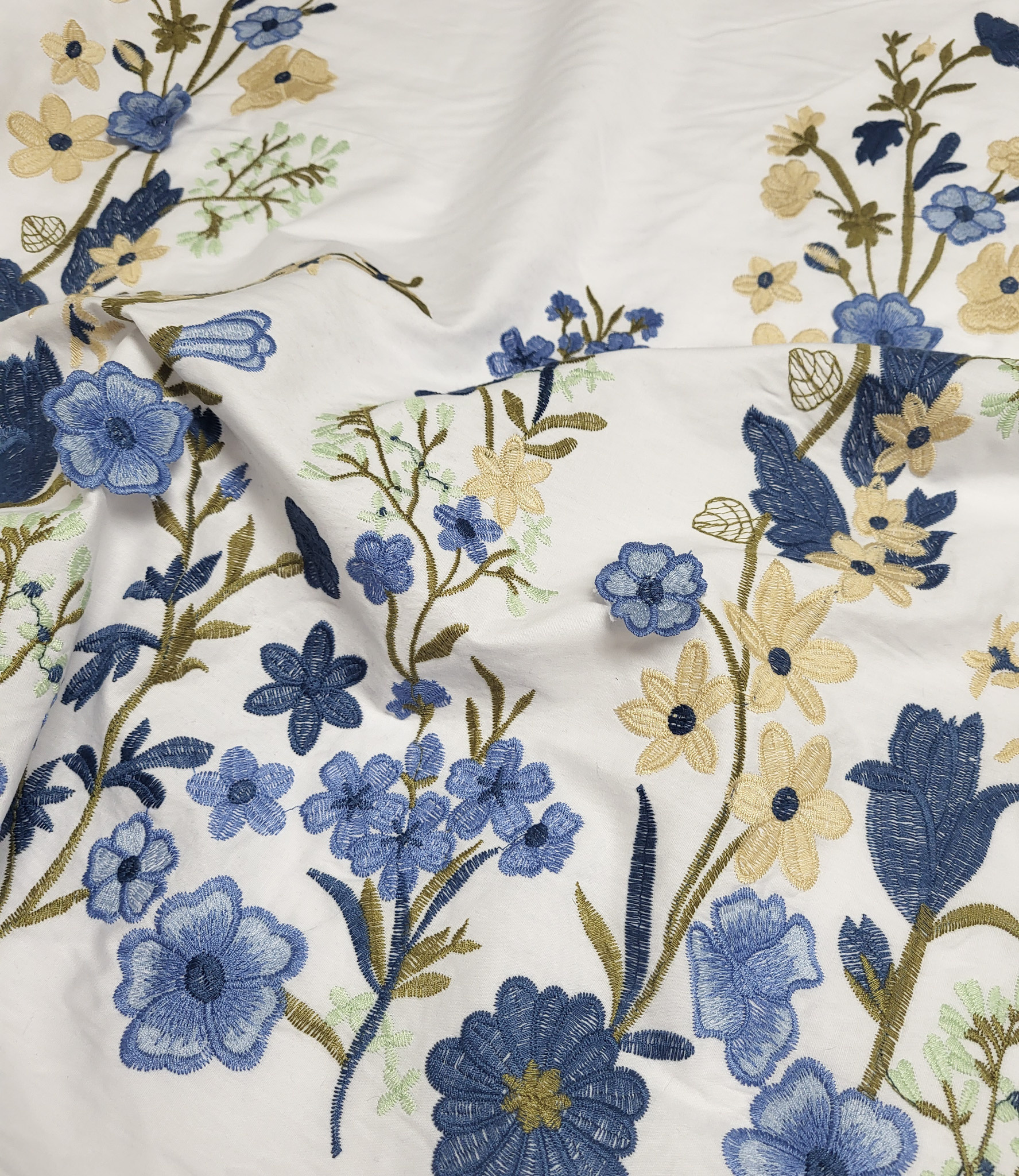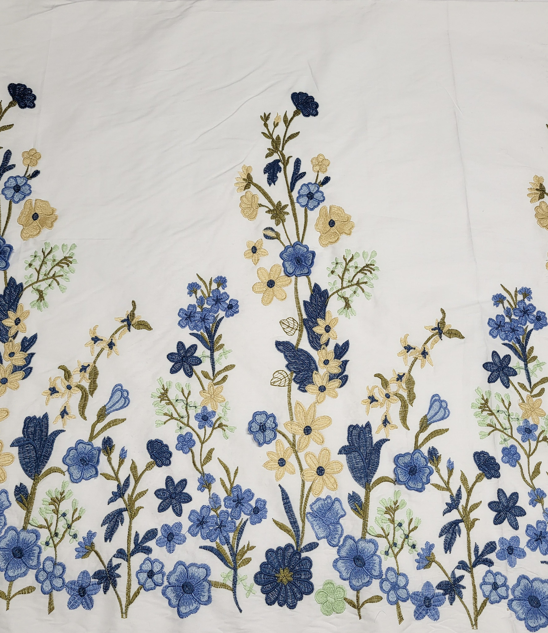 Beautiful, soft, and supple cotton poplin. This fabric is 145 cm wide. The embroidered flowers are on only one selvedge of the fabric, with a maximum height of 50 cm.