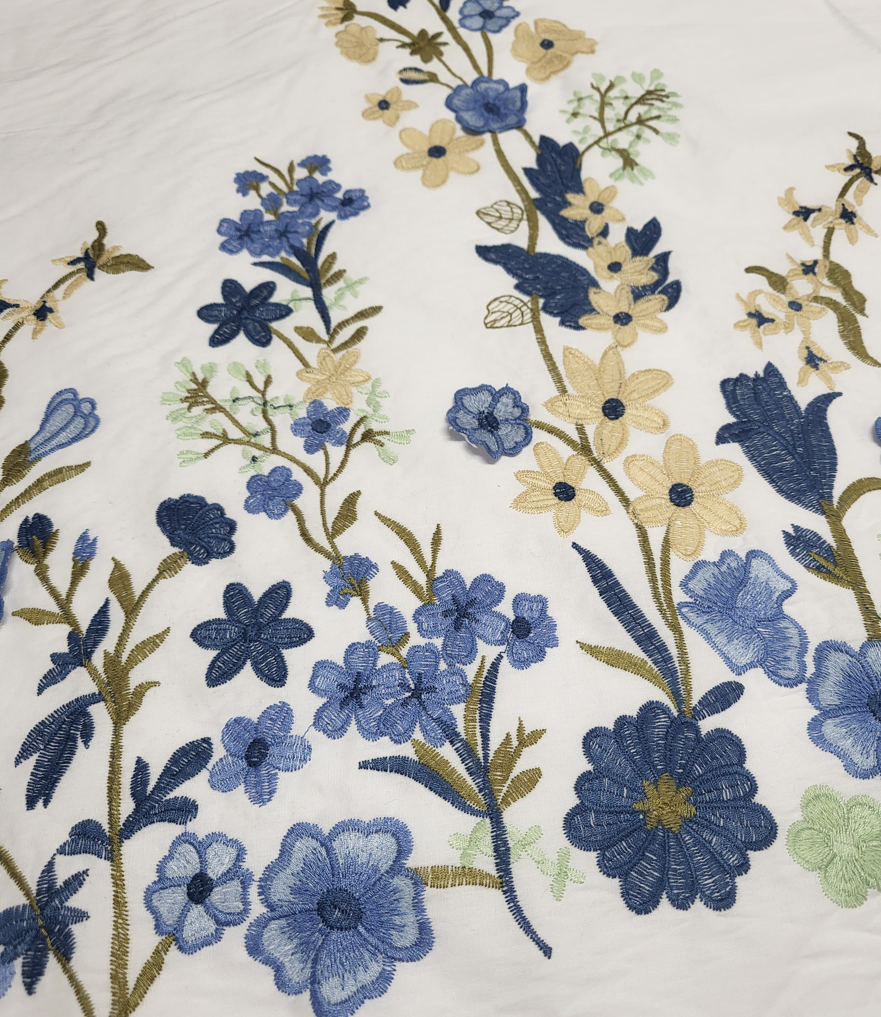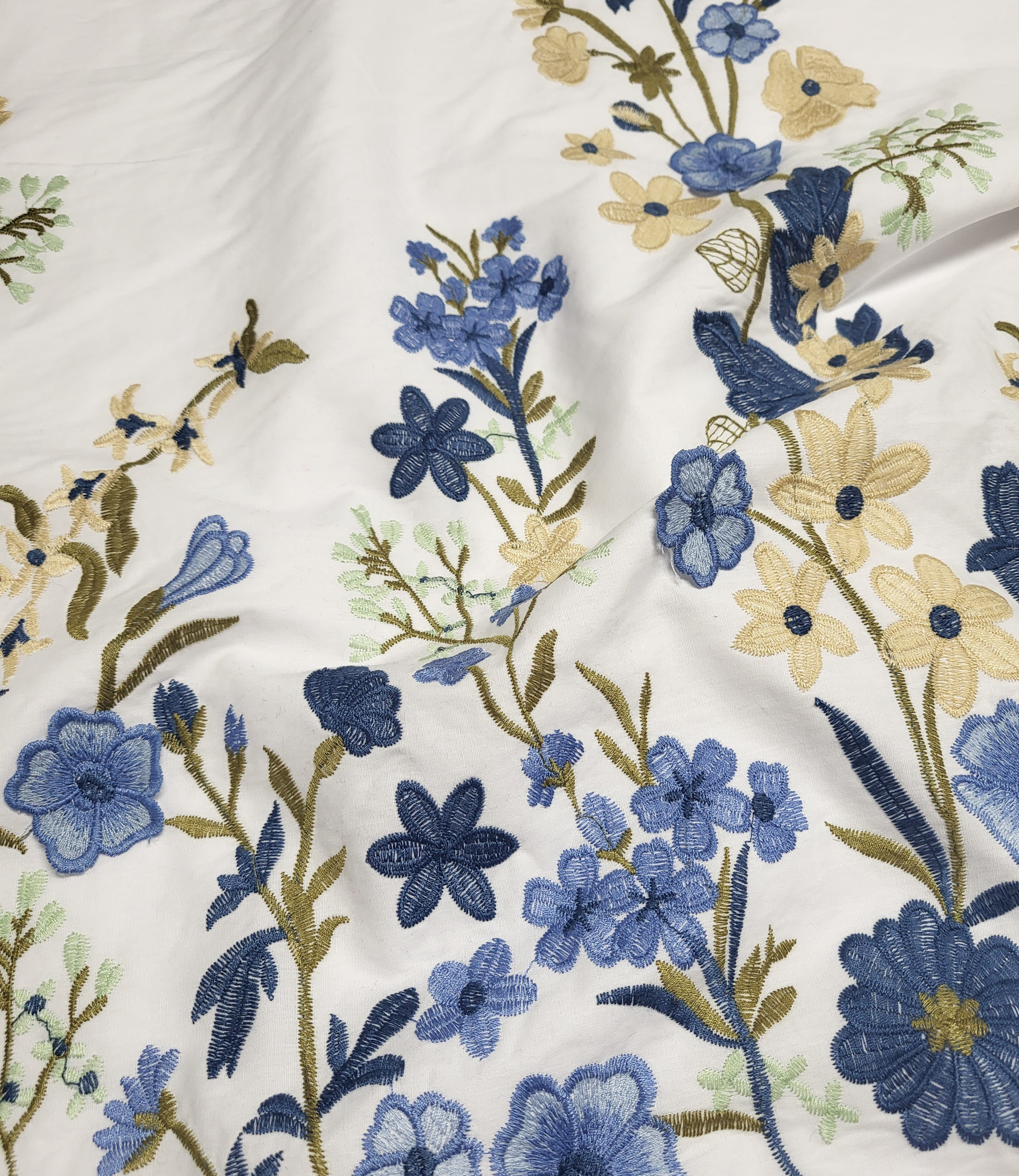 embroidery floral border with 3D flower blue on white poplin - Madeline De Stoffenmadam