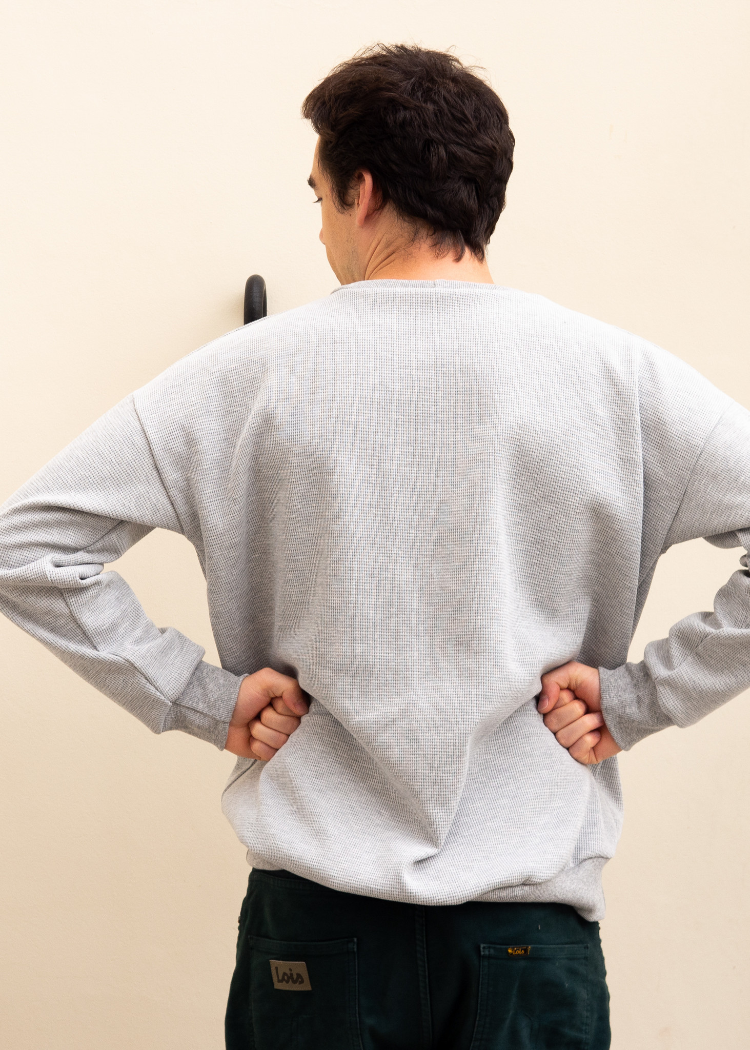 Casper is a sewing pattern for an oversized sweater with a high-low hemband, sleeve cuffs and a neckband. A very easy project with a baggy, cozy sweater as a result. Perfect for sweater fabric, french terry, jogging fabric, knits, nicky velours, …