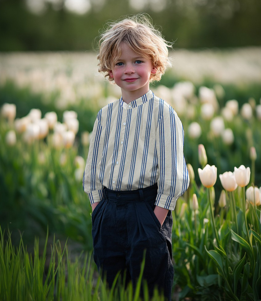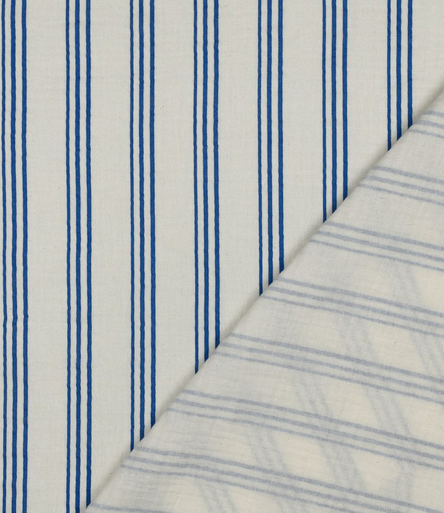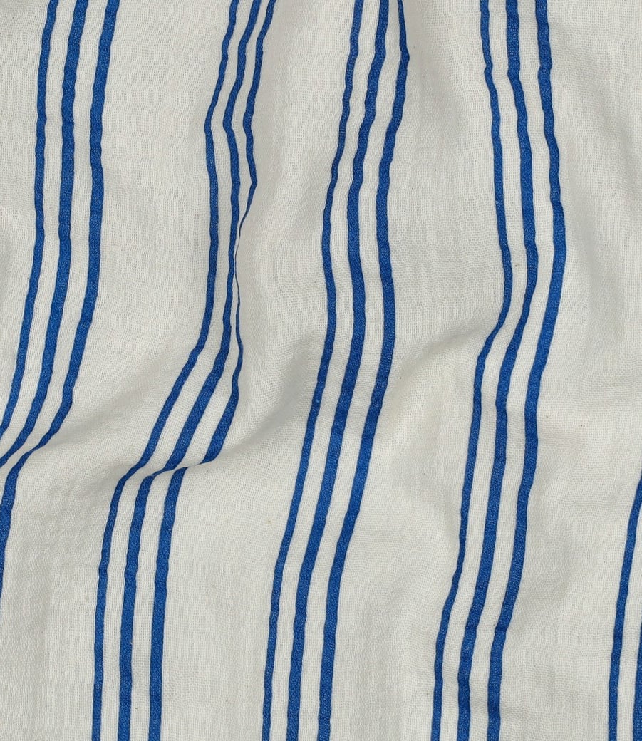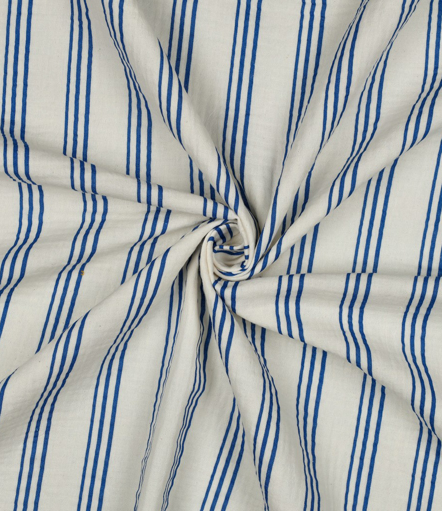Beautiful quality double gauze with cobalt blue stripes. Perfect for dresses, tops, T-shirts, and baby and children's items (nests, blankets, etc.). Wonderfully soft. OEKO-Tex certified.