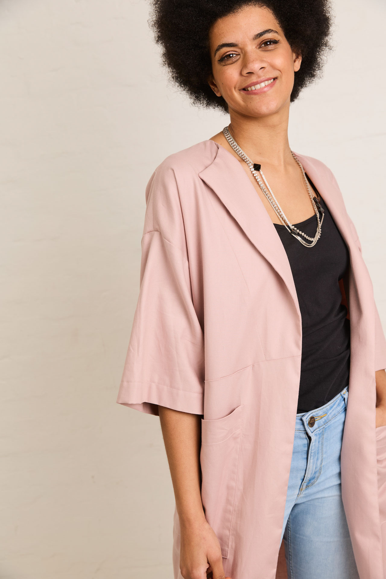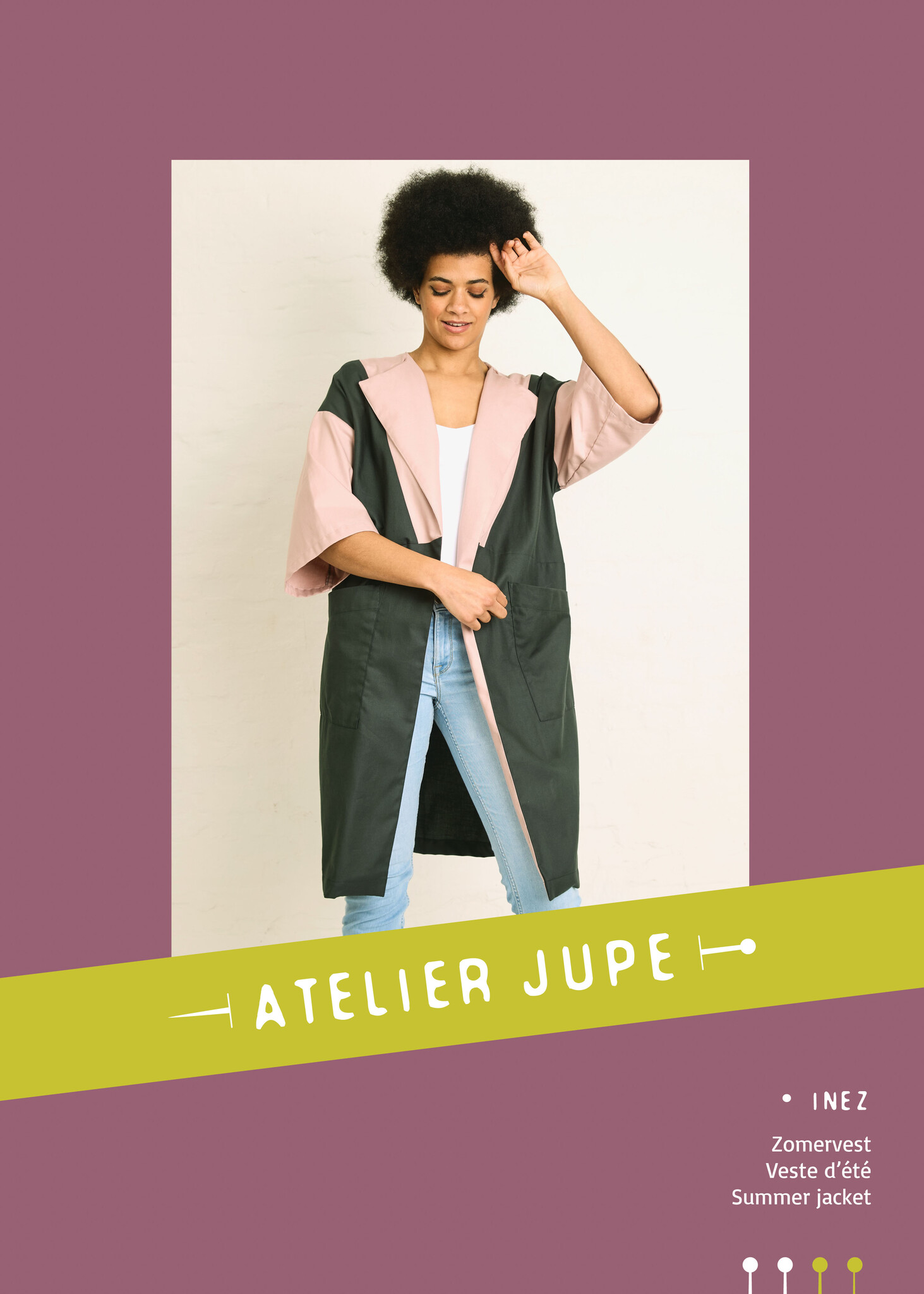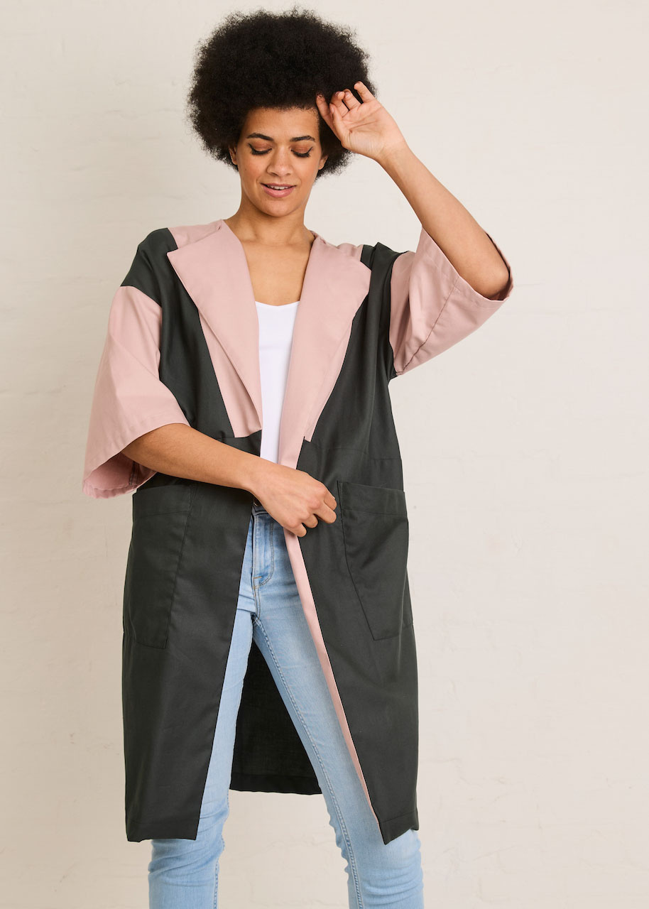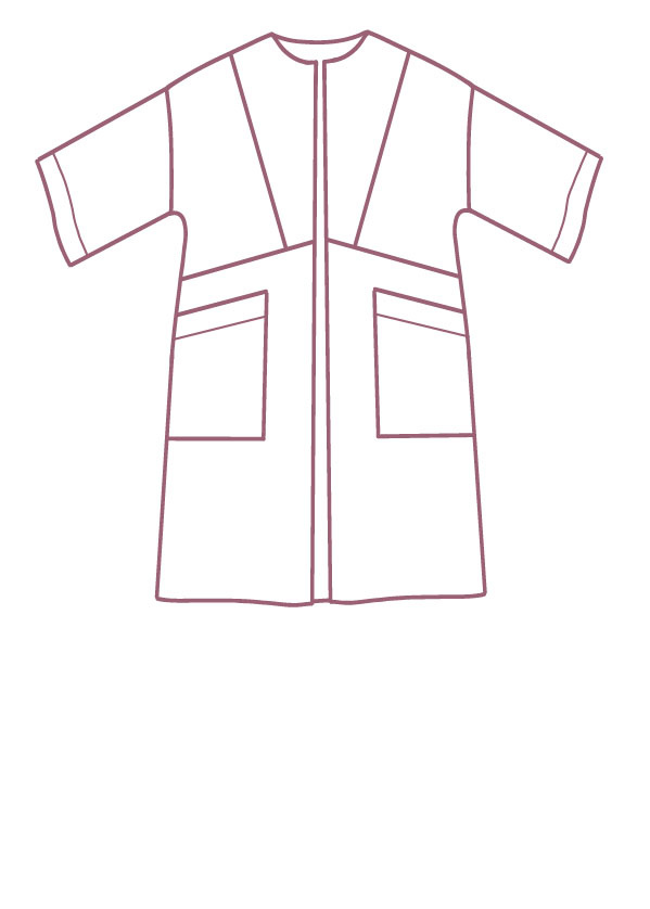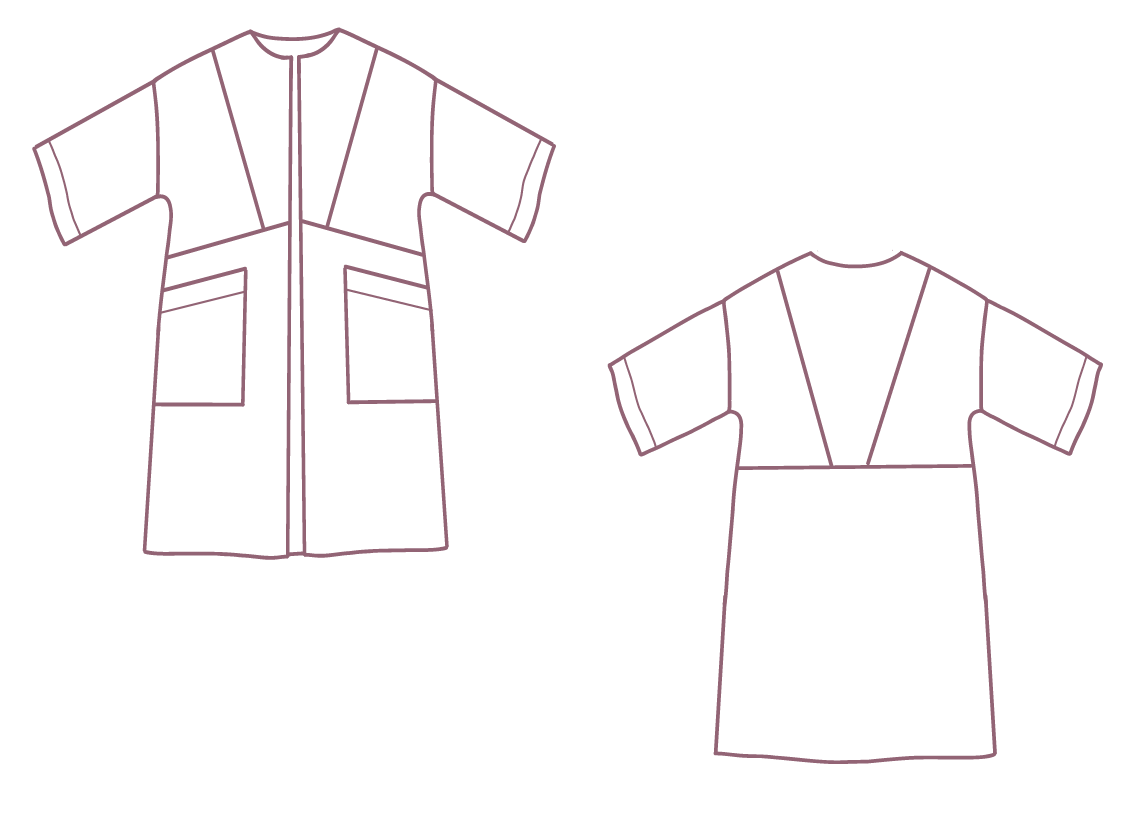 Inez is a summer cardigan that is easy to put on and combines very nicely with jeans and a top. The geometric surfaces at the front and back give you the option of a nice color block. The pattern lends itself to plain fabrics, but you can also make it in a print for a kimono-inspired garment. Inez has large, patch pockets and a subtle wrap-over collar. The cut sleeves are medium length and wide.