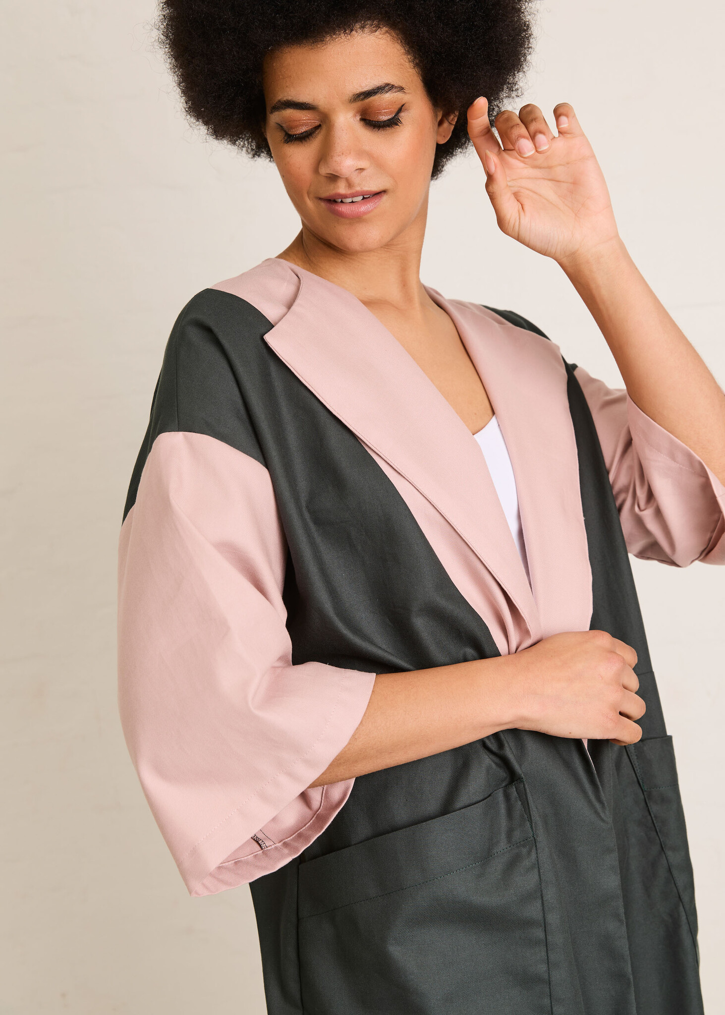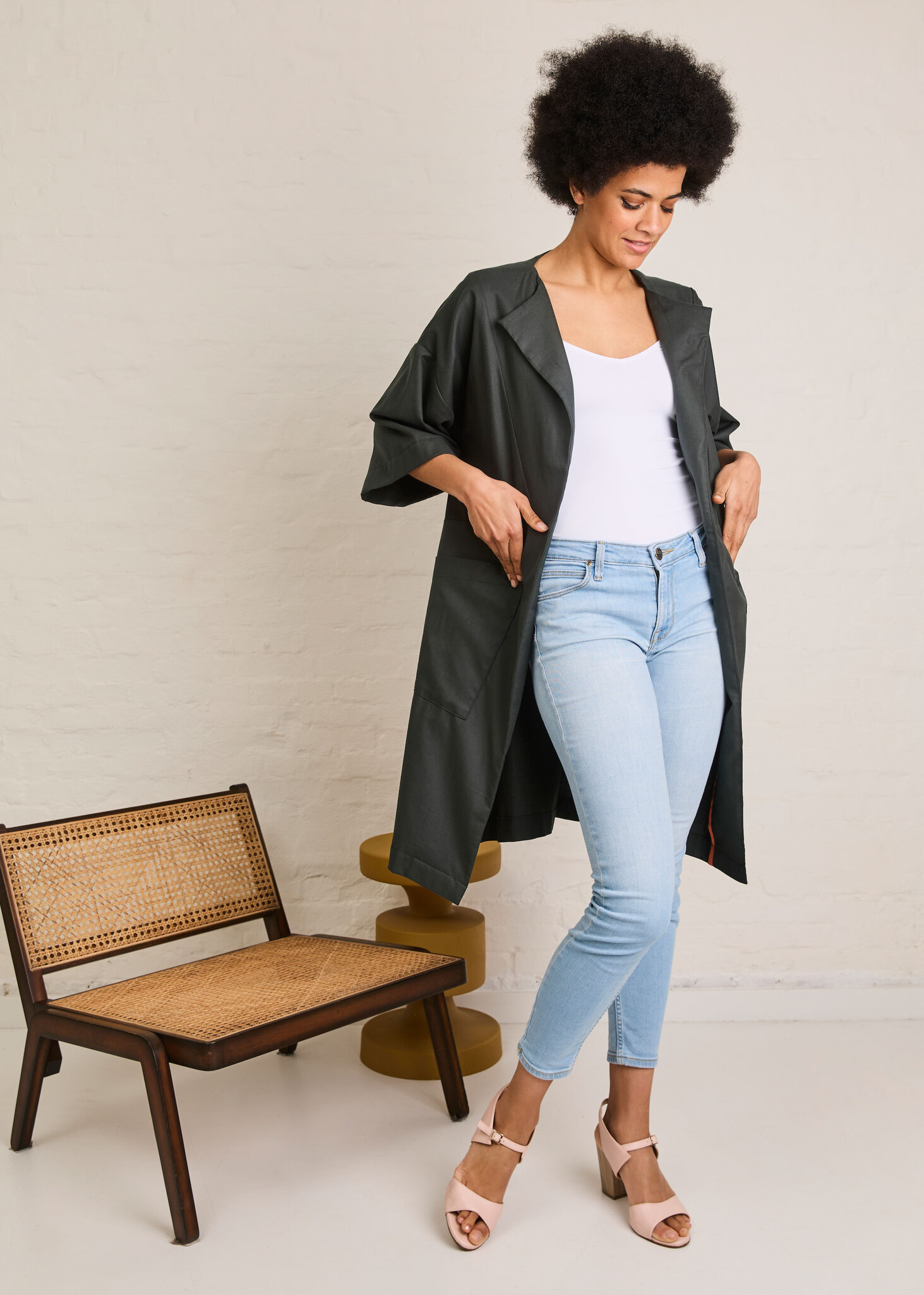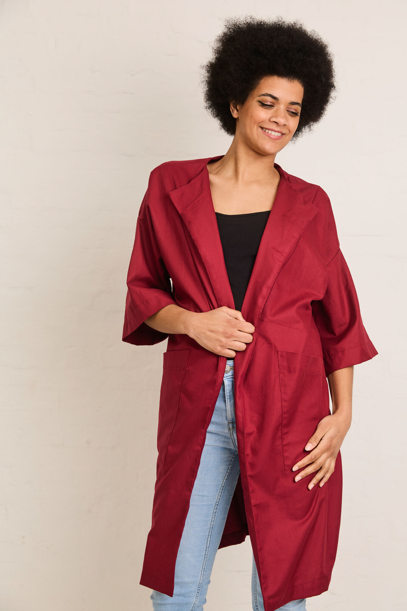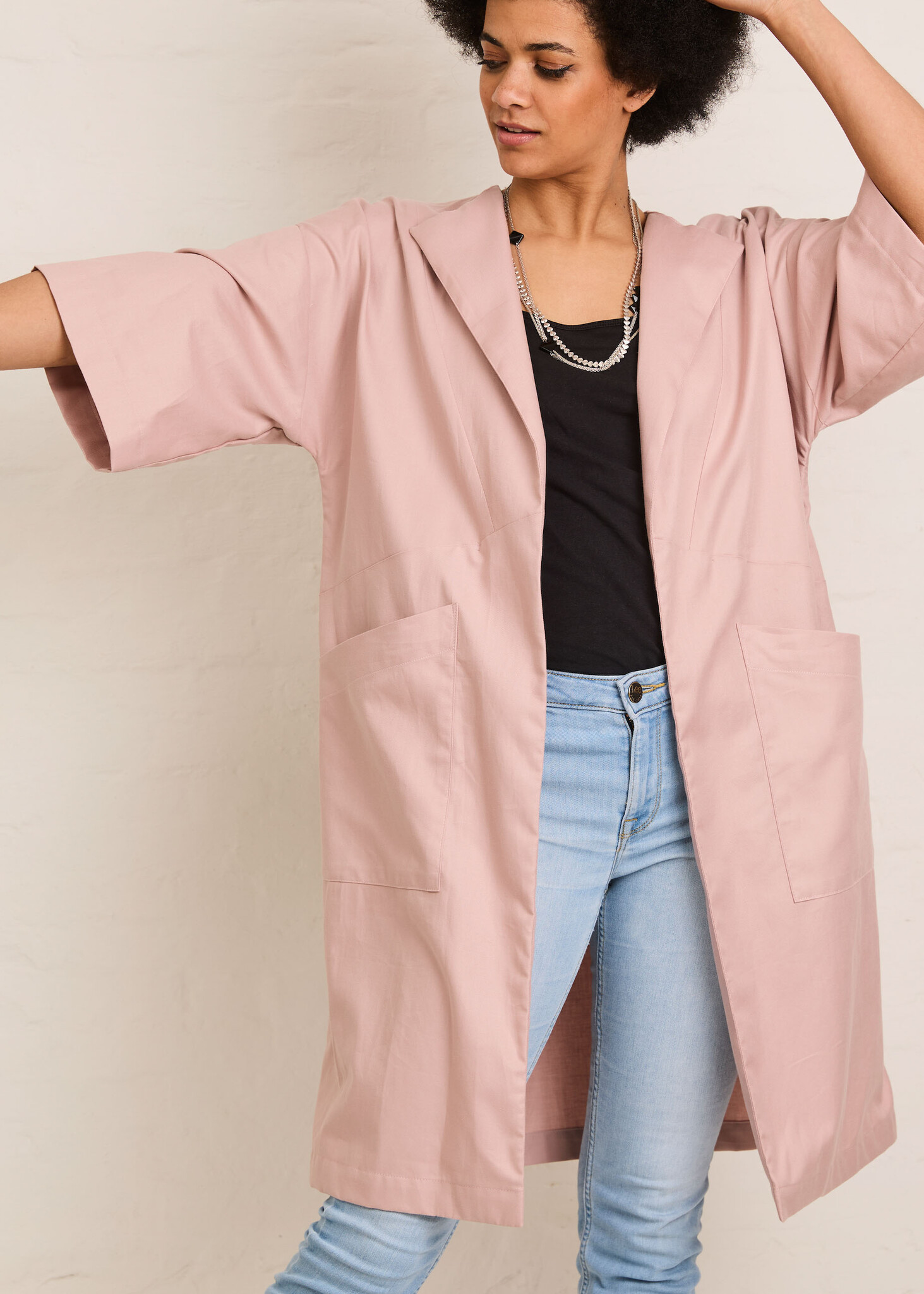 Inez is a summer cardigan that is easy to put on and combines very nicely with jeans and a top. The geometric surfaces at the front and back give you the option of a nice color block. The pattern lends itself to plain fabrics, but you can also make it in a print for a kimono-inspired garment. Inez has large, patch pockets and a subtle wrap-over collar. The cut sleeves are medium length and wide.
