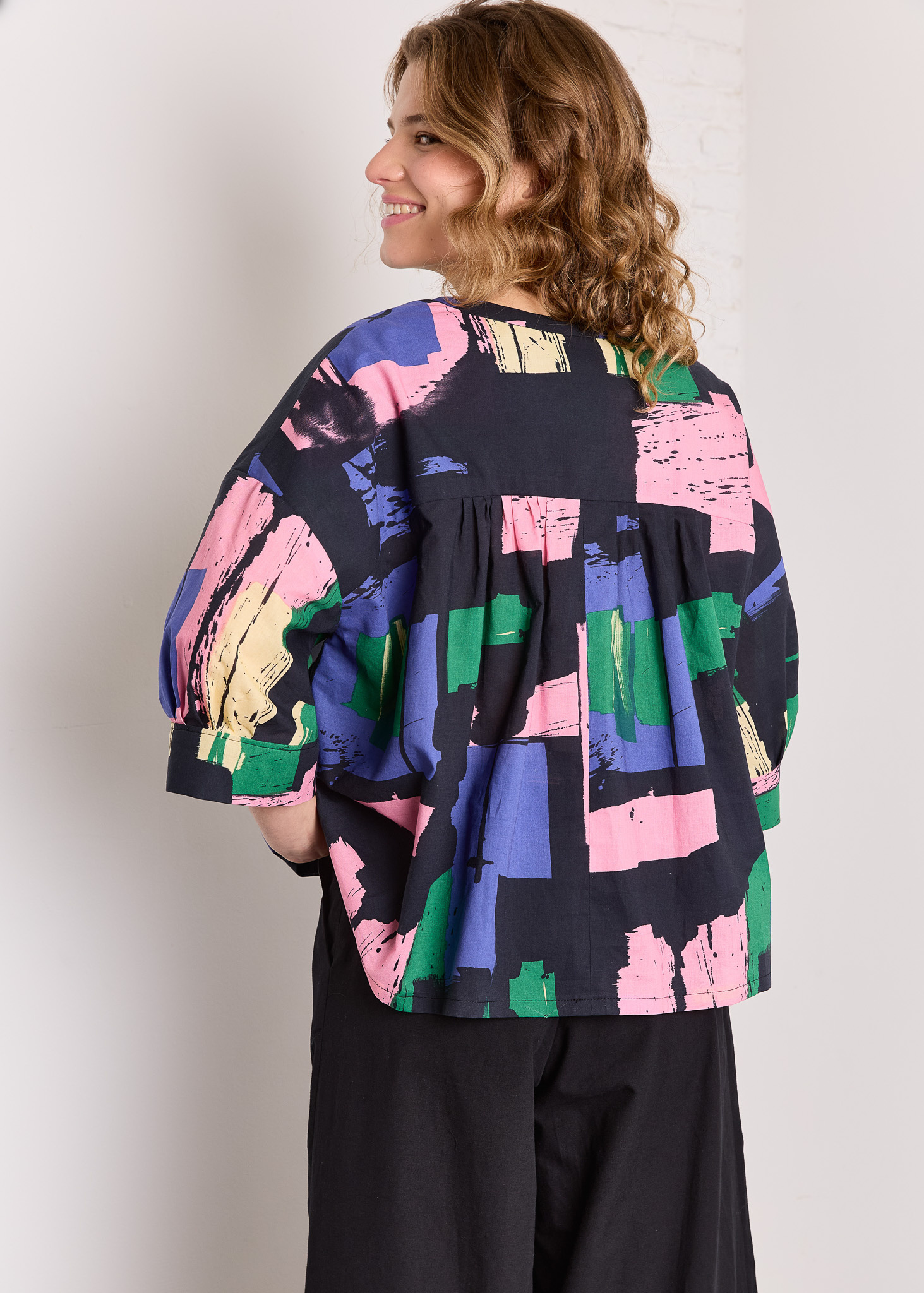 There are two options for the back: choose small pleats for an even more relaxed, oversized look, or choose a single pleat in the middle for a less wide fit. The small collar completes the neckline.