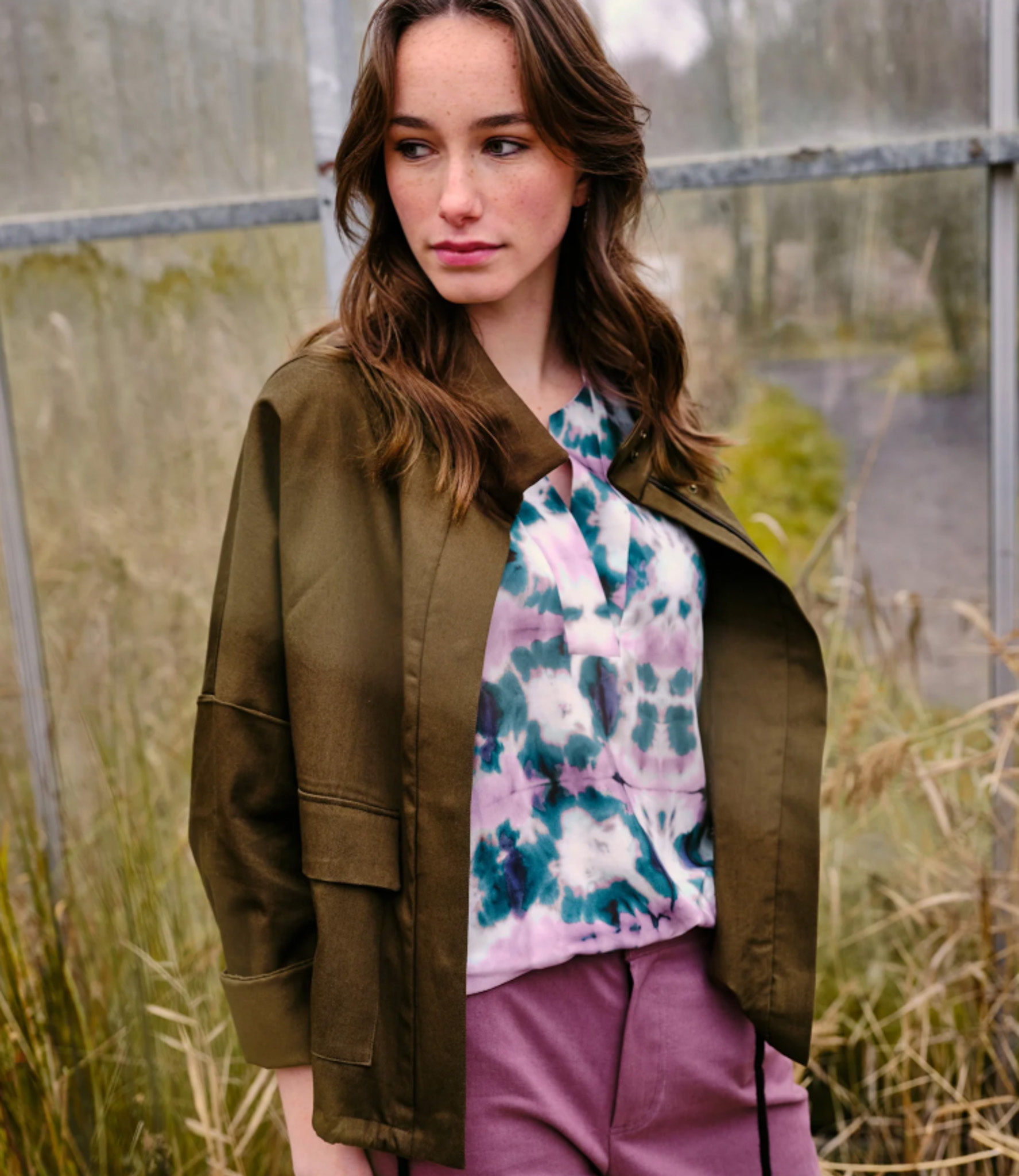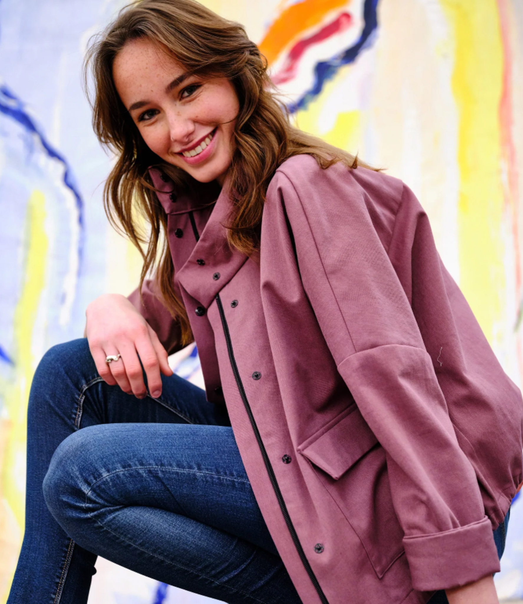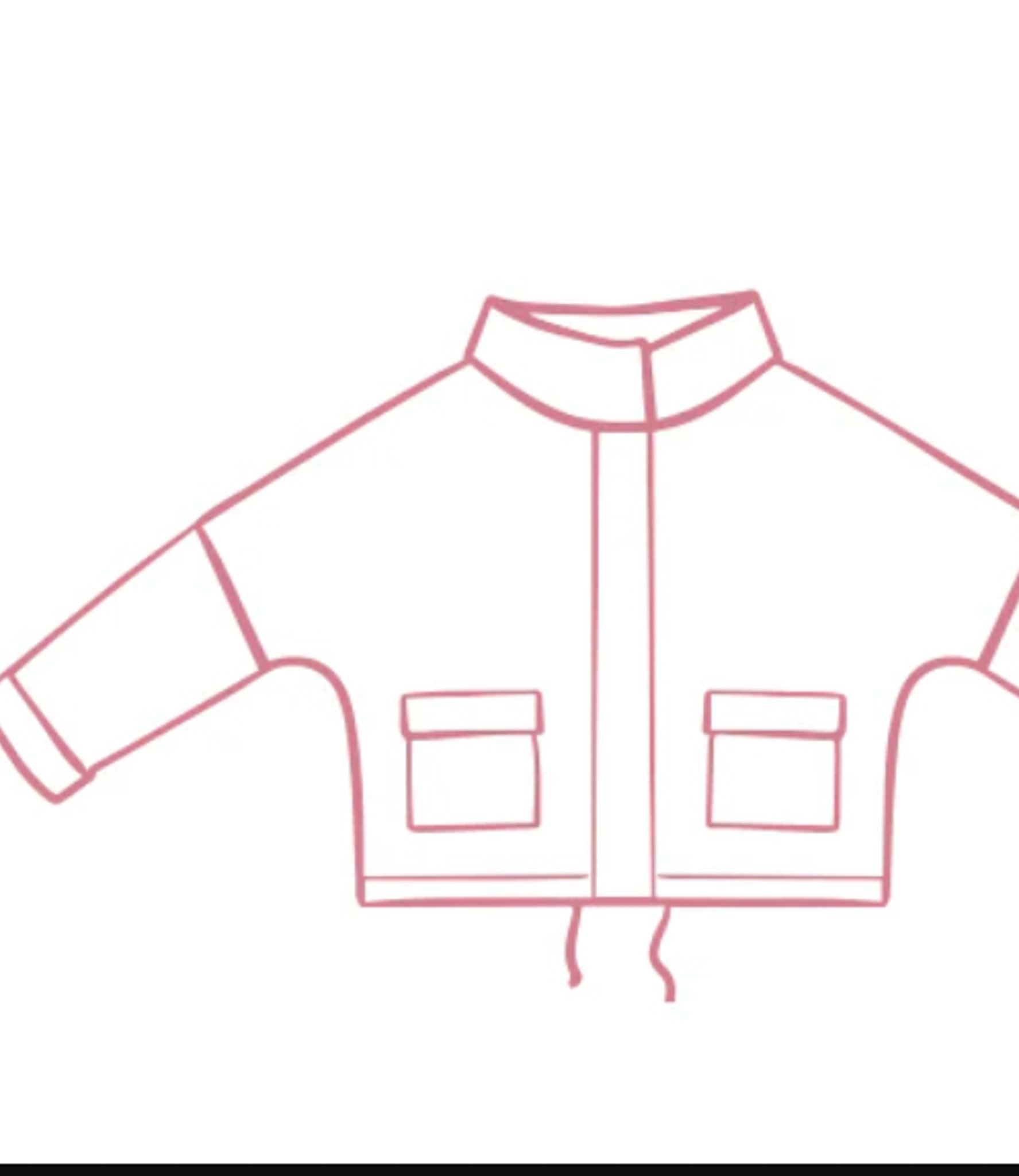 Grace is a modern summer jacket that can be worn both indoors and outdoors! This pattern features a dropped shoulder with a fitted sleeve, a straight, slightly wider collar, and a zipper hidden under a panel. The panel not only adds a nice detail to the back but also creates a beautiful finish on the inside. The tie belt and flap pockets complete the look! And if you want a more rugged look, simply roll up the sleeves!