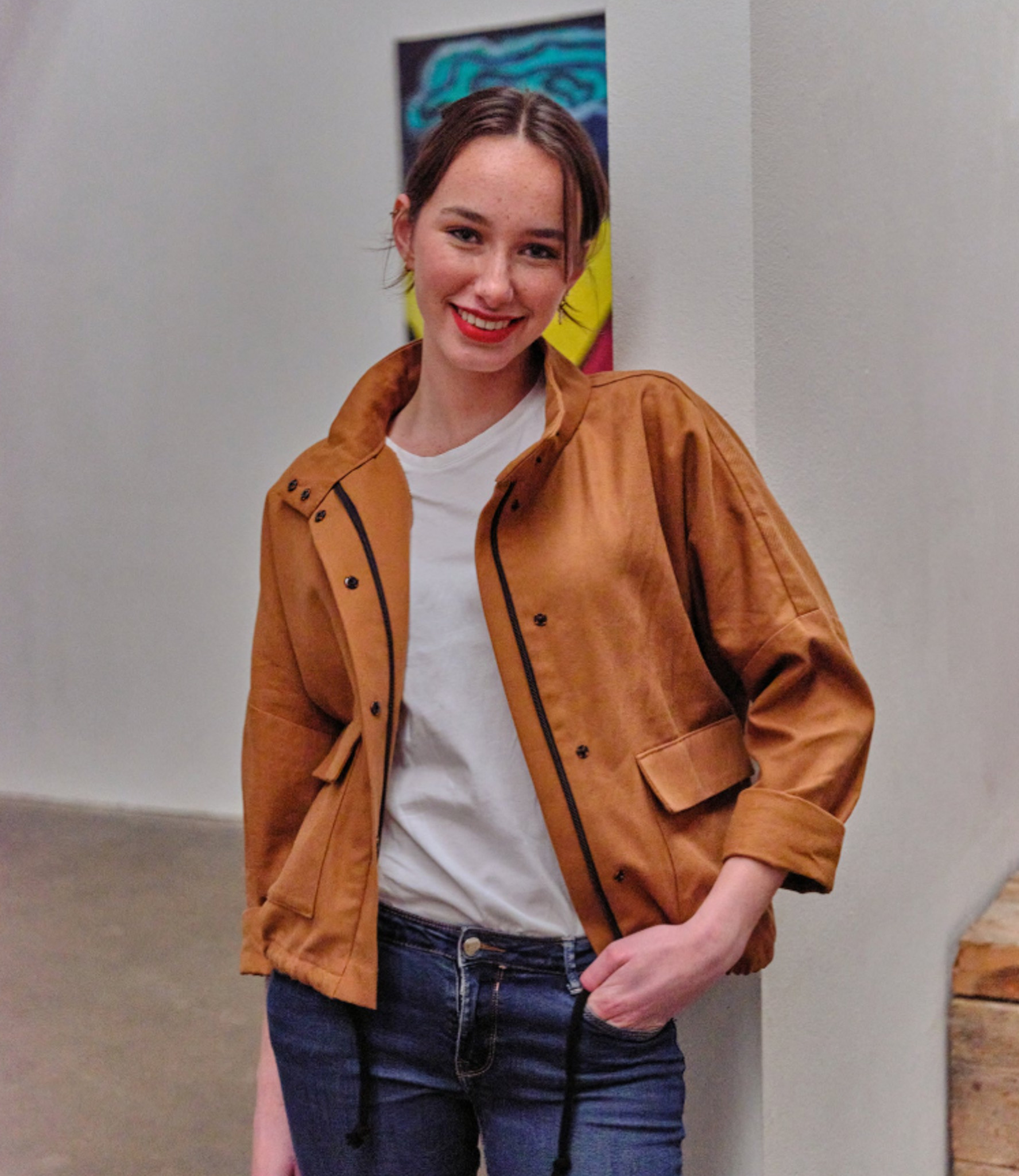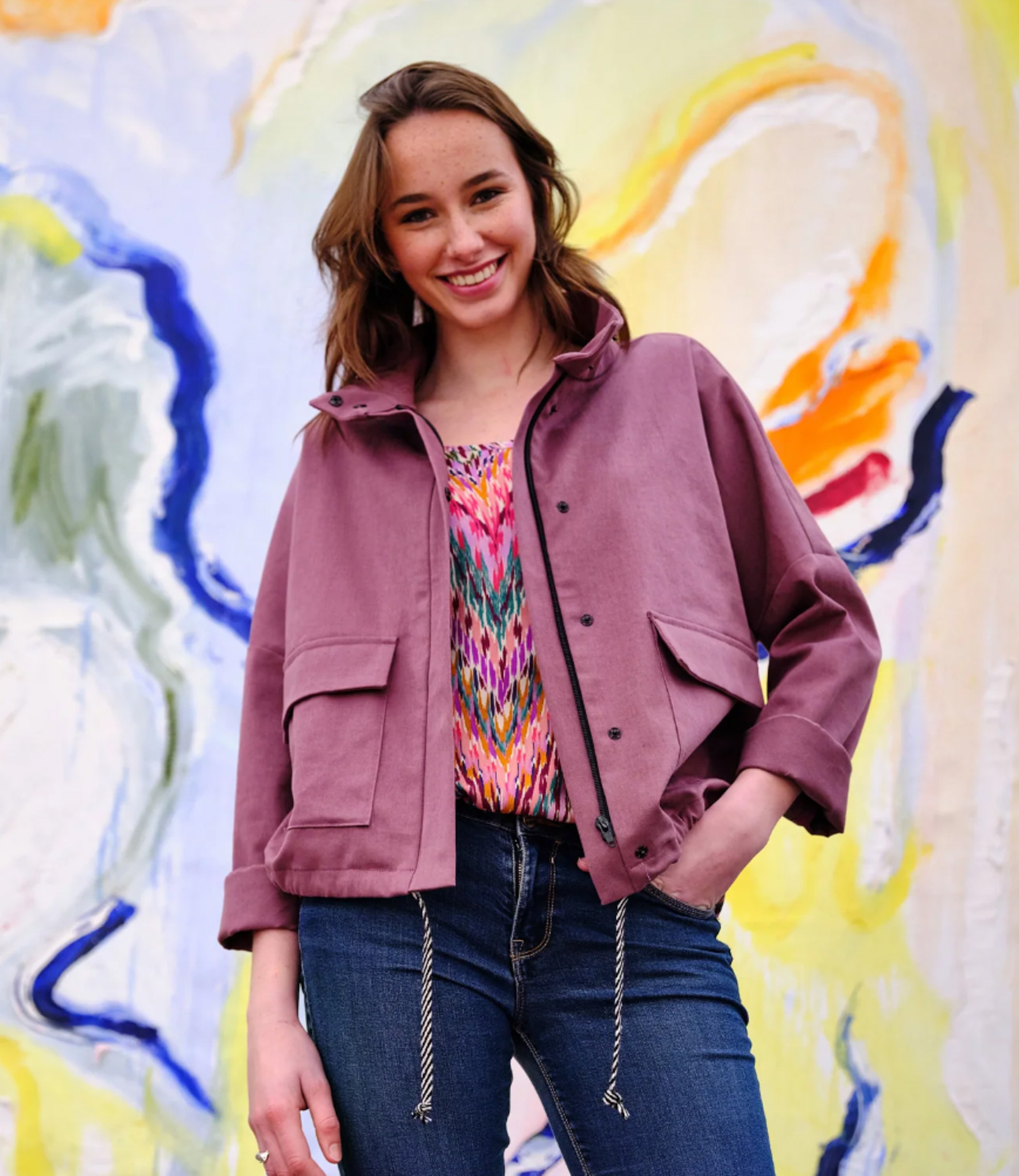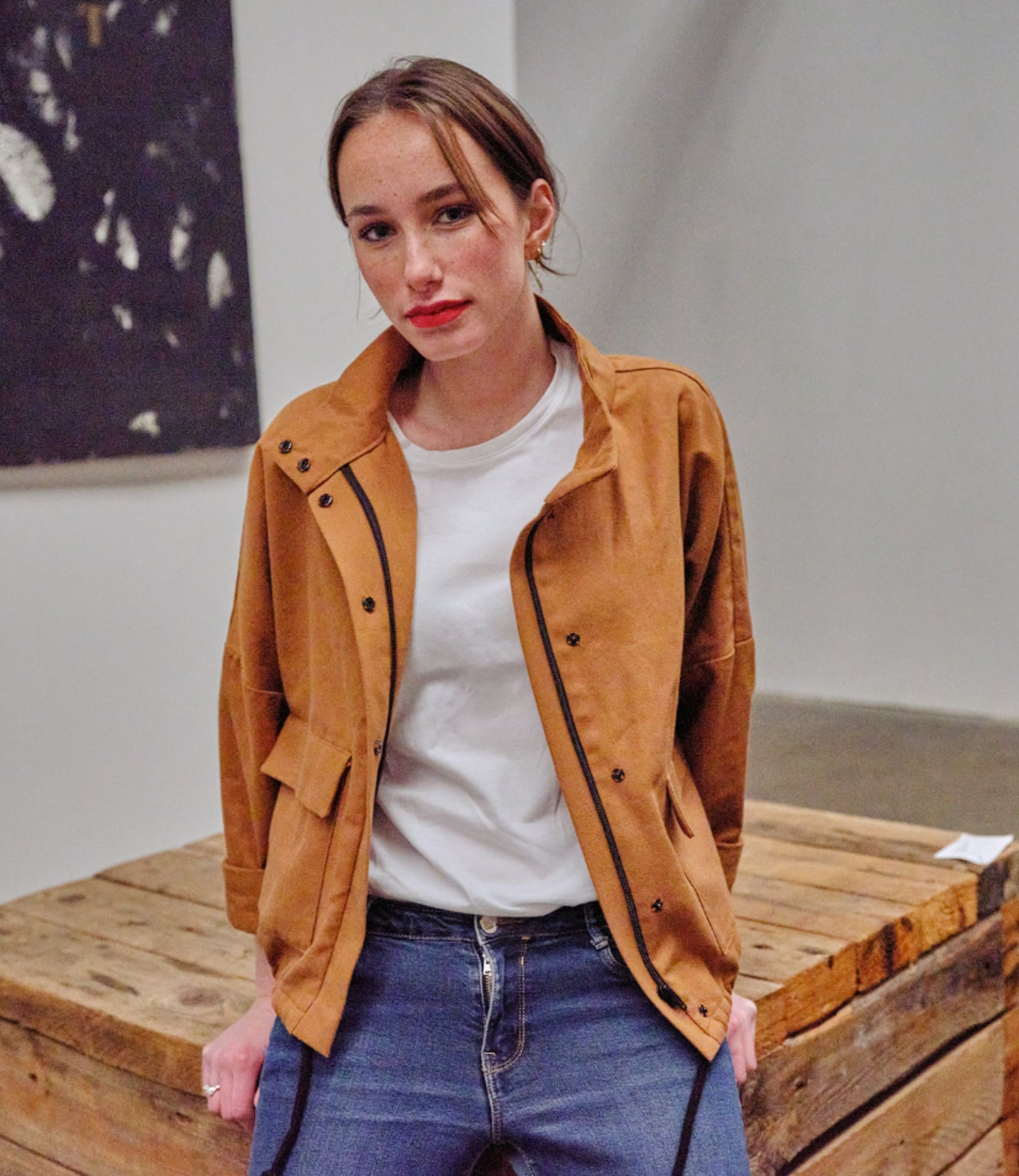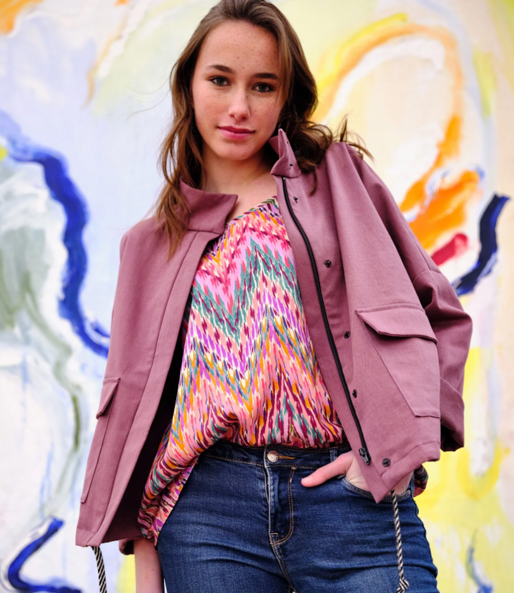 Grace is a modern summer jacket that can be worn both indoors and outdoors! This pattern features a dropped shoulder with a fitted sleeve, a straight, slightly wider collar, and a zipper hidden under a panel. The panel not only adds a nice detail to the back but also creates a beautiful finish on the inside. The tie belt and flap pockets complete the look! And if you want a more rugged look, simply roll up the sleeves!