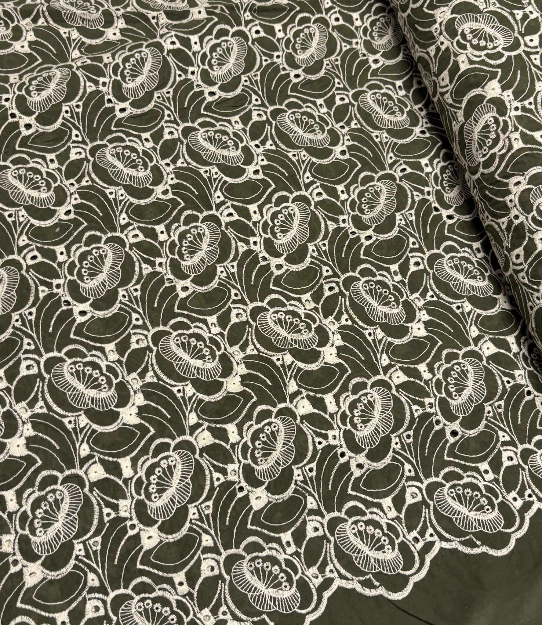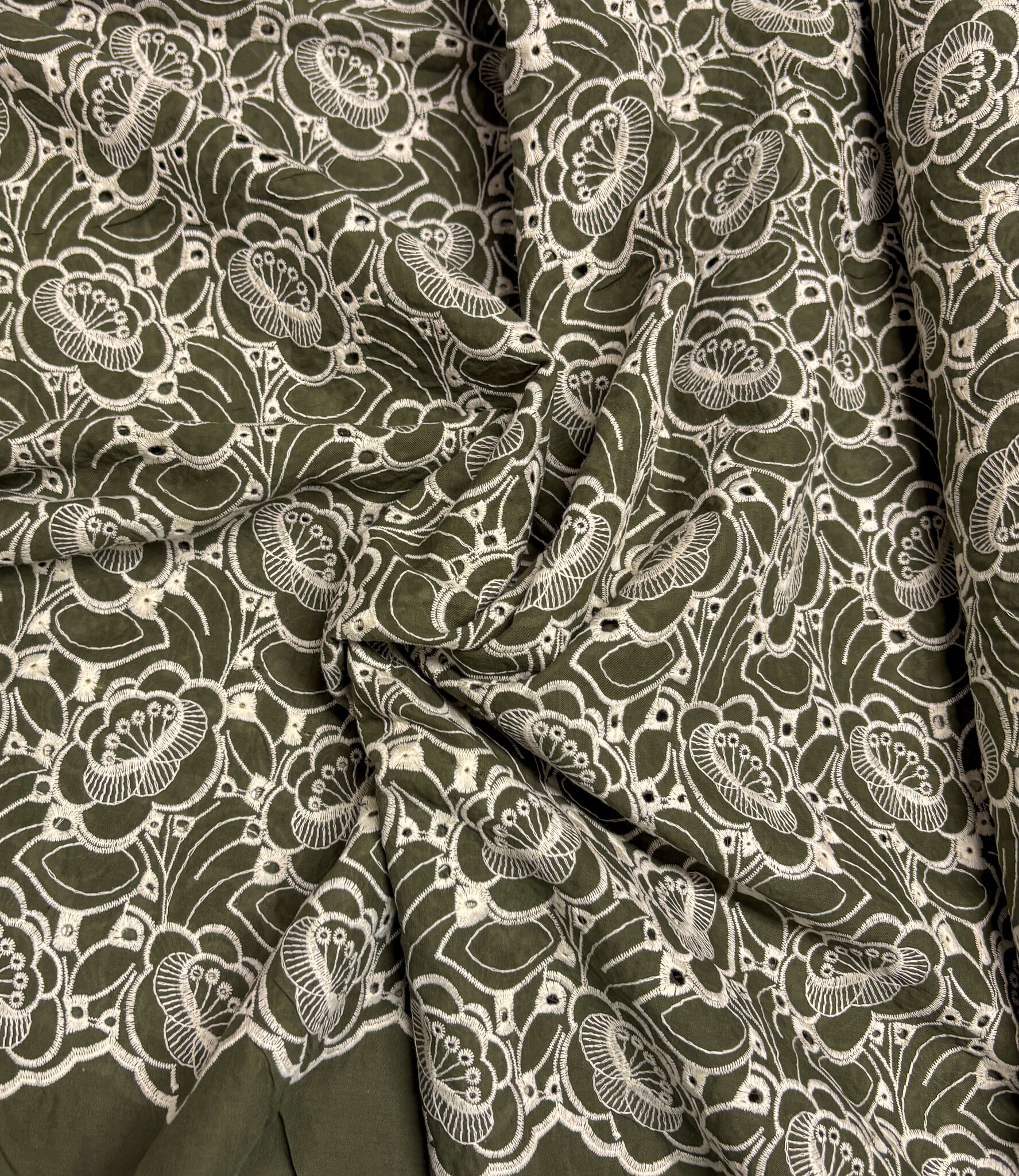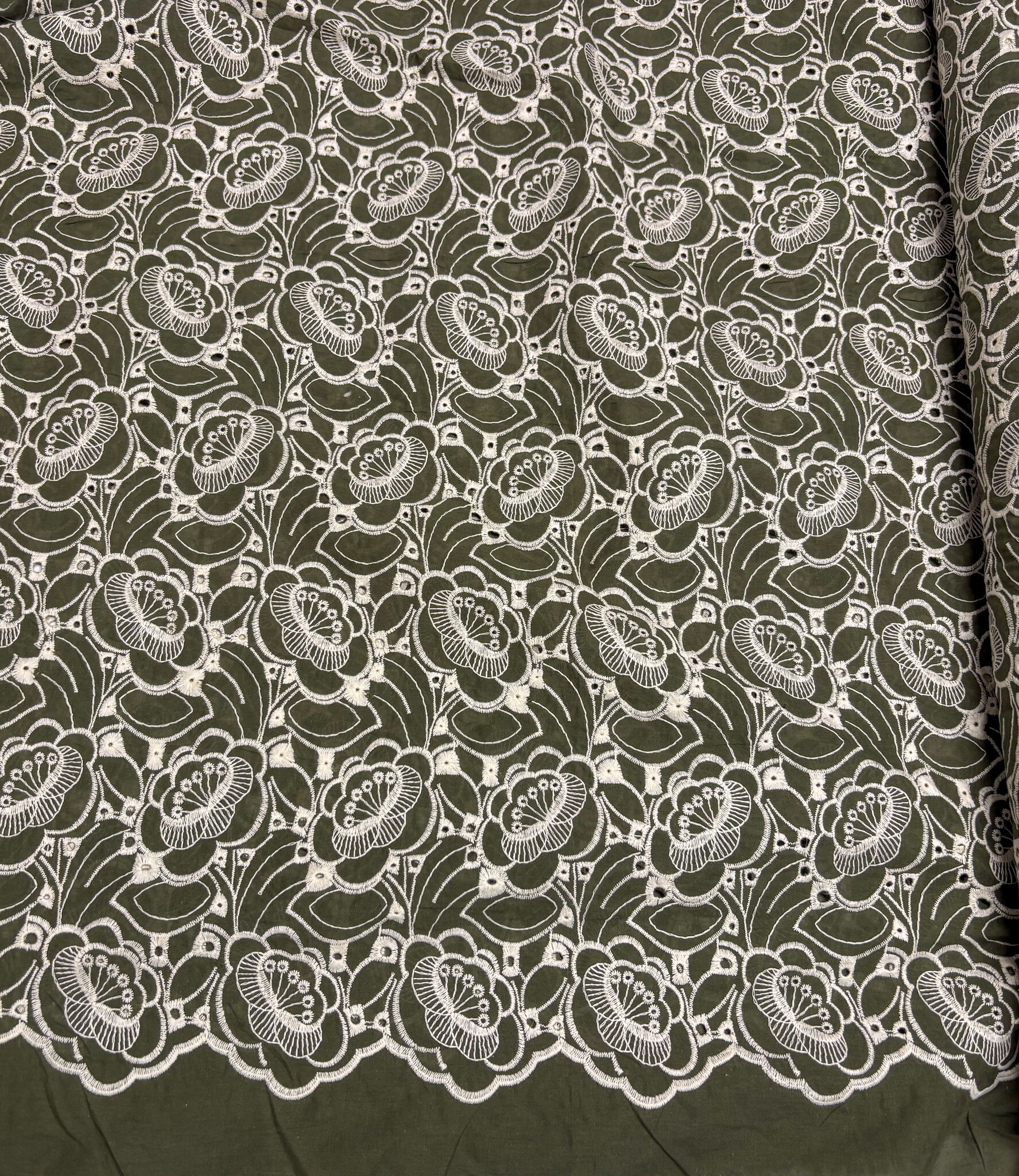 A beautiful cotton with embroidered flowers. We recommend using this fabric width-wise rather than length-wise. It's perfect for airy blouses and dresses. Scalloped edges are also available.