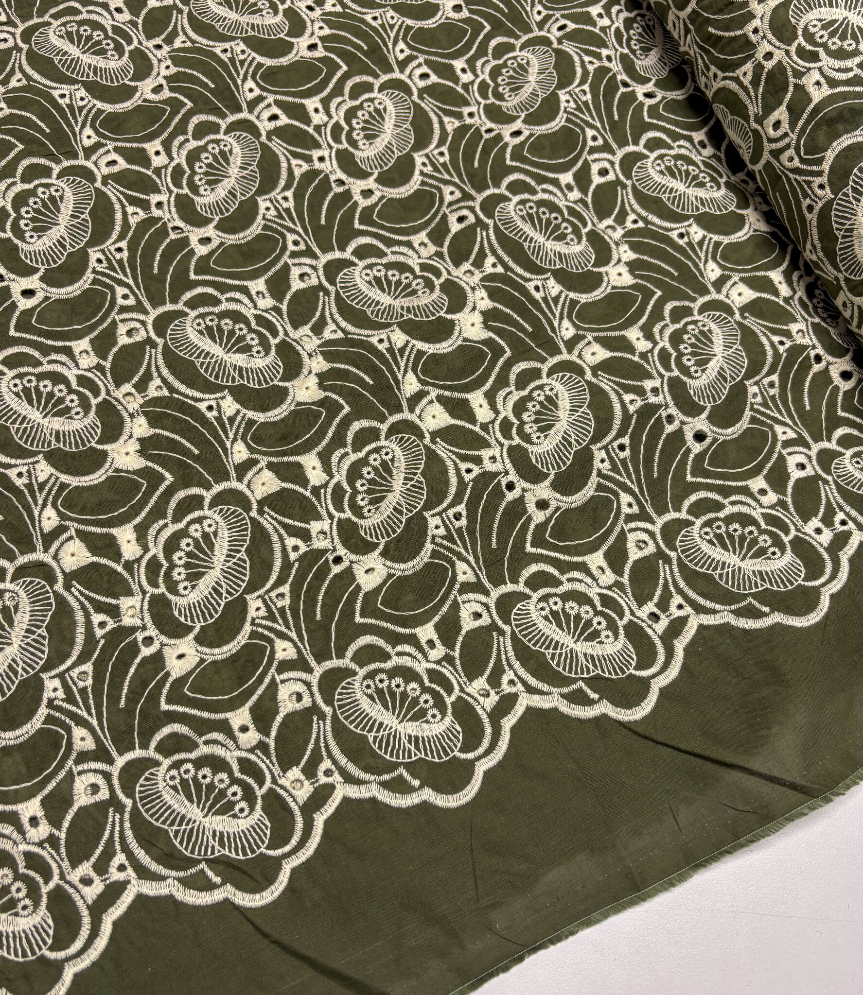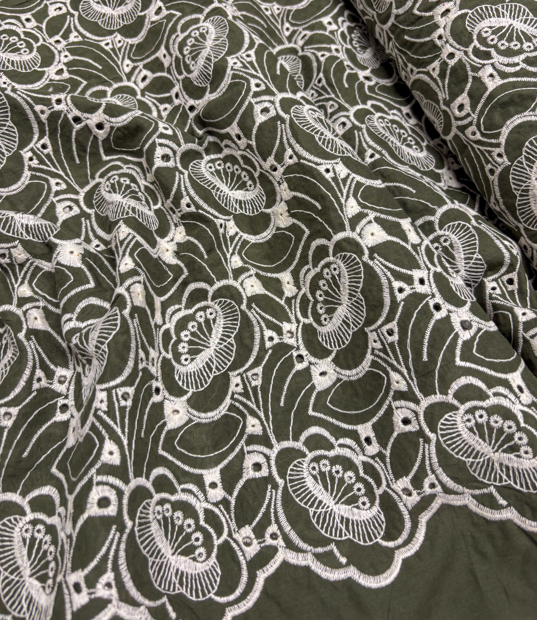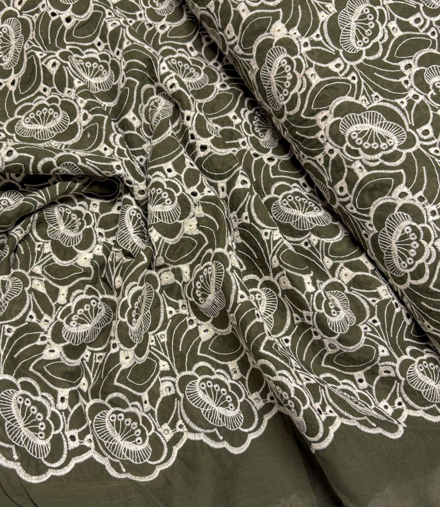 A beautiful cotton with embroidered flowers. We recommend using this fabric width-wise rather than length-wise. It's perfect for airy blouses and dresses. Scalloped edges are also available.