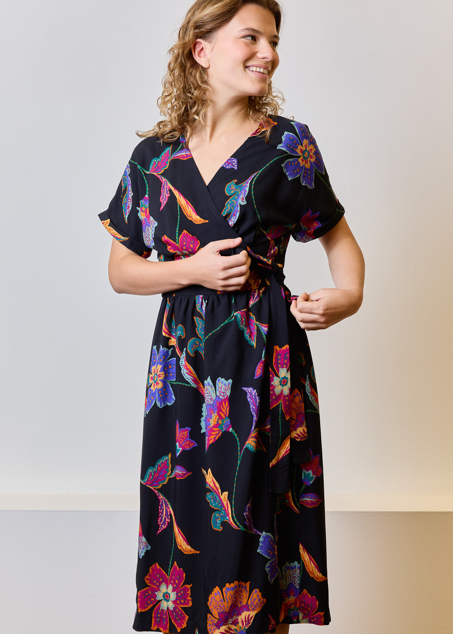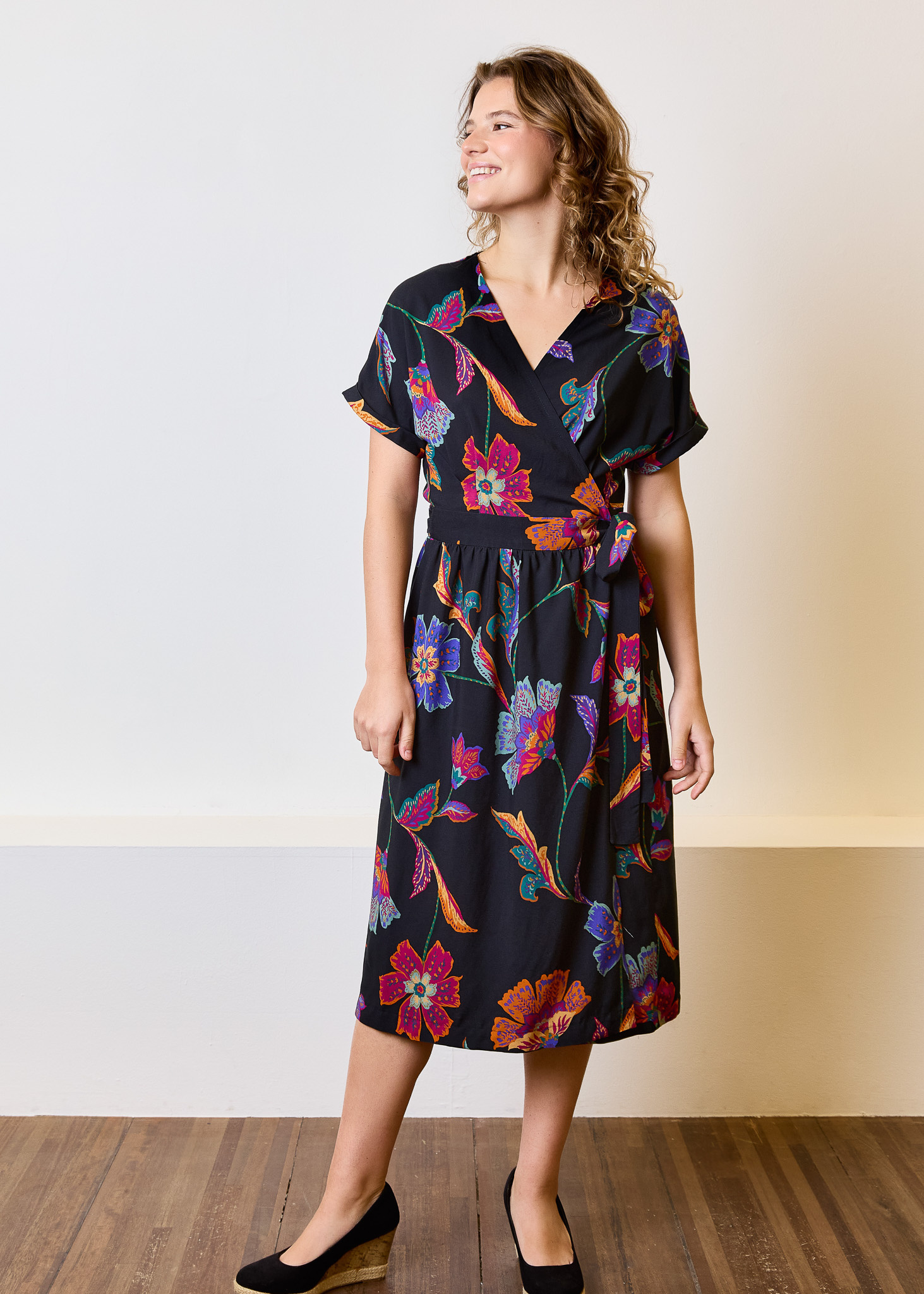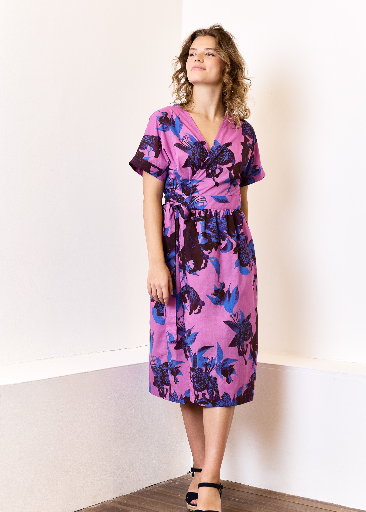 The Robyn wrap dress combines classic design with feminine flair. With its flattering wrap style and a belt to accentuate the waist, this dress creates a beautiful silhouette that is both comfortable and chic. The short, tapered sleeves with straps create a summery look, while the two pleats at the waist emphasize the shape.