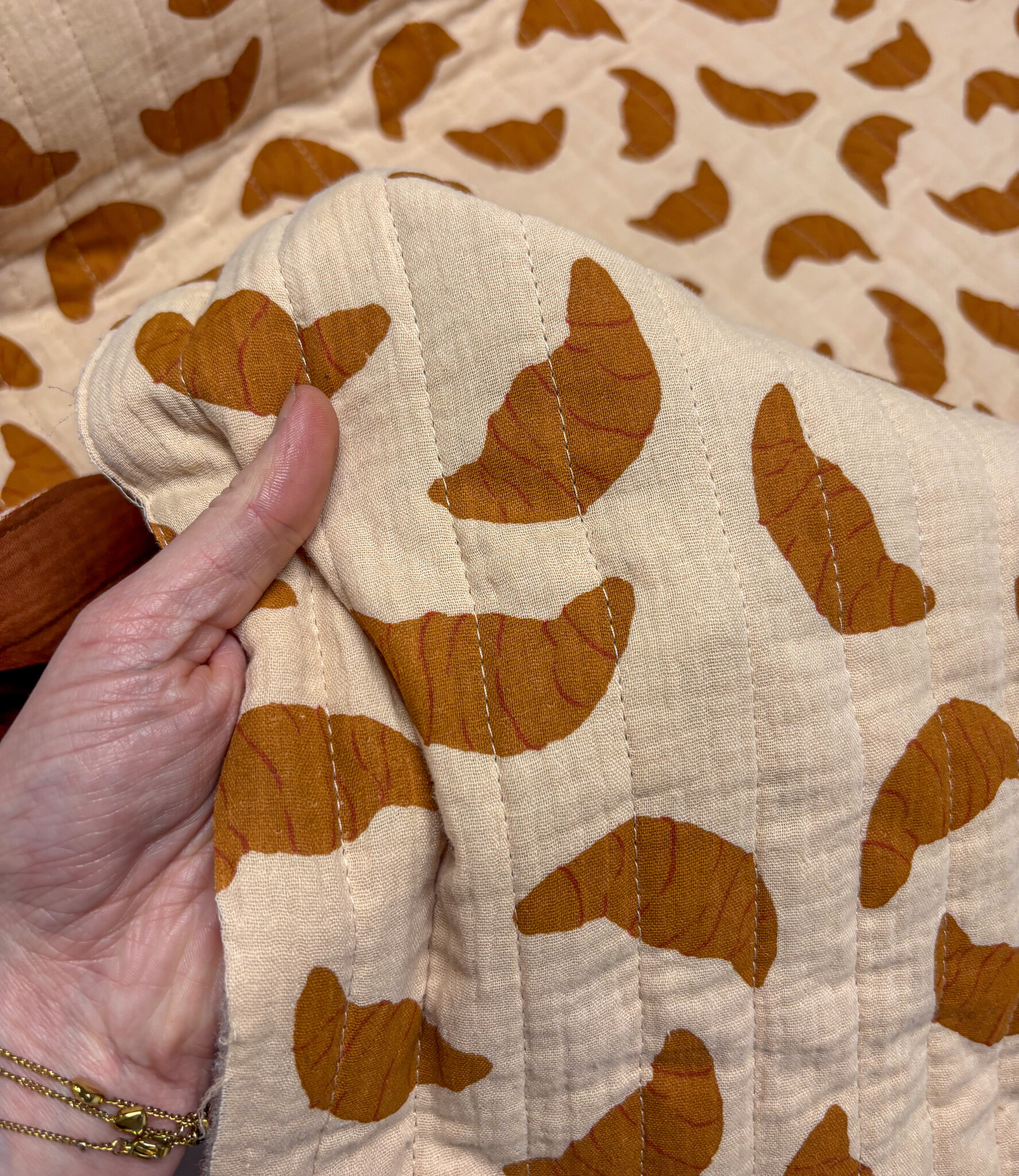 A soft, quilted double gauze tetra with croissants. Double-faced, so this fabric can be used on both sides. Perfect for jackets, body warmers, blankets, and more. Perfect for the Junna vest from Bel 'Etoile. Also perfect for the Junna Bodywarmer (zip-up vest) from Bel 'Etoile.