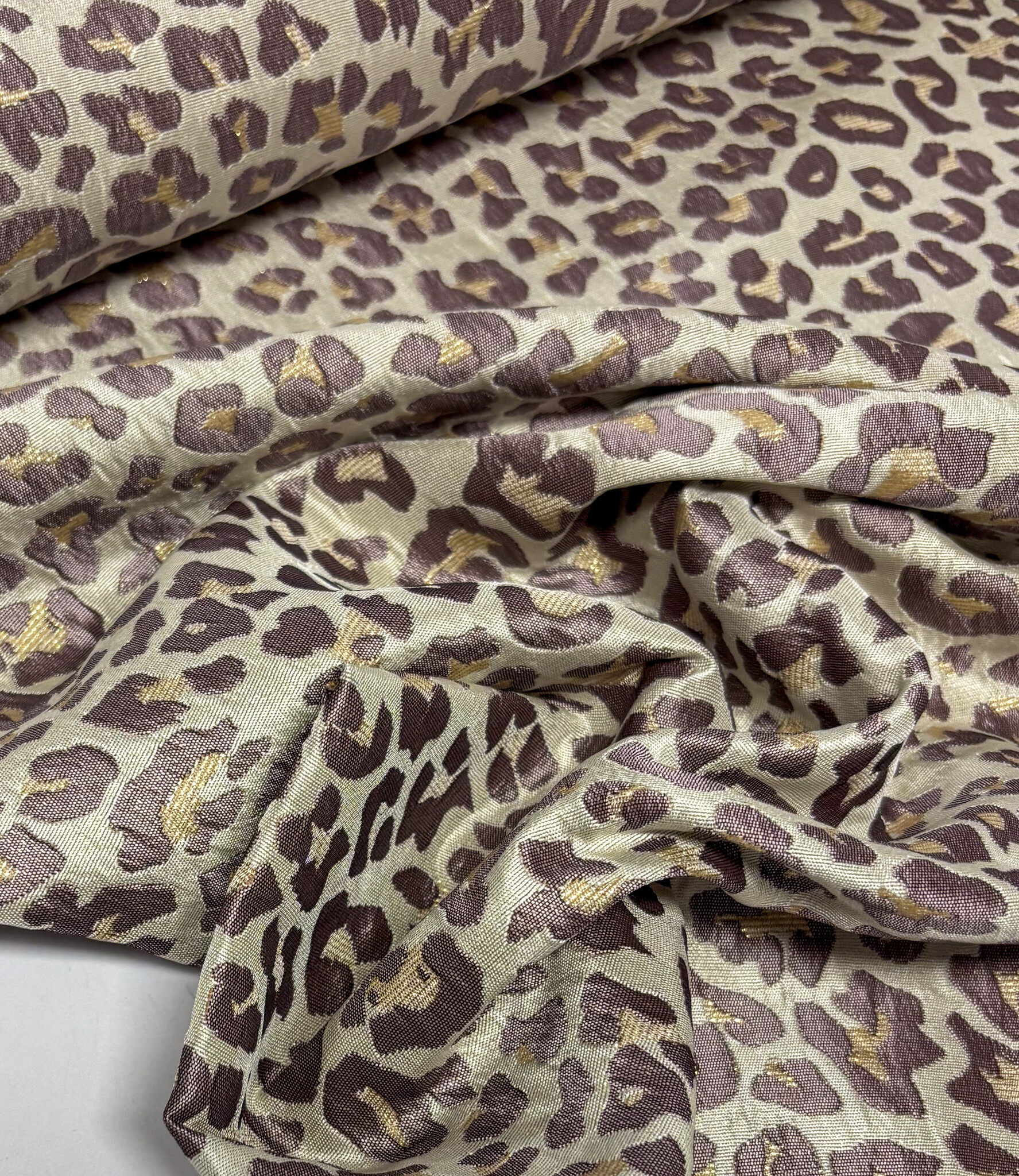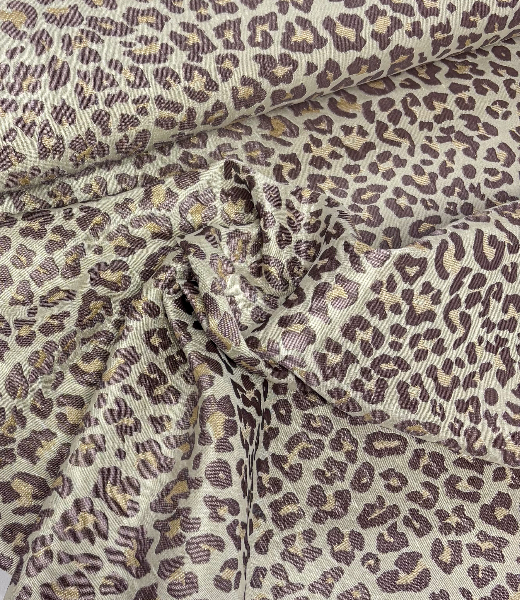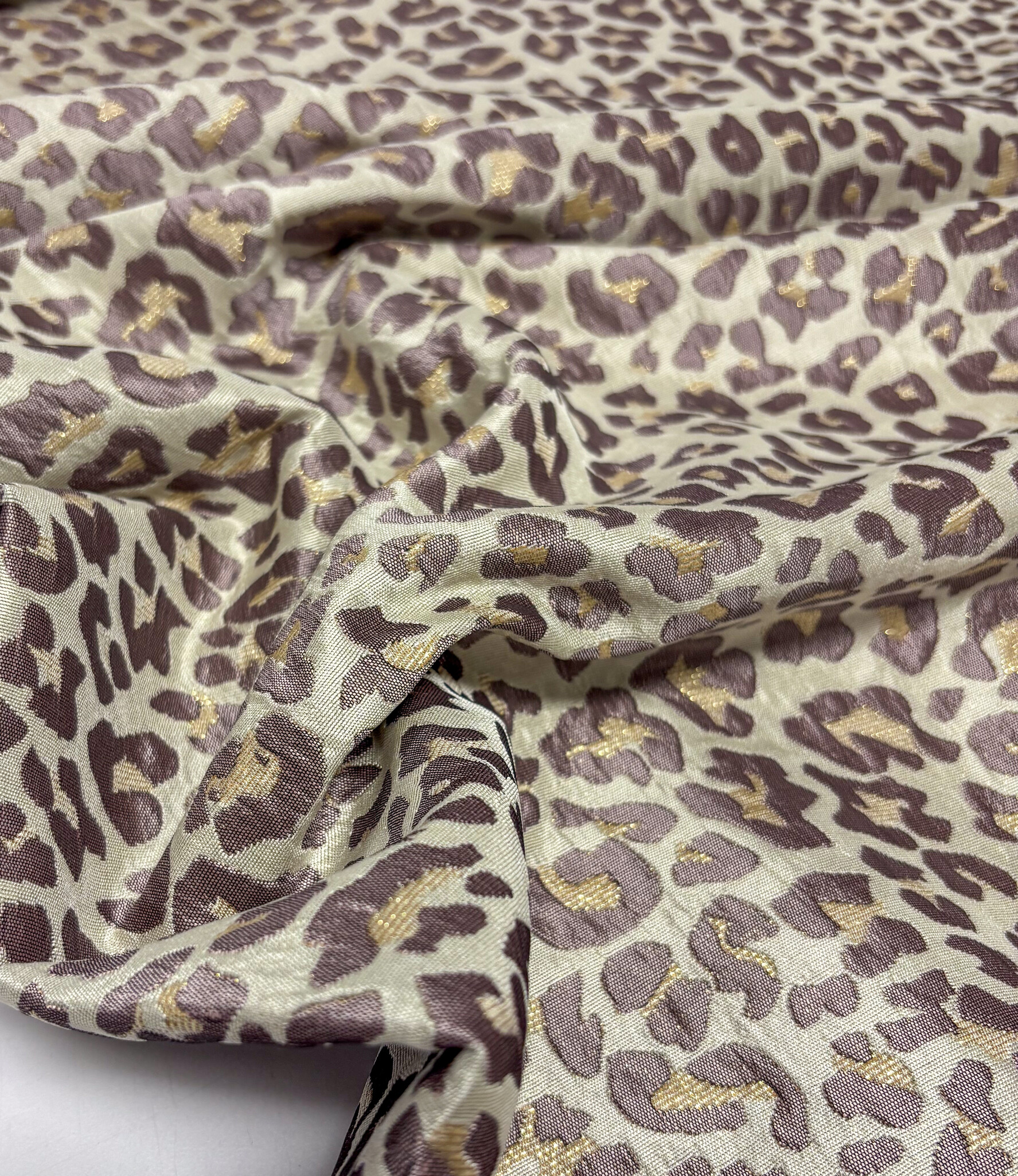 A beautiful woven jacquard with leopard spots and a touch of Lurex. This is a flowing jacquard. Ideal for blouses, dresses, skirts, and blazers. But also definitely suitable for loose-fitting trousers. Or as a sleeve detail on a sweater or blazer.