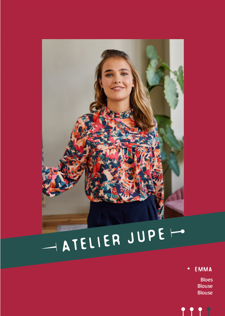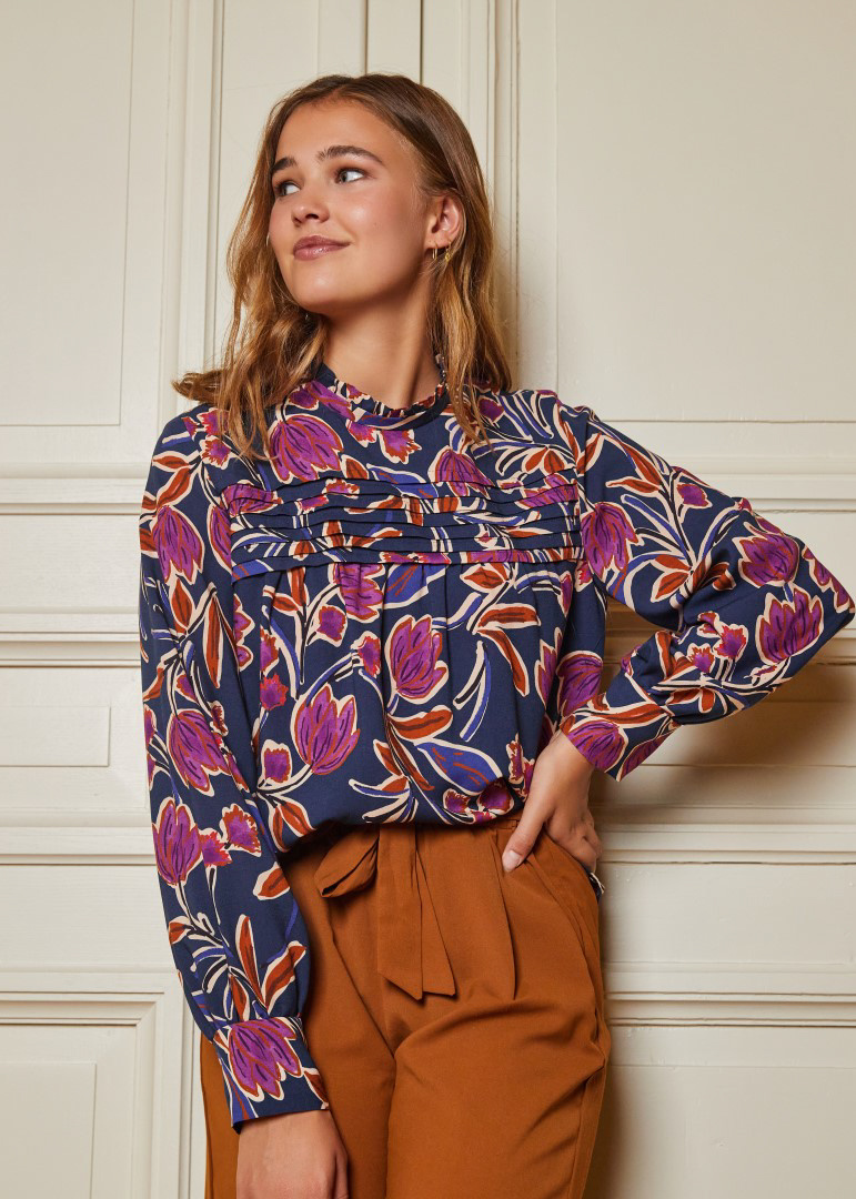 The Emma blouse is an elegant blouse with long, wide sleeves, finished with wide cuffs, a playful collar and 7, fine pleats in the front. The back has a small split that is closed with a button or a hook.
