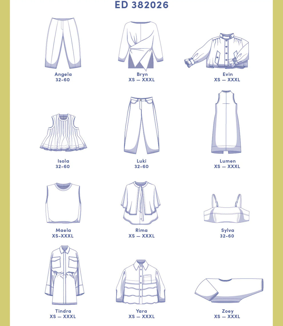 Discover patterns that are both festive and wearable. Angela and Luki give classic trousers a modern twist, while Bryn and Isola play with lines, pleats, and asymmetry. Lumen and Tindra present elegant statement pieces that are both chic and relaxed, and Yara adds playful flair with her ruffles. Evin, Rima, and Zoey also show how strong details and smart cuts make an outfit special, while Maela and Sylva focus on layering and transparency.