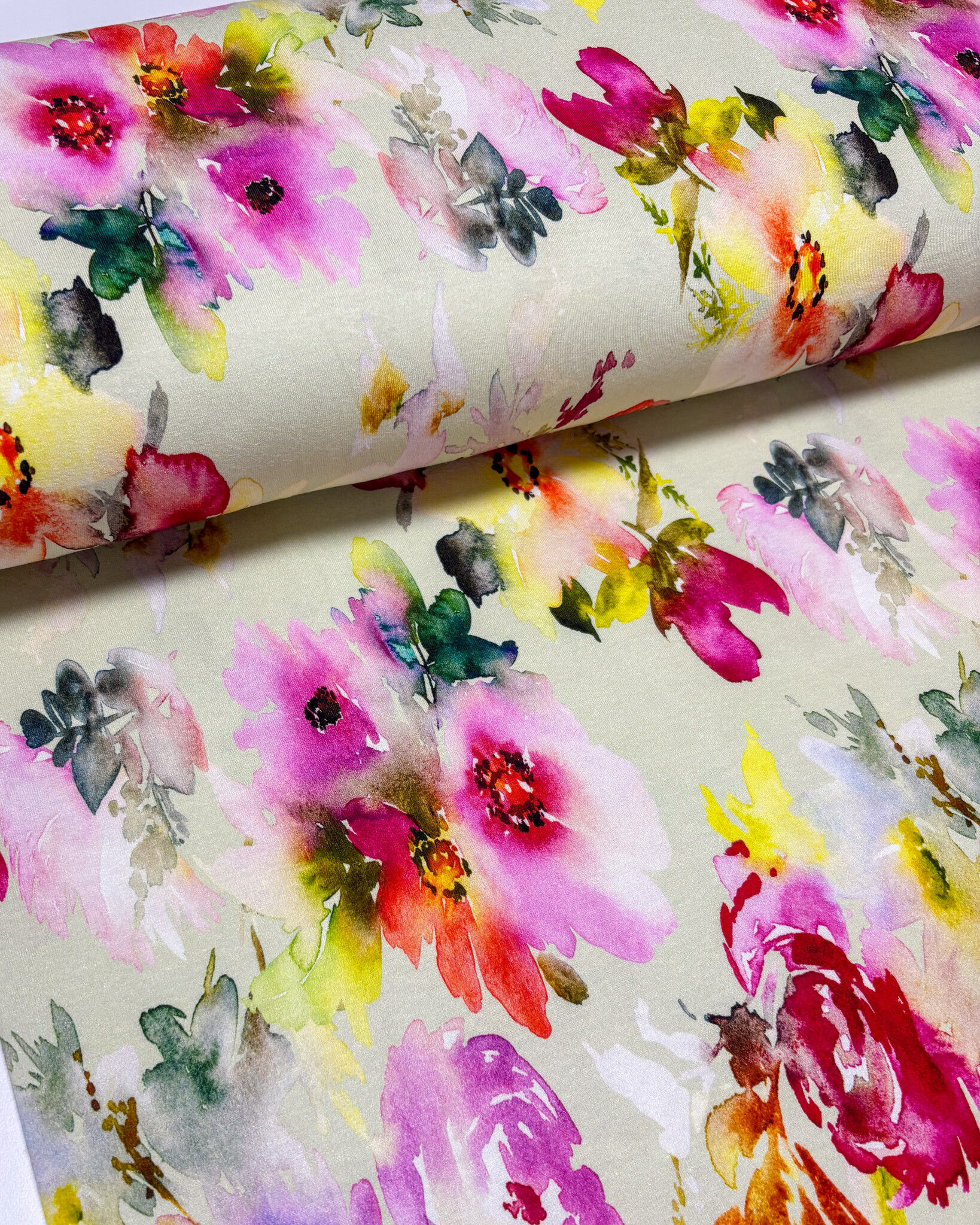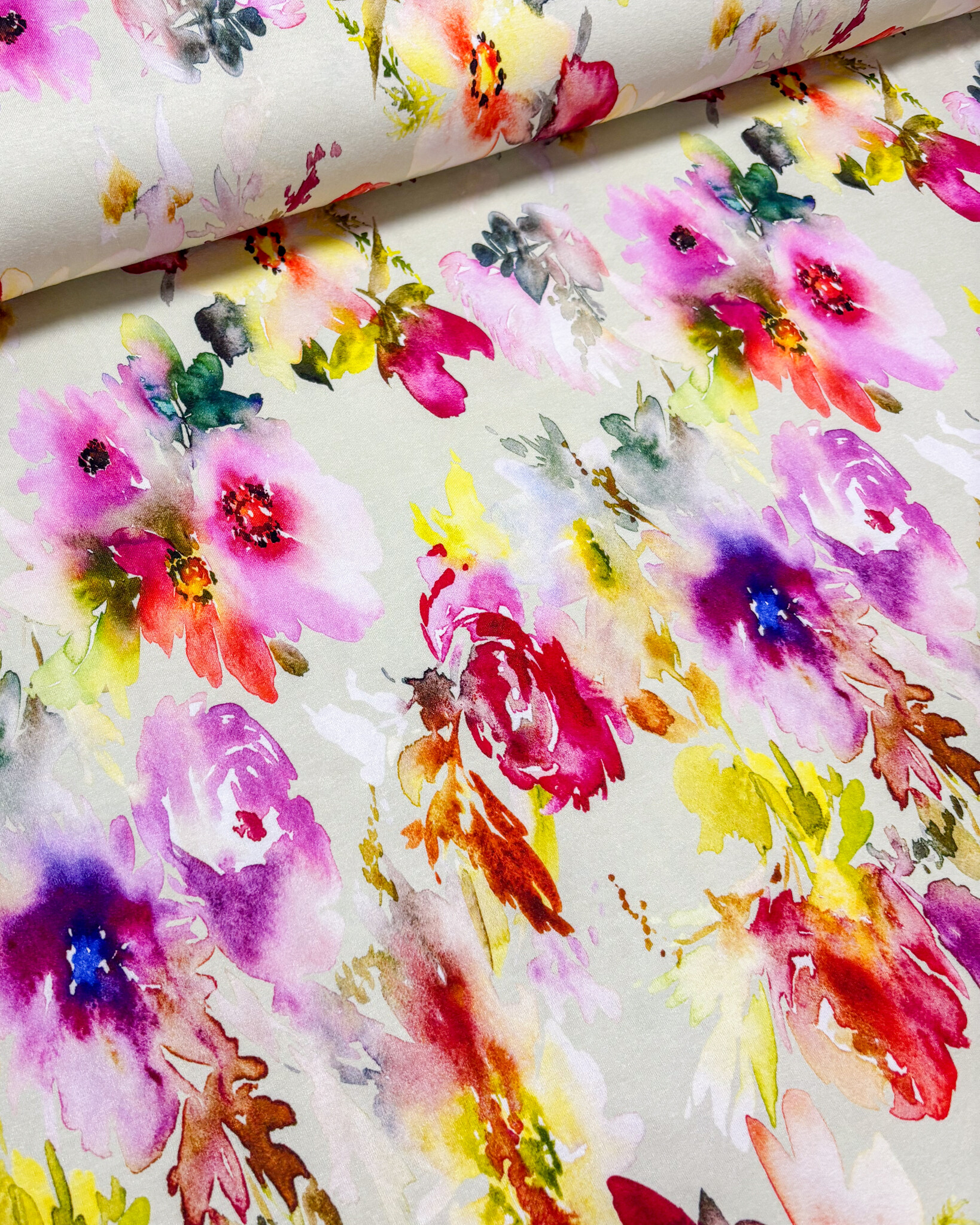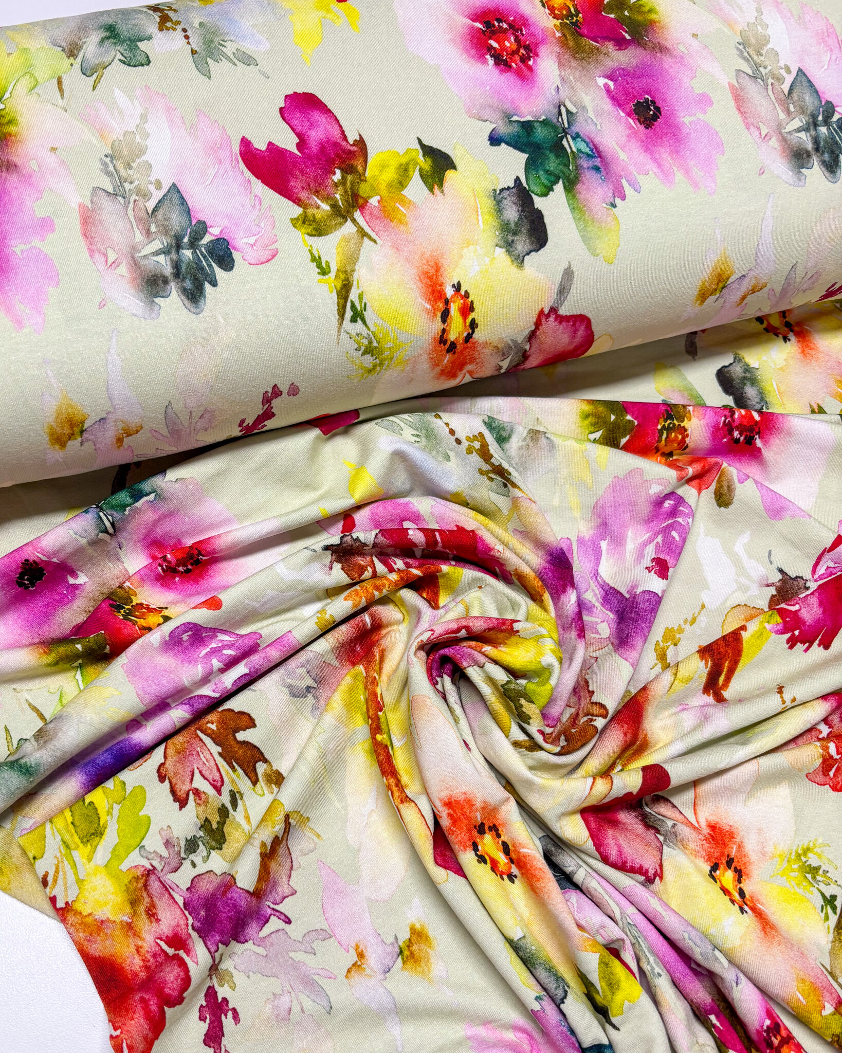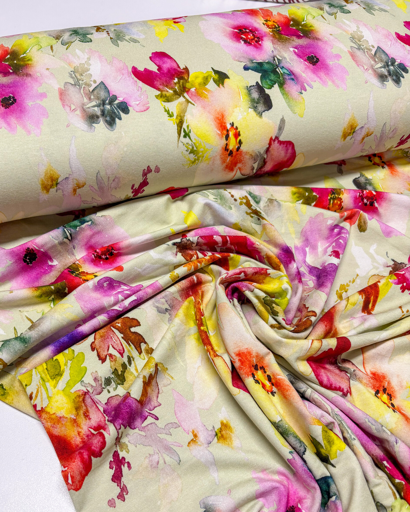 A fine viscose jersey with water-coloured flowers. OEKO TEX. Soft and supple fabric, very suitable for T-shirts and sporty dresses for women.