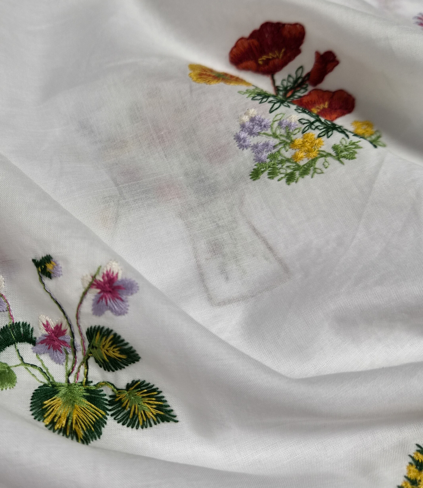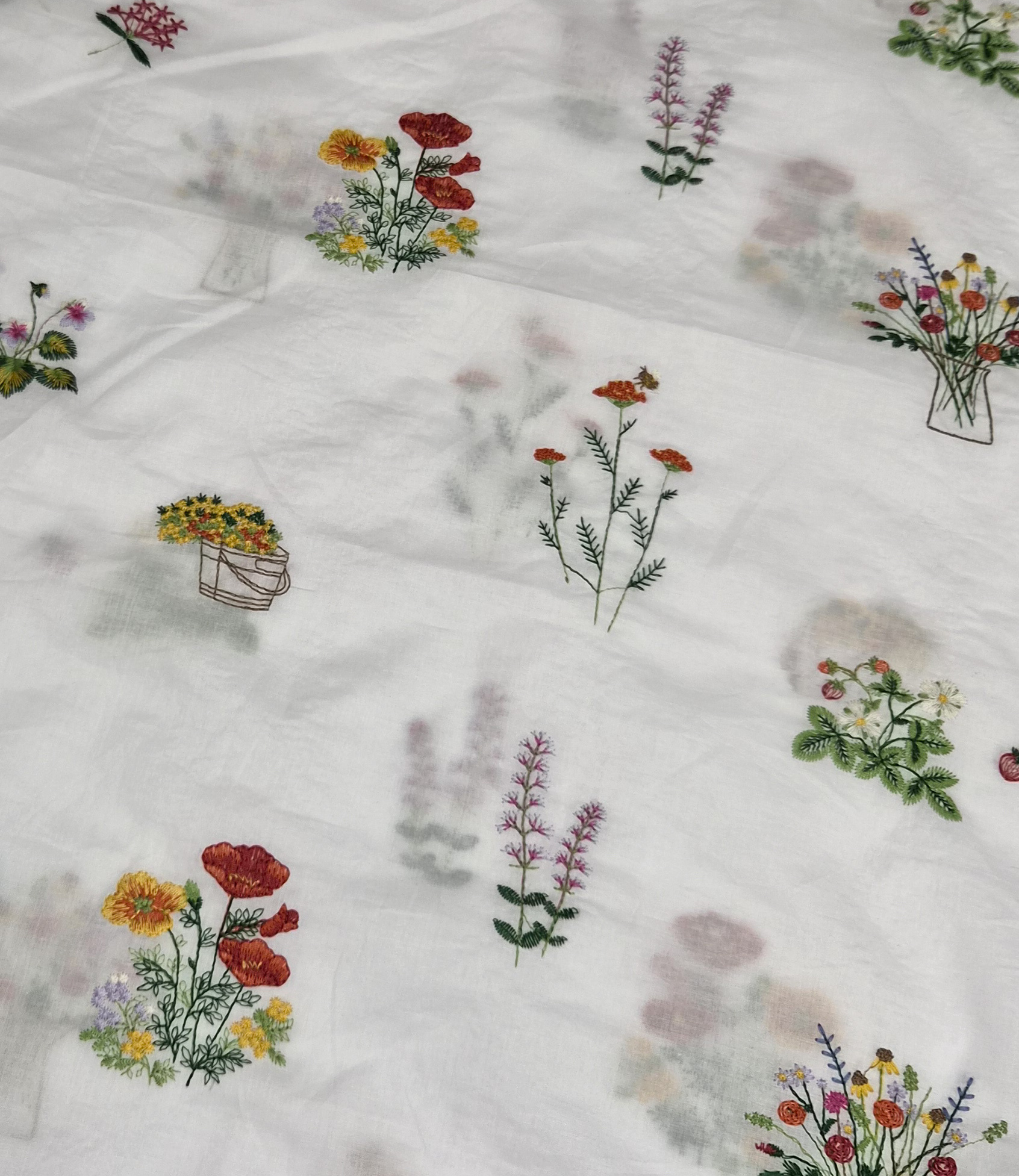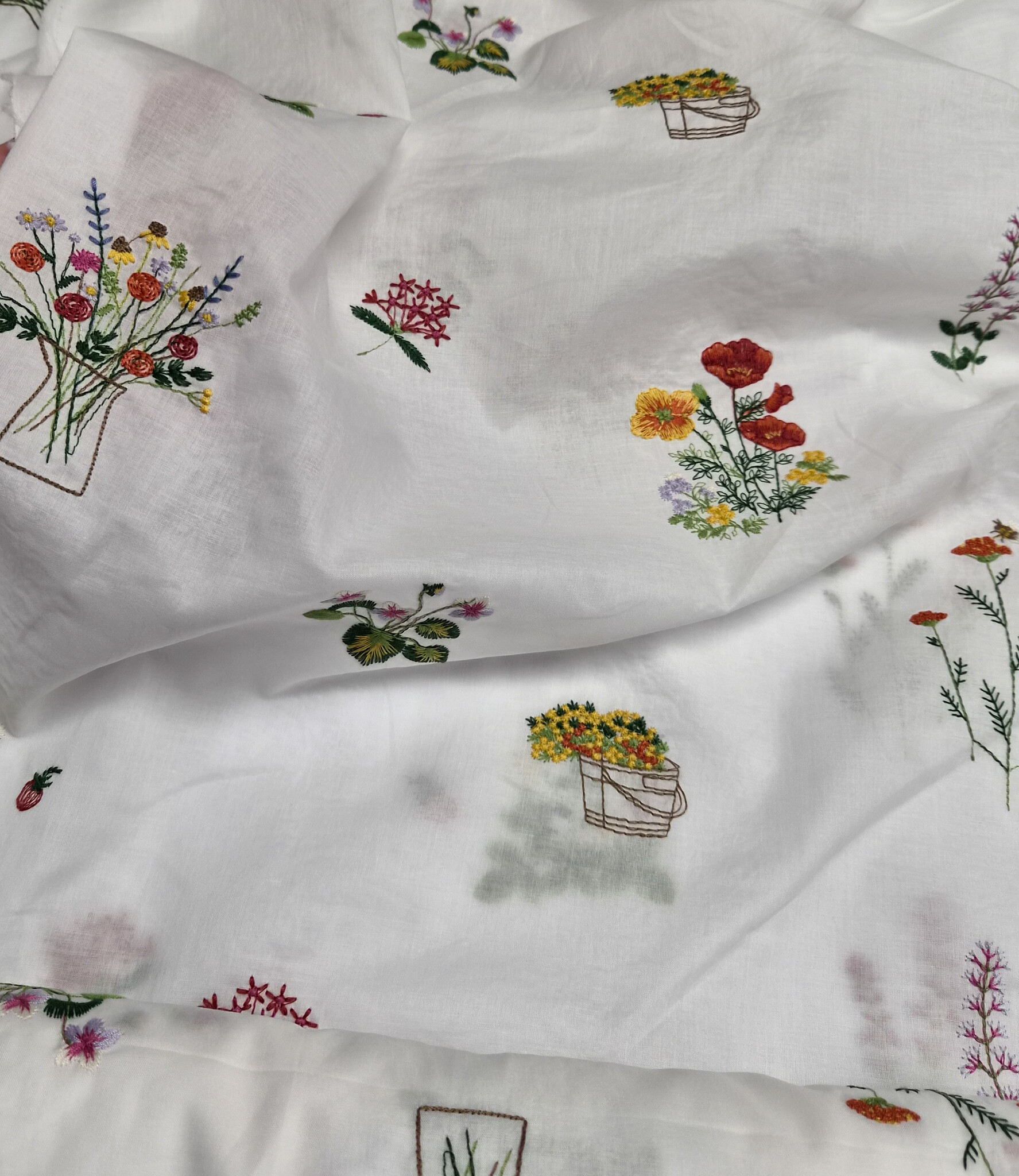 A cotton voile with the most beautiful embroidery. Beautiful flowers, real little paintings. Embroidered down to the last detail. This is truly a unique fabric.