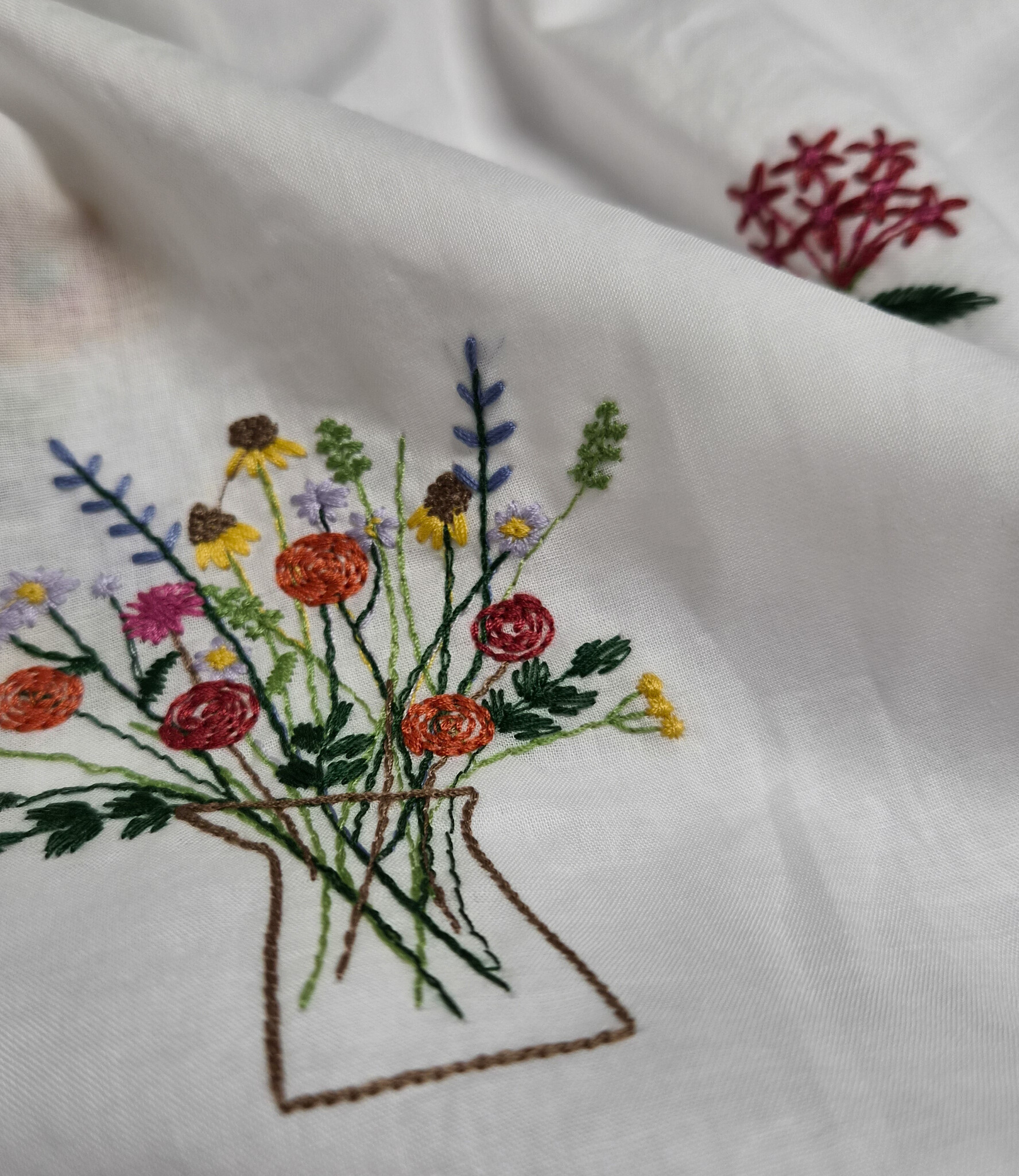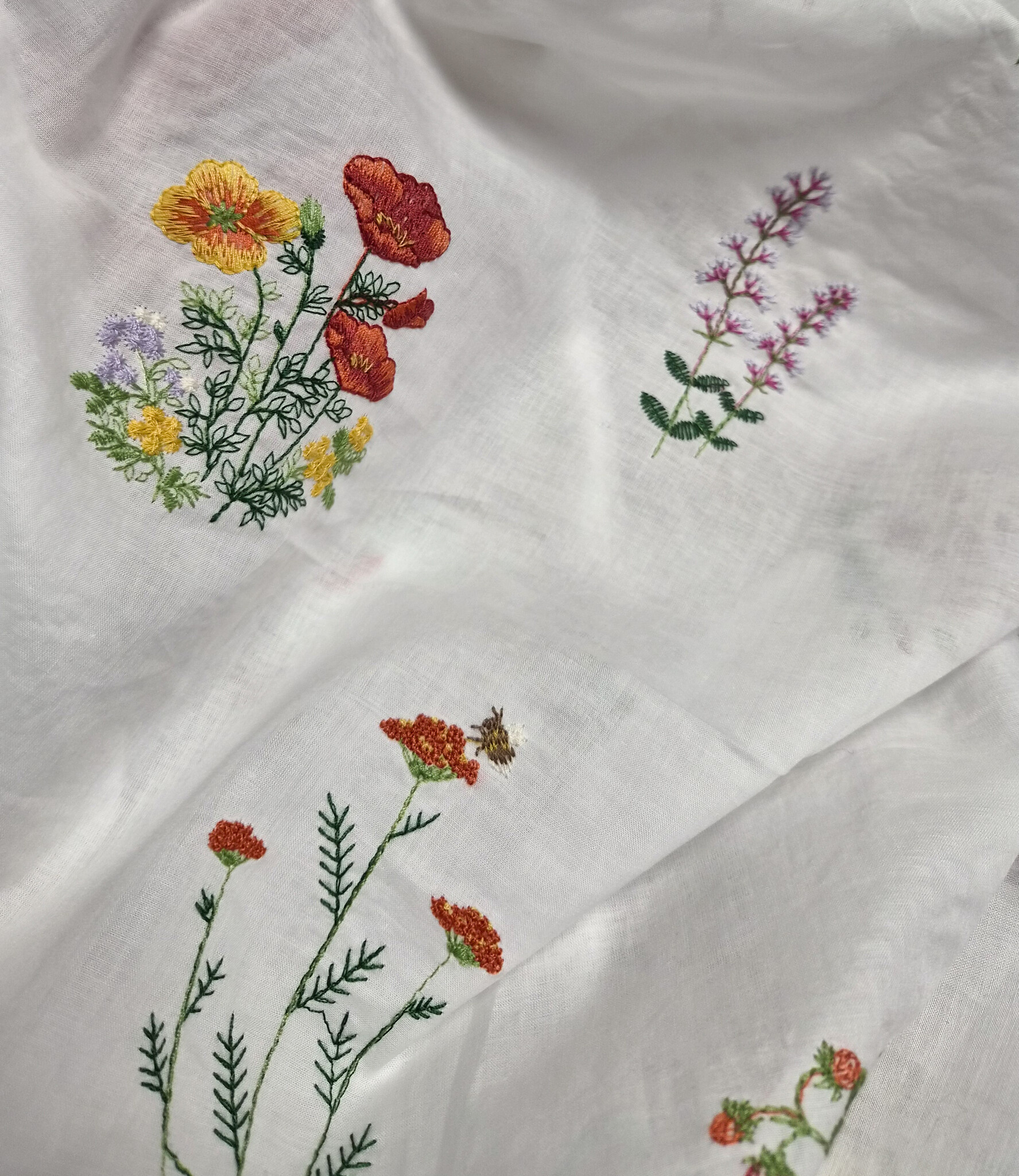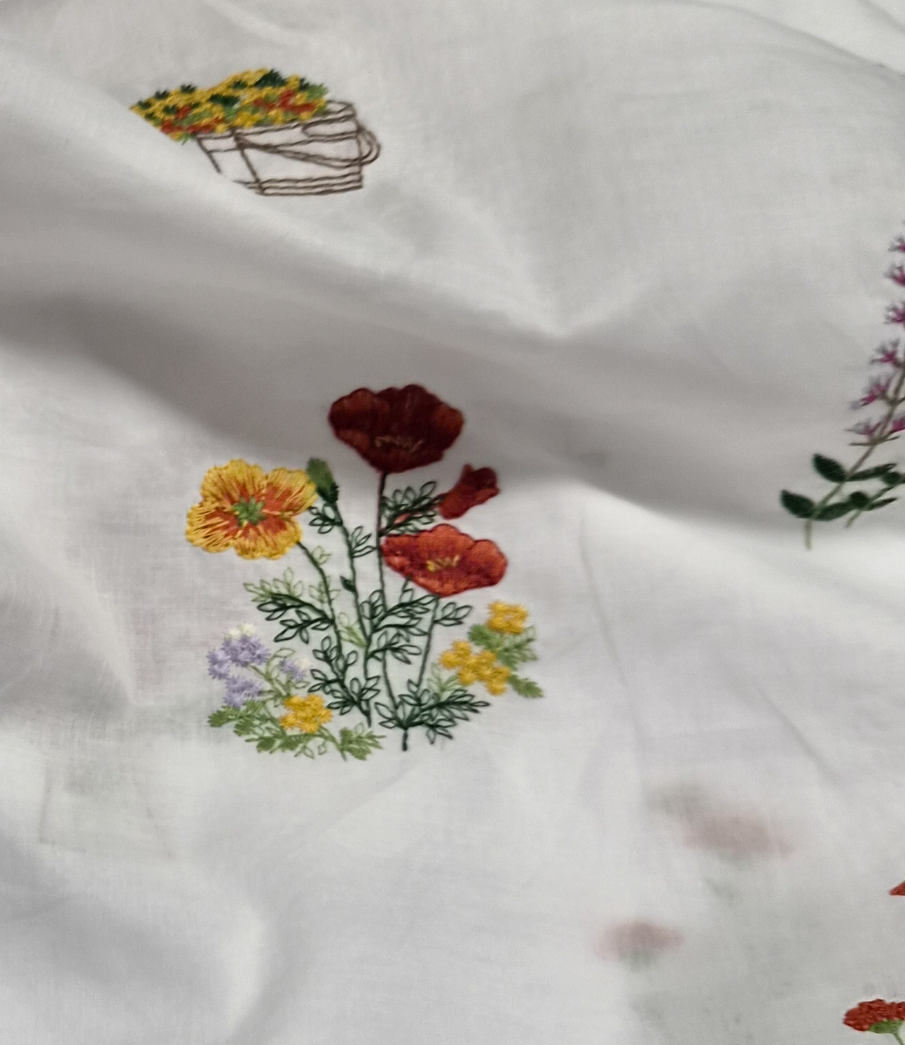 A cotton voile with the most beautiful embroidery. Beautiful flowers, real little paintings. Embroidered down to the last detail. This is truly a unique fabric.