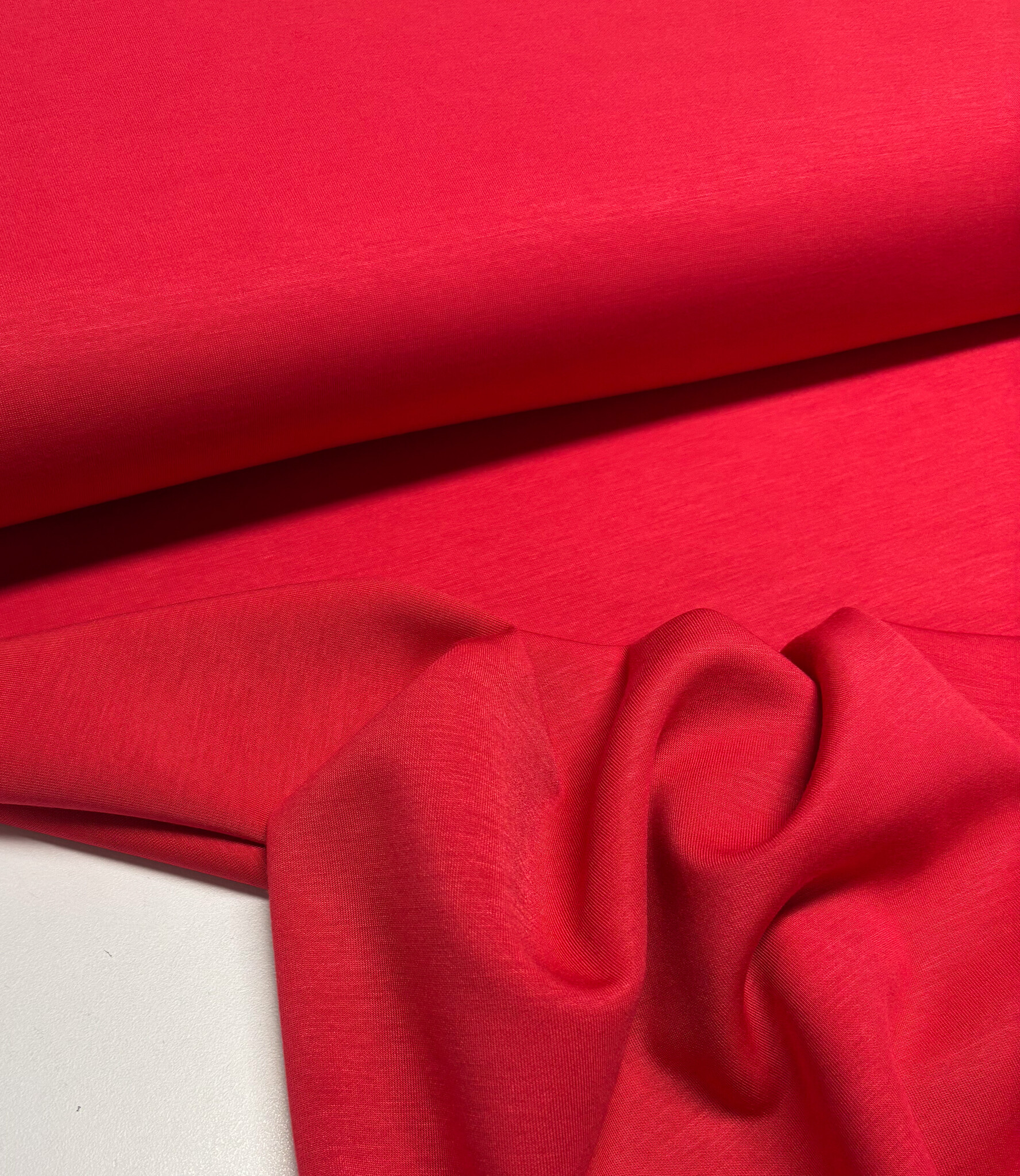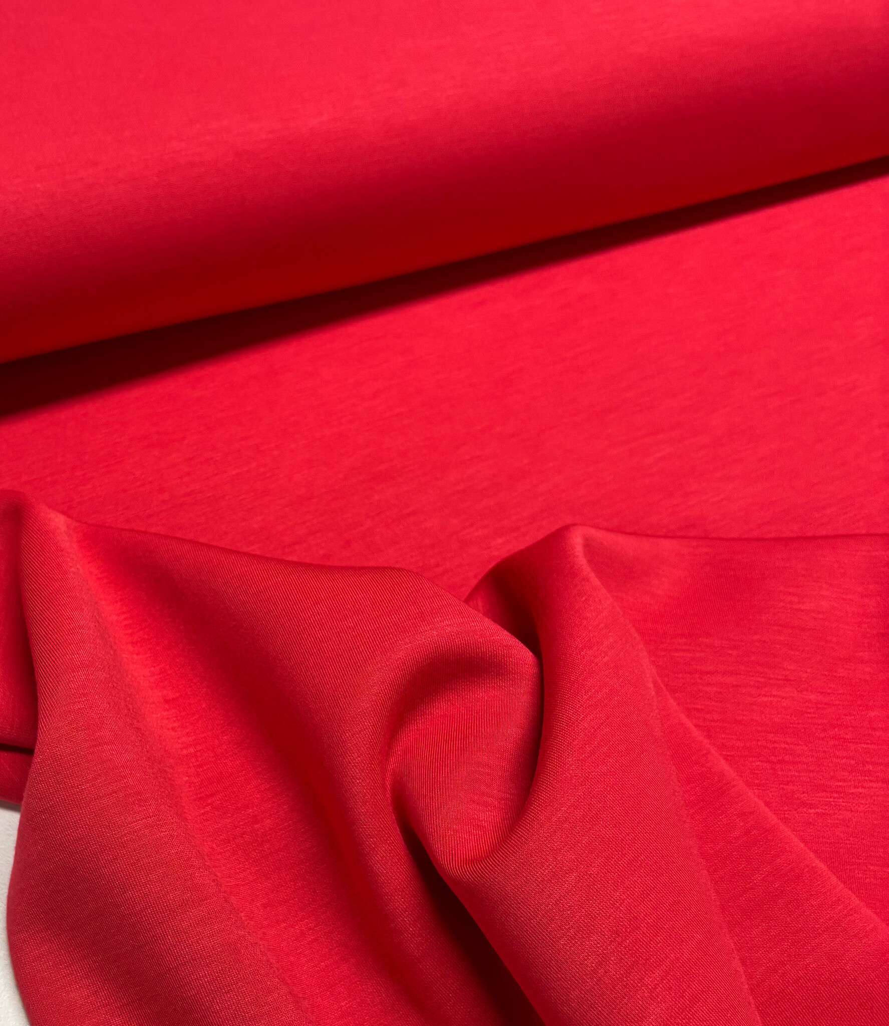 A classy scuba with a very soft modal feel. Perfect for sweaters, dresses, and heavier T-shirts. It stretches. This fabric is used for the Yushu dress from Fibre Mood edition 25.