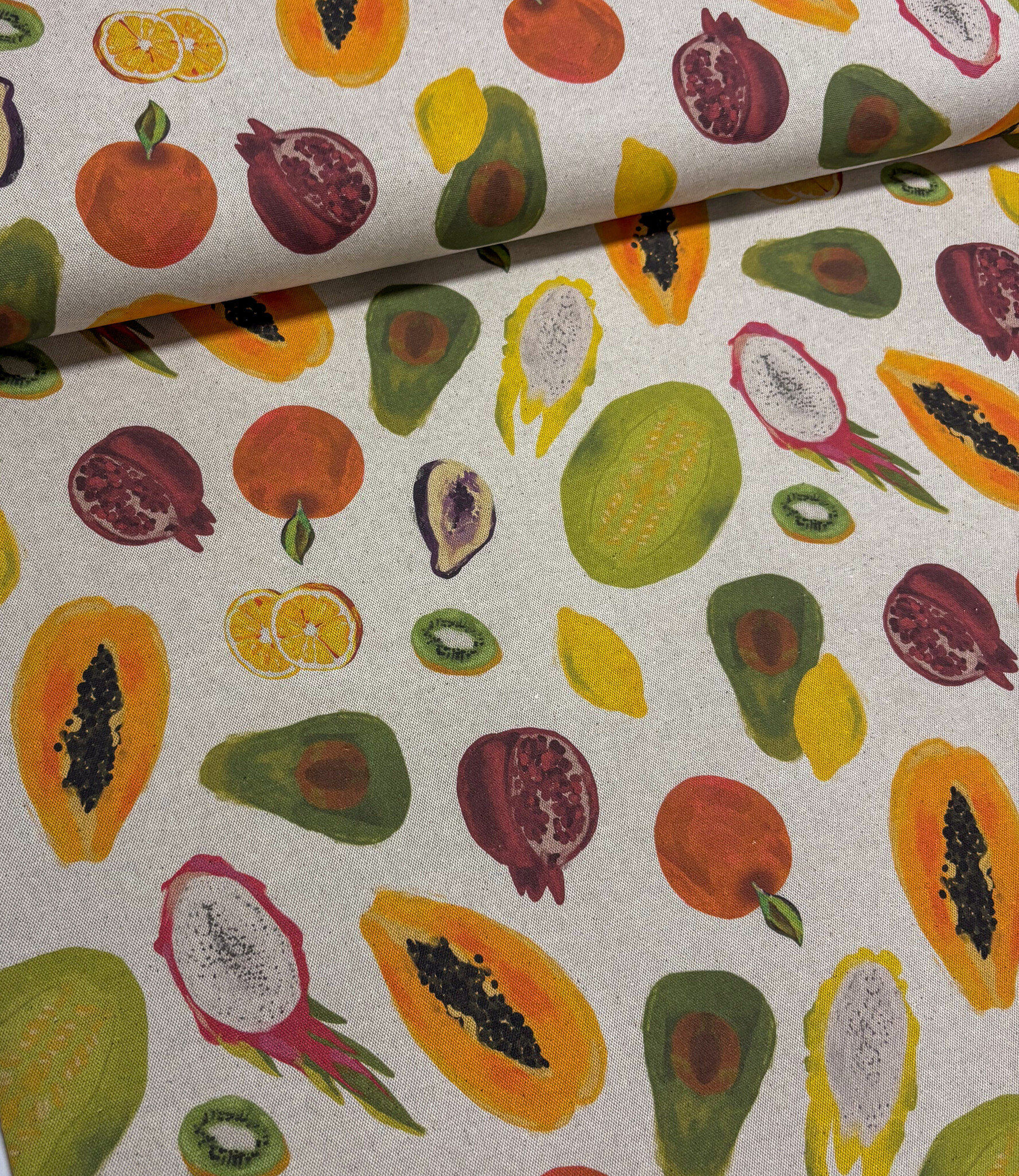 A cool and soft canvas with all sorts of fruits. Perfect for a tablecloth, napkins, cushion covers, but also for an apron, etc.