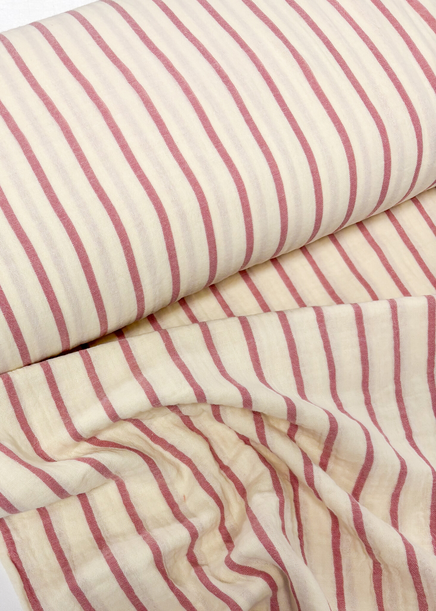 Beautiful quality double gauze with stripes. Perfect dresses, tops, T-shirts and for baby and children's stuff. Wonderfully soft.