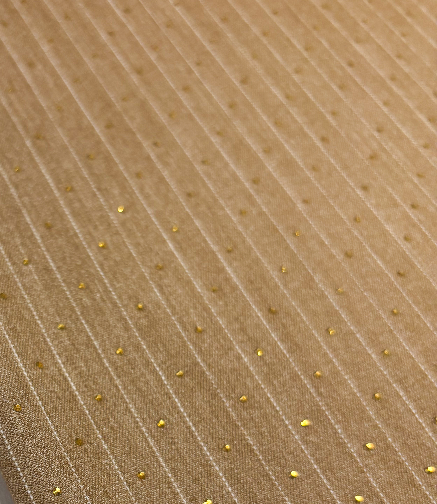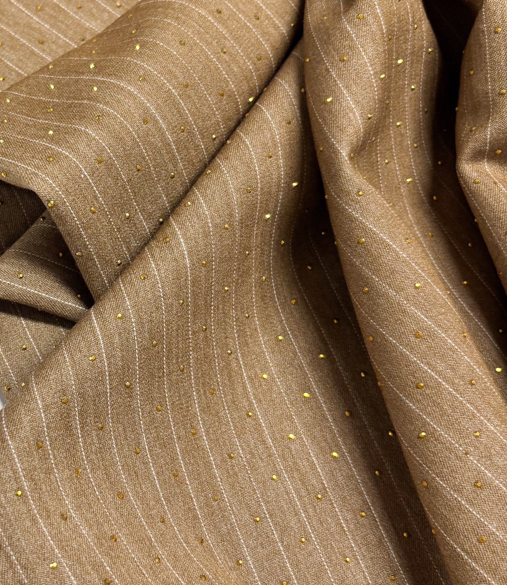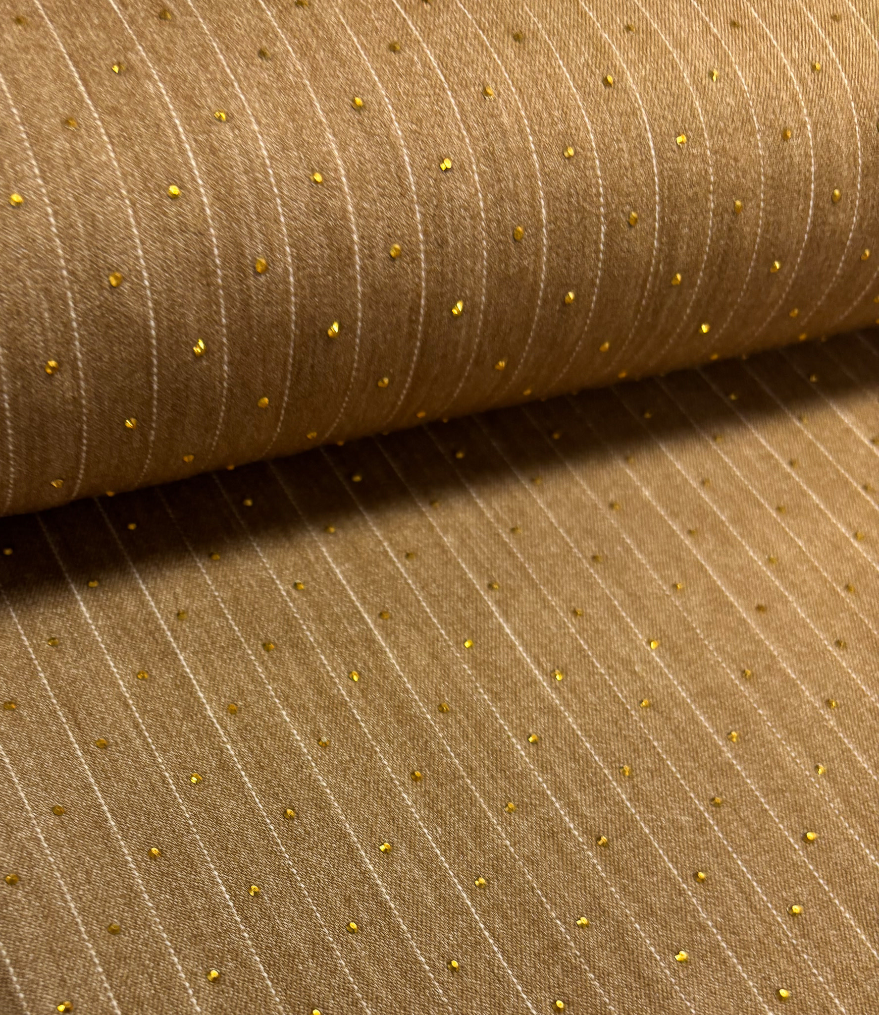A flowing fabric with a soft touch and a slight stretch, featuring a delicate stripe and gold rhinestones. Perfect for skirts, trousers, dresses, and more. Also perfect for blazers.