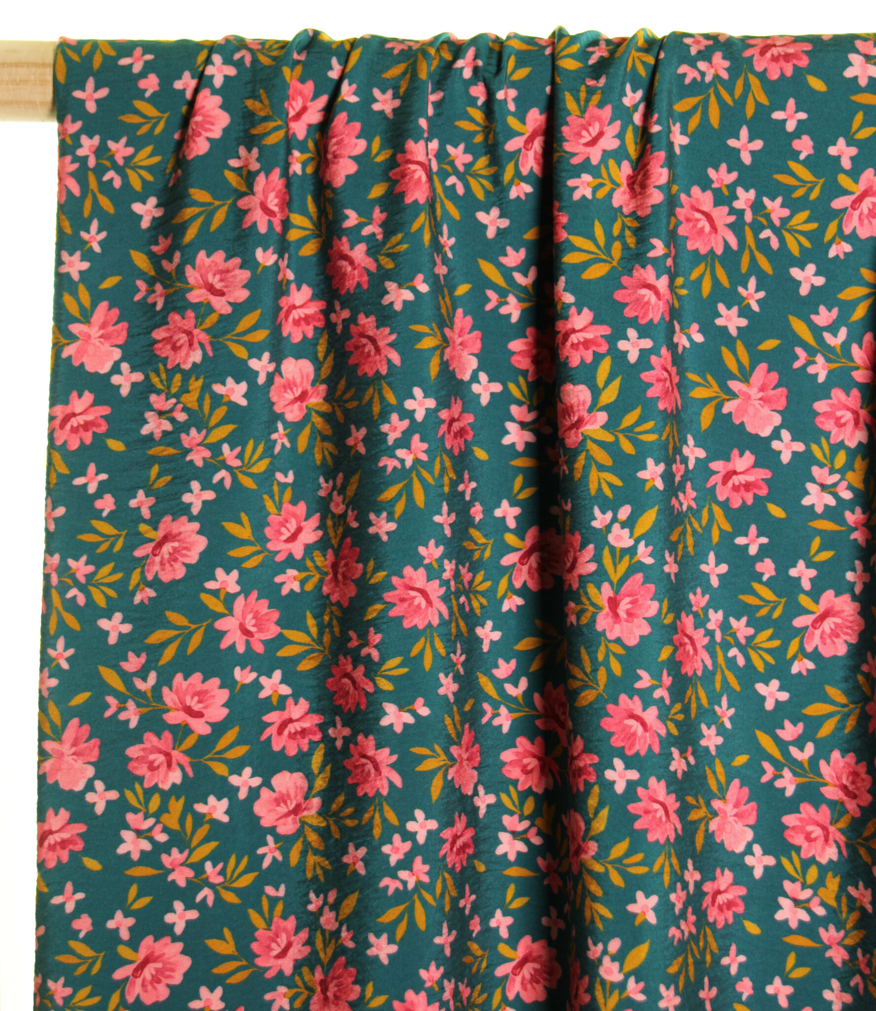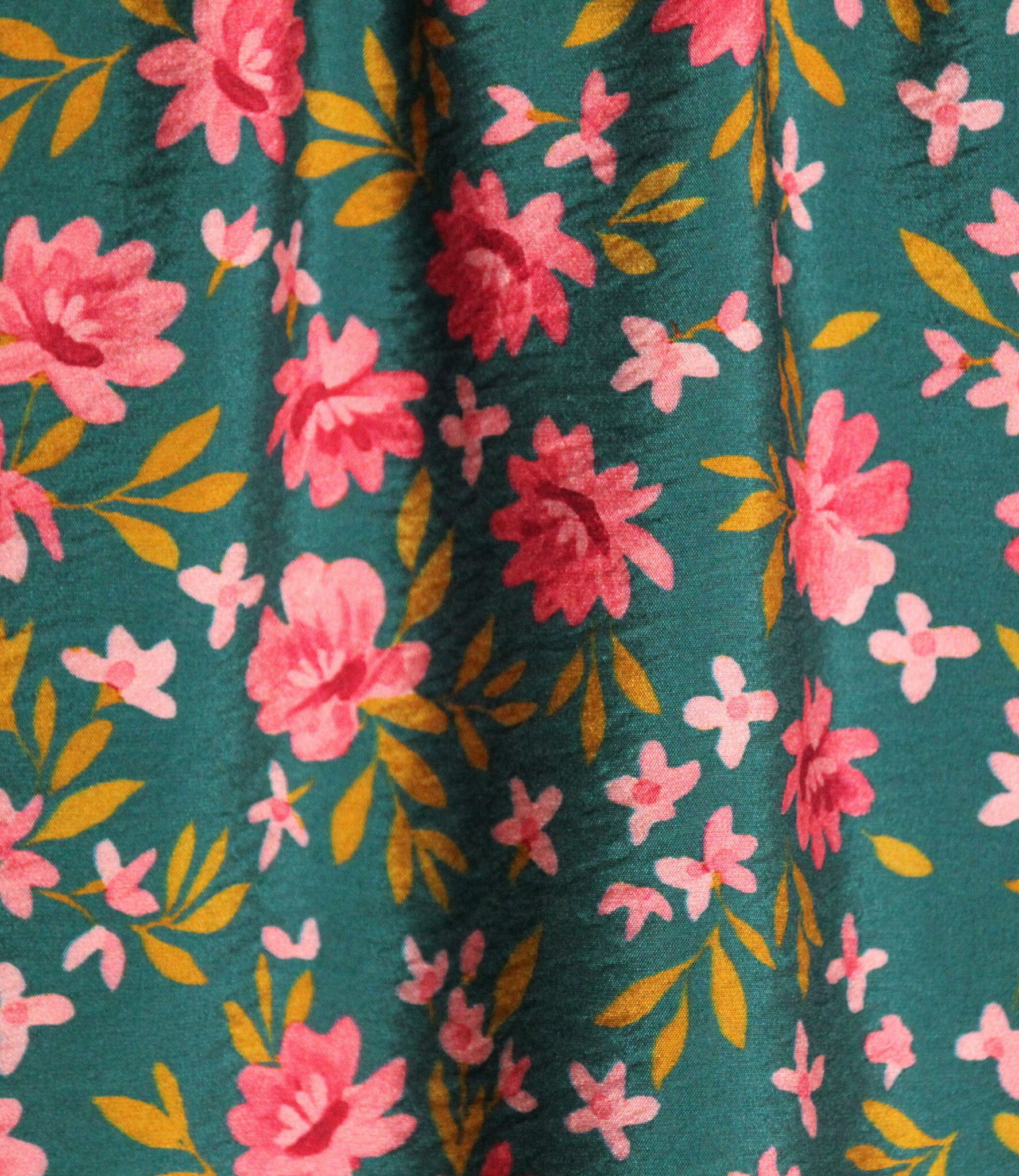 A viscose/polyamide blend with a light texture that appears somewhat 'bumpy' and has a subtle satin sheen. The fabric features small, colorful flowers on a dark green base. This fabric is suitable for blouses, dresses, skirts, etc., and is also available in ochre.