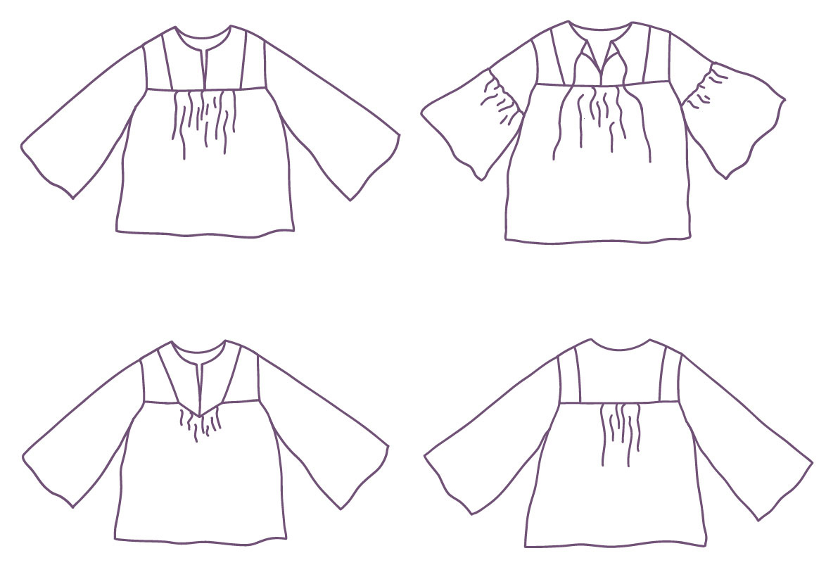 The wide, gathered sleeve gives a more summery and romantic look, while the long sleeve is slightly more neutral. You can add a ribbon to the neckline as a nice detail. You can also stitch a nice piping ribbon between the top and side pieces. This pattern was originally launched for Simply Sewing Magazine in the UK, but with just the straight cut front. This version has an extra 2nd front piece.