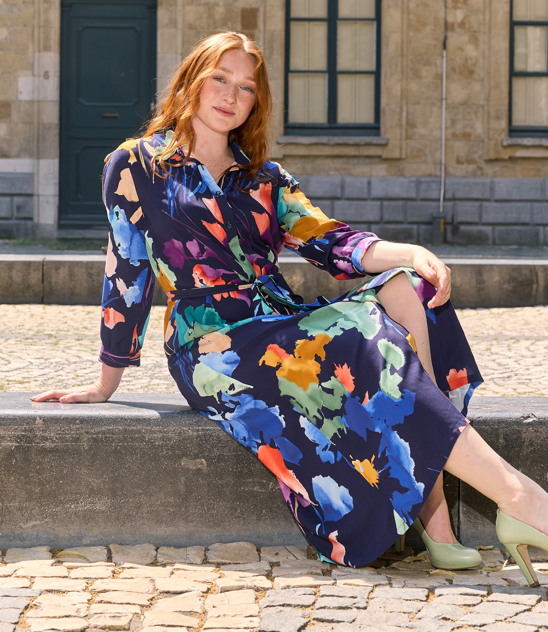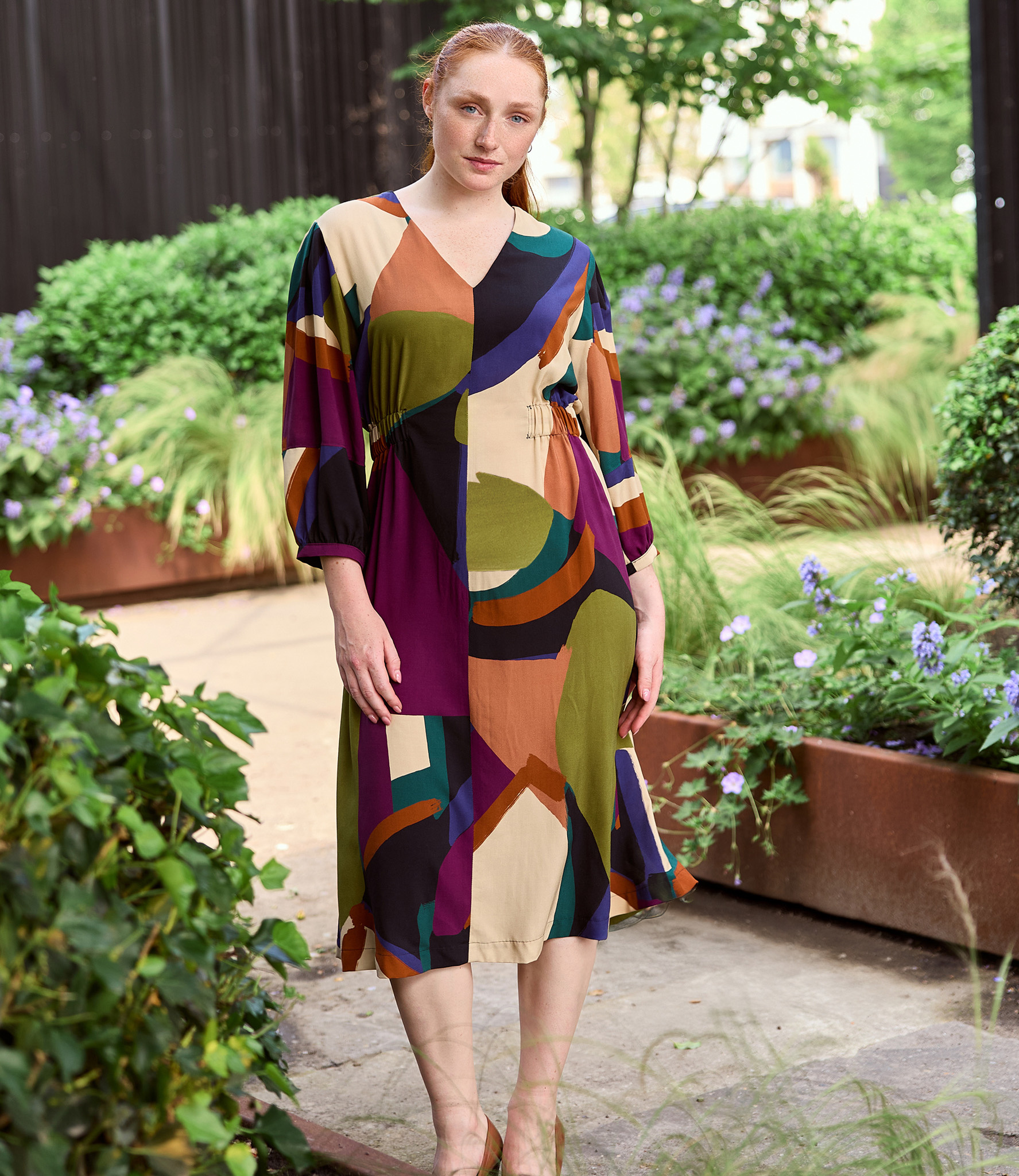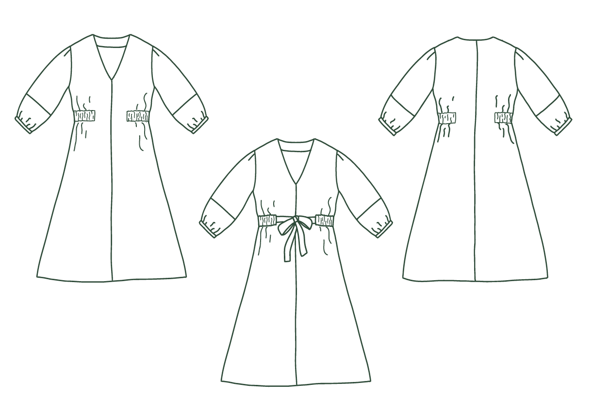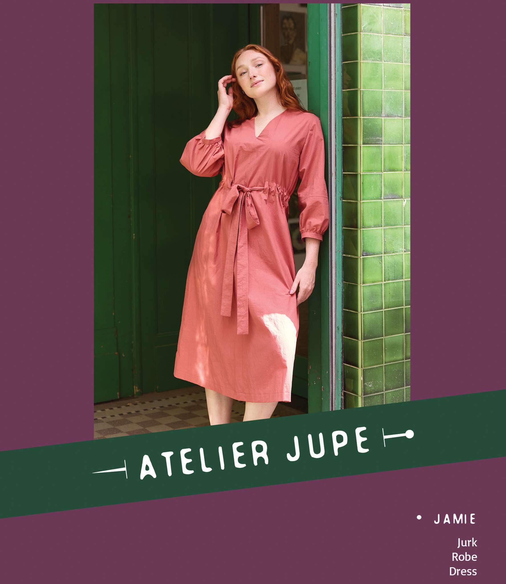 With sewing pattern Jamie, you'll create a dress that stands out with its charming details and flowing skirt! The sleeves are a real eye-catcher: a flat pleat at the sleeve cap and a gathered yoke at the bottom, finished with a delicate cuff. A tunnel with elastic is sewn inside the sides of the dress, allowing Jamie to fit beautifully at the waist. Prefer a more striking accent? Then choose to sew the tunnel outside and thread the pretty tie ribbon through it! Jamie is cut at both the center front and center back, making sewing the V-neck a little easier! Jamie looks stunning in a solid fabric—making the details really pop—but she's just as beautiful in a print!