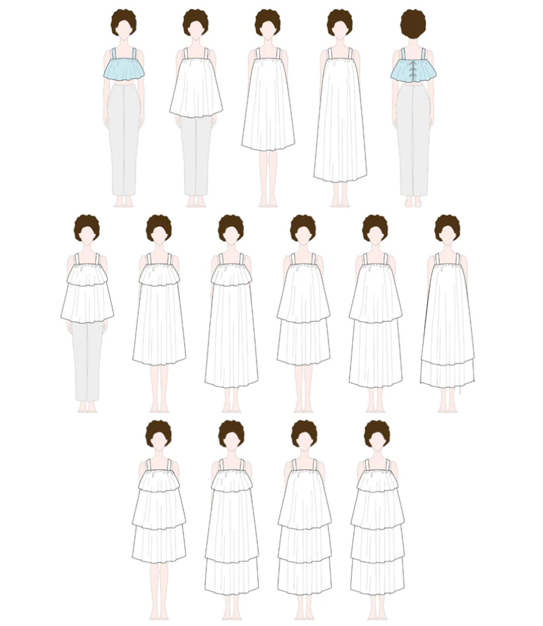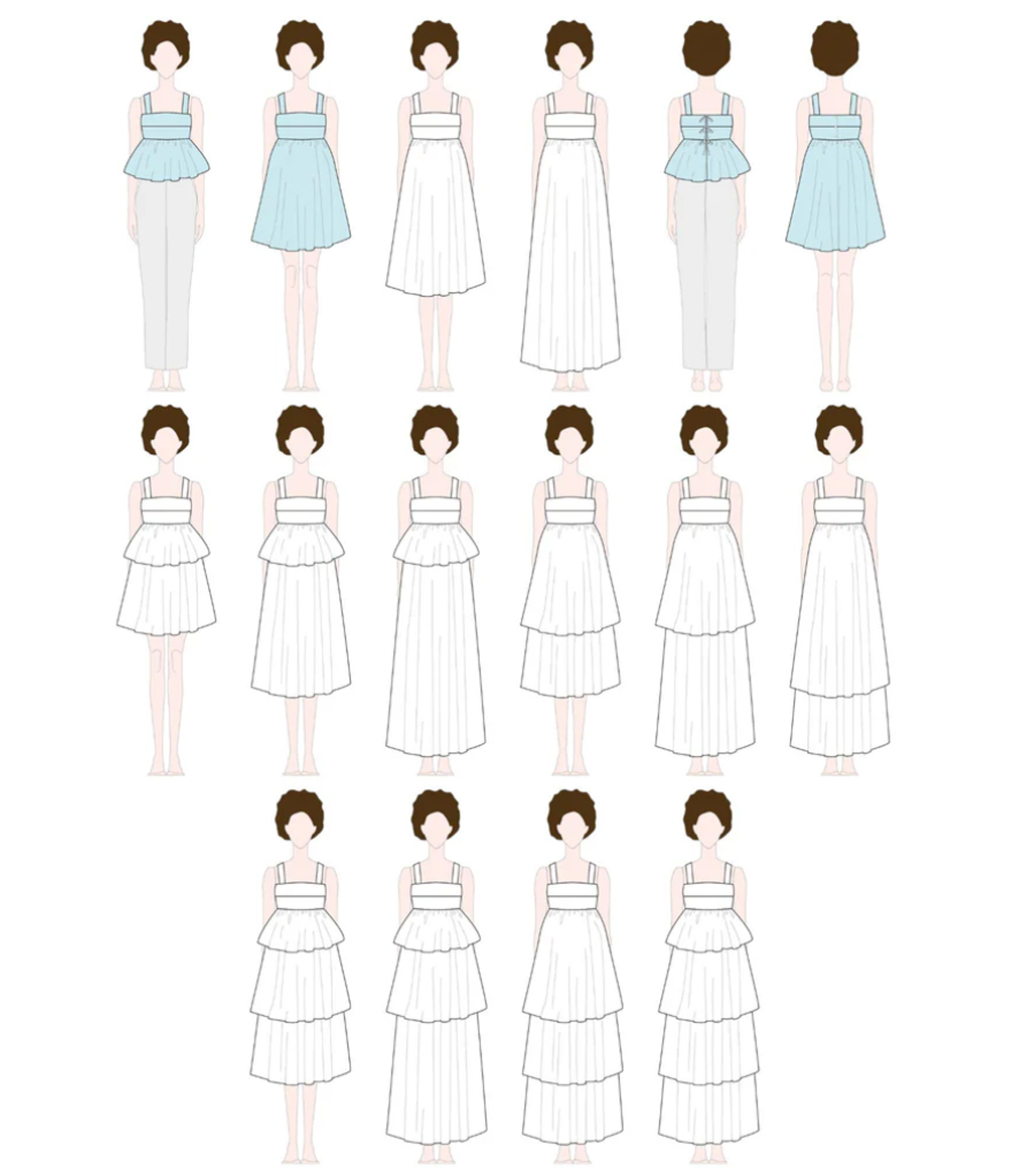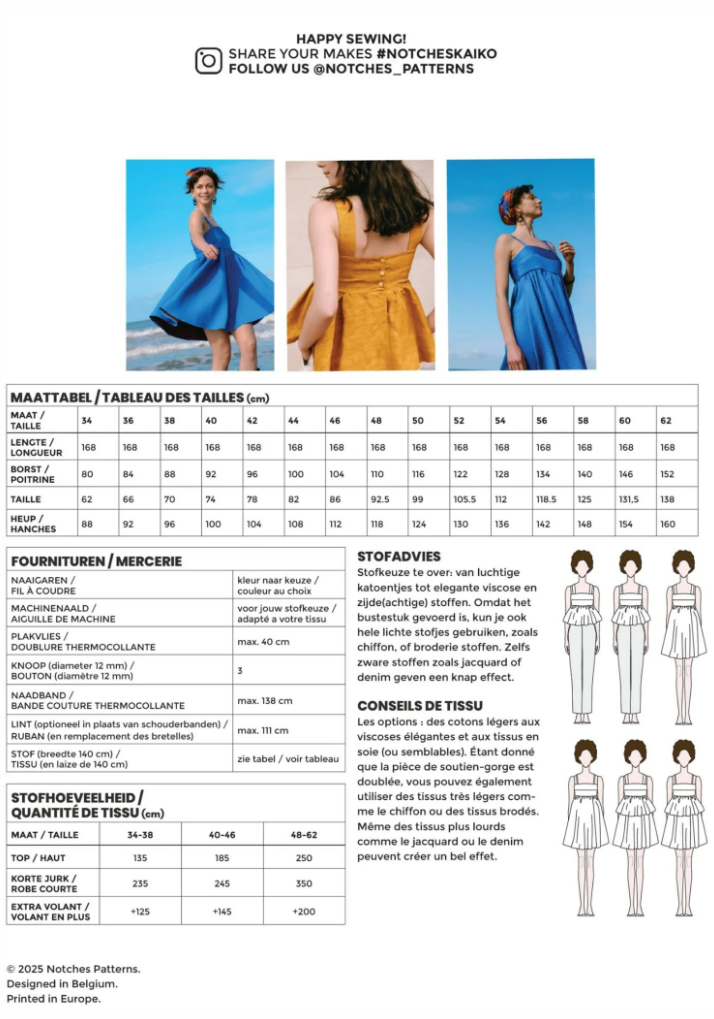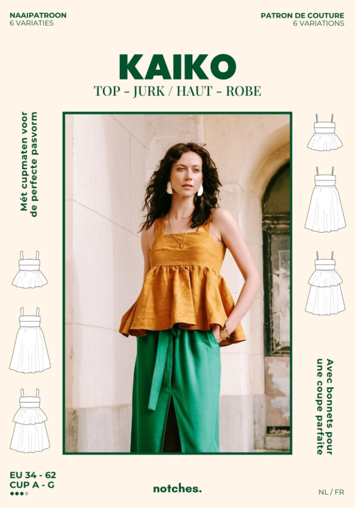 From sun-drenched beach days to cocktail nights, from a peplum top to a chic dress, or worn hip over a T-shirt, Kaiko is the ultimate must-have for summer and the transitional seasons. For the length, you can choose from two options: a cropped top or a dress just above the knee. The skirt flares out widely. Combine both skirt sections to create a flowy layered dress! The button closure at the back ensures a beautifully fitted cut. You can make wide shoulder straps that are contoured for a flattering fit, or opt for narrower pre-made ribbons. And best of all: the lined bodice comes in various cup sizes and the pattern goes up to size 62!