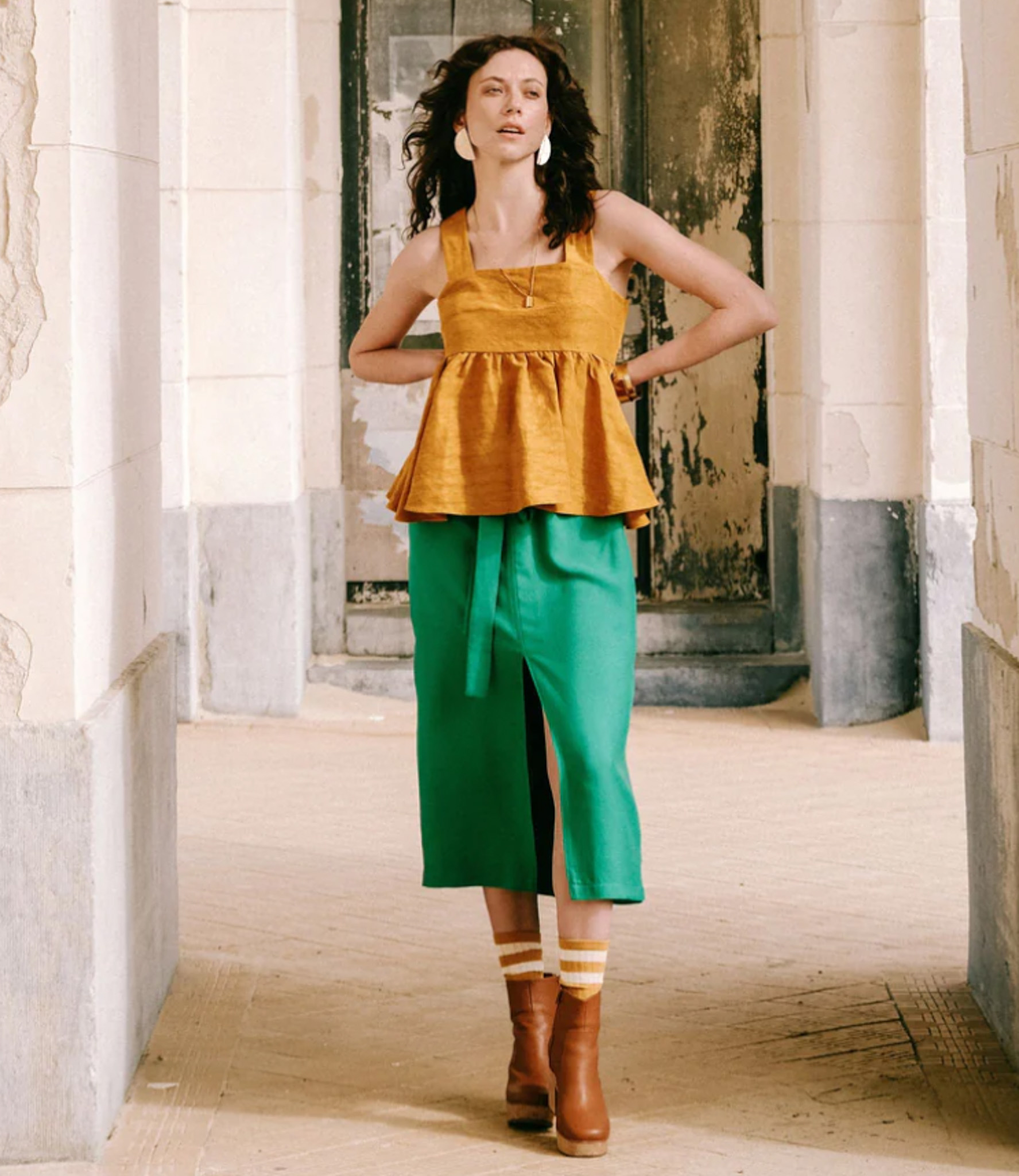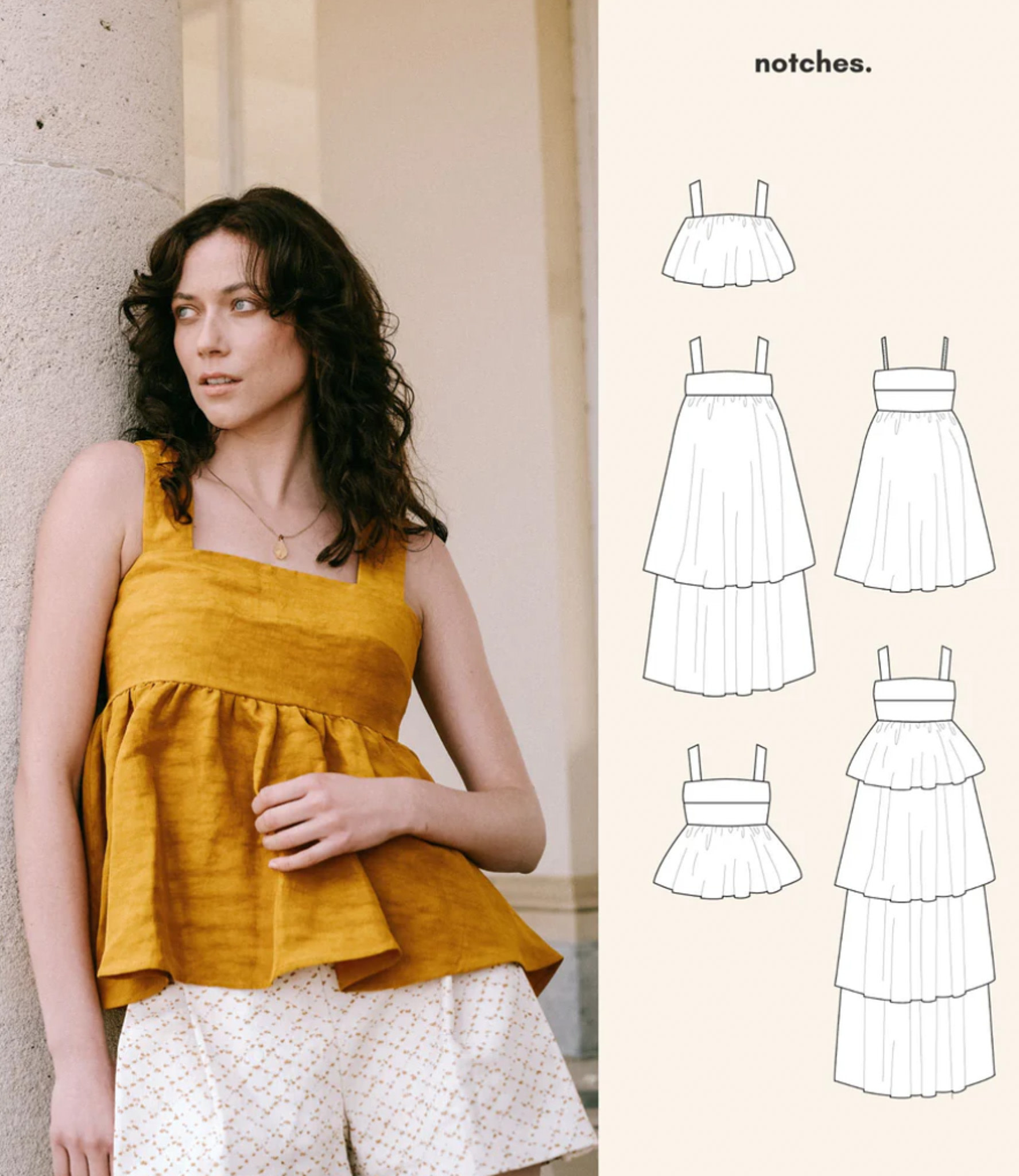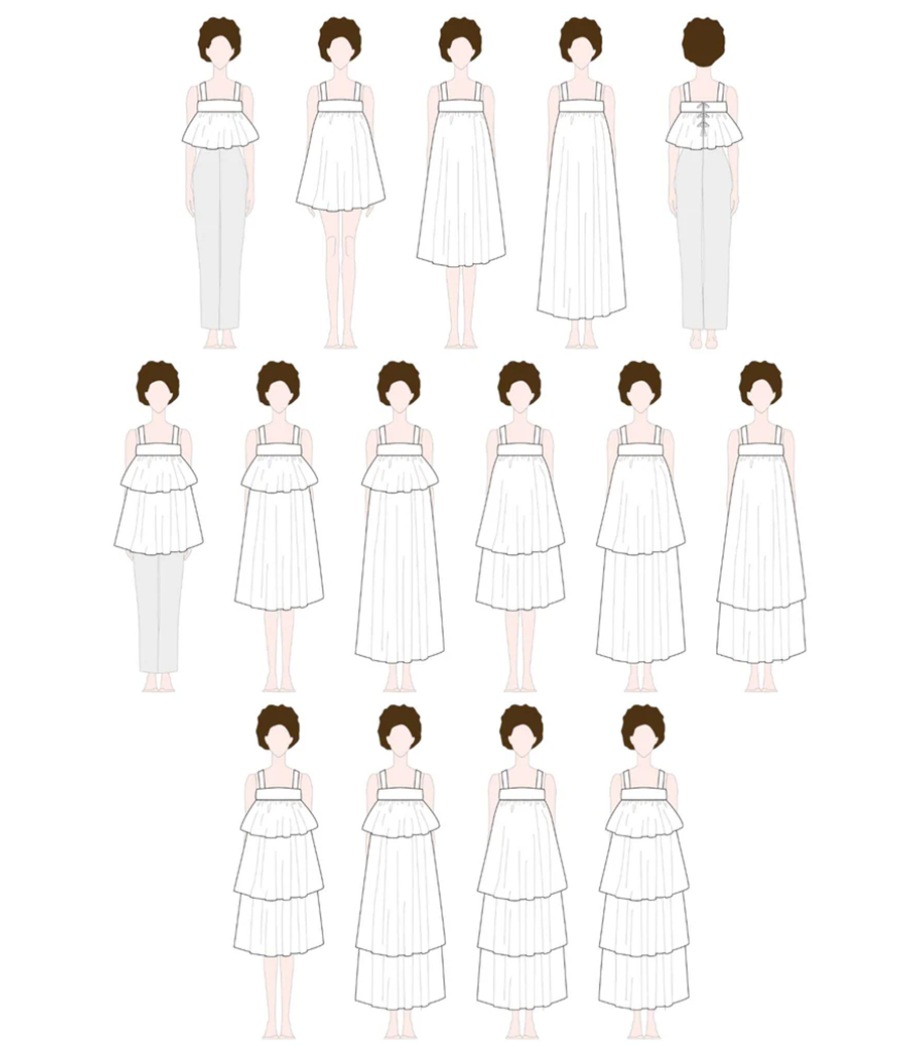 From sun-drenched beach days to cocktail nights, from a peplum top to a chic dress, or worn hip over a T-shirt, Kaiko is the ultimate must-have for summer and the transitional seasons. For the length, you can choose from two options: a cropped top or a dress just above the knee. The skirt flares out widely. Combine both skirt sections to create a flowy layered dress! The button closure at the back ensures a beautifully fitted cut. You can make wide shoulder straps that are contoured for a flattering fit, or opt for narrower pre-made ribbons. And best of all: the lined bodice comes in various cup sizes and the pattern goes up to size 62!