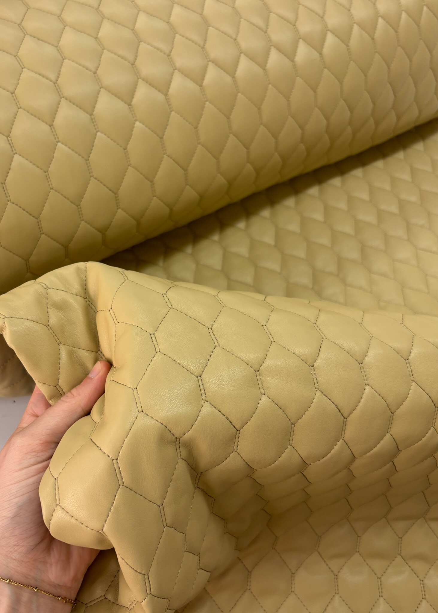 Stitched artificial leather. The back is finished with lining fabric (100% polyester), so the fabric can be used unlined. Supple. Suitable for leather vests and bags.