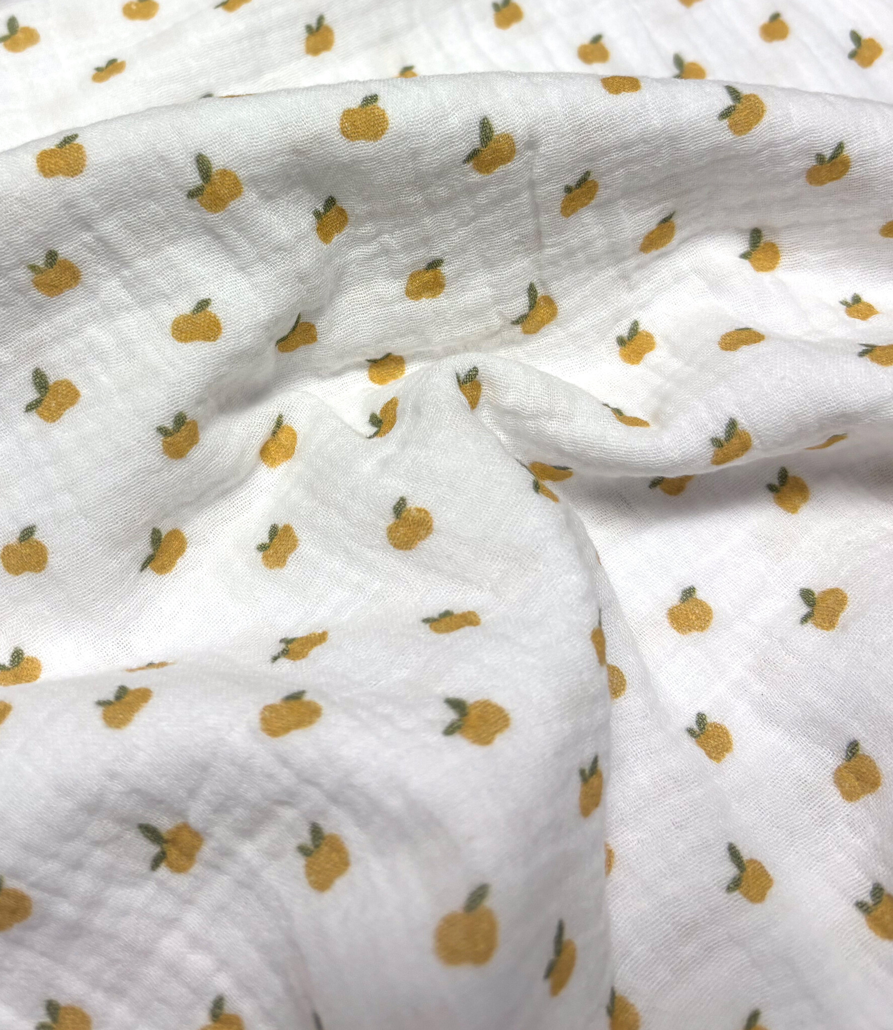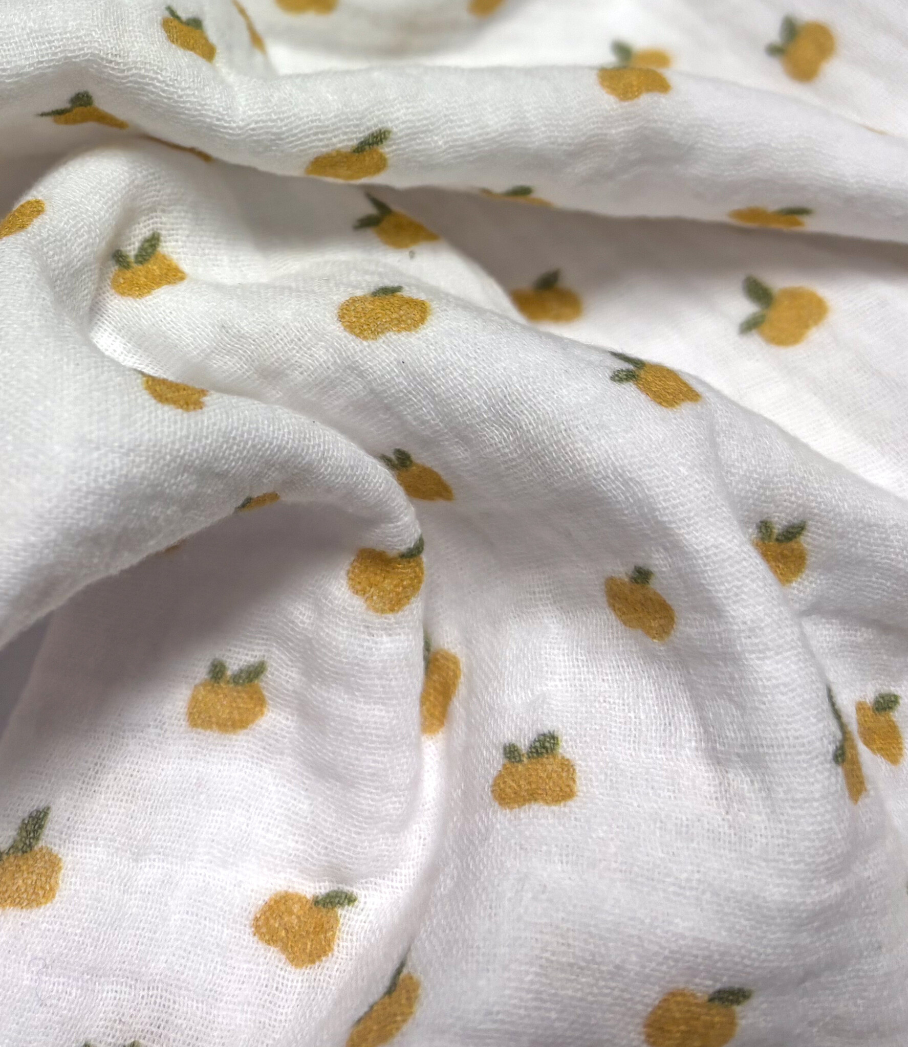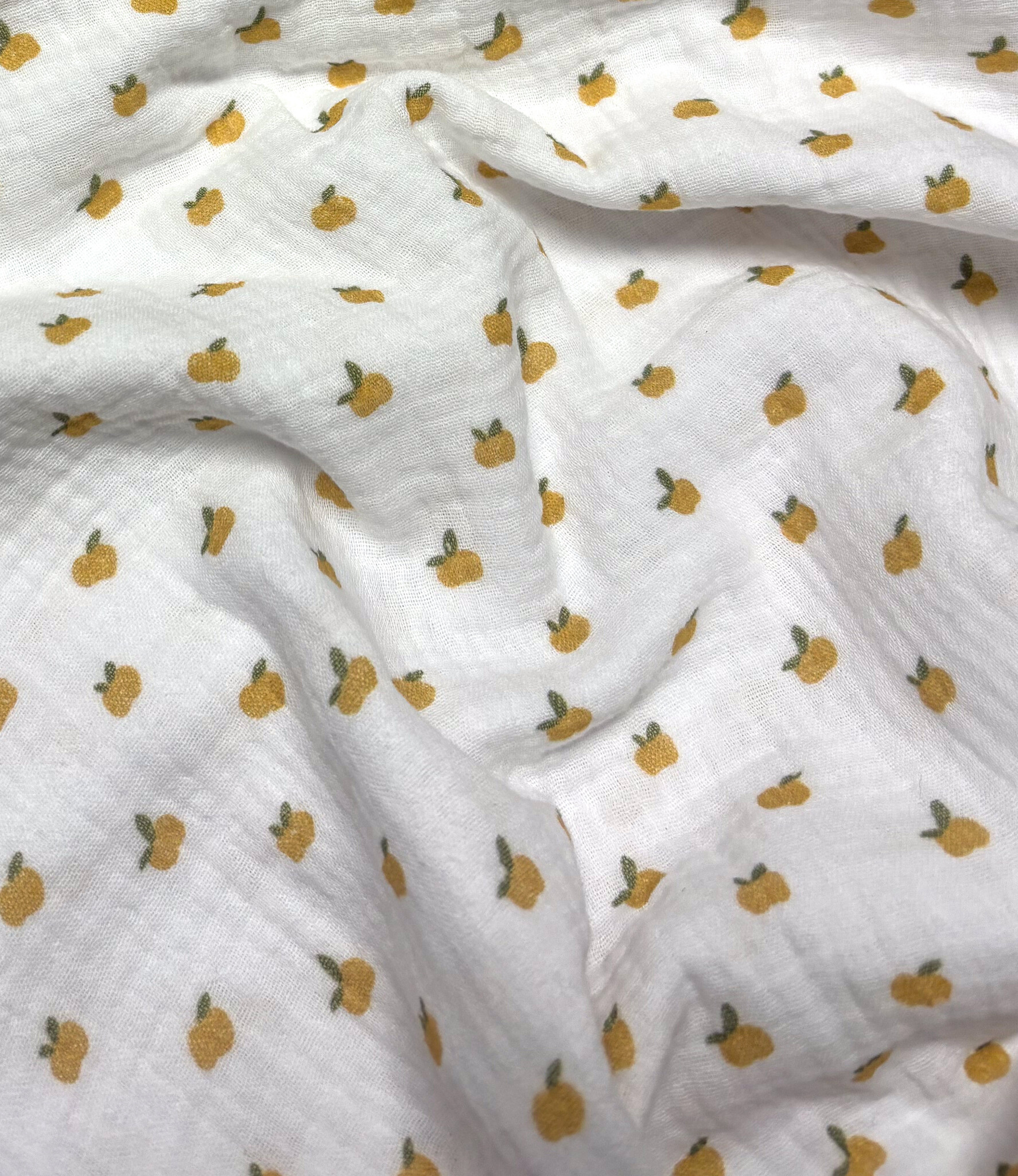 Beautiful quality double gauze with lemon details. Perfect for dresses, tops, T-shirts, and baby and children's items (nests, blankets, etc.). Wonderfully soft. OEKO-Tex certified.