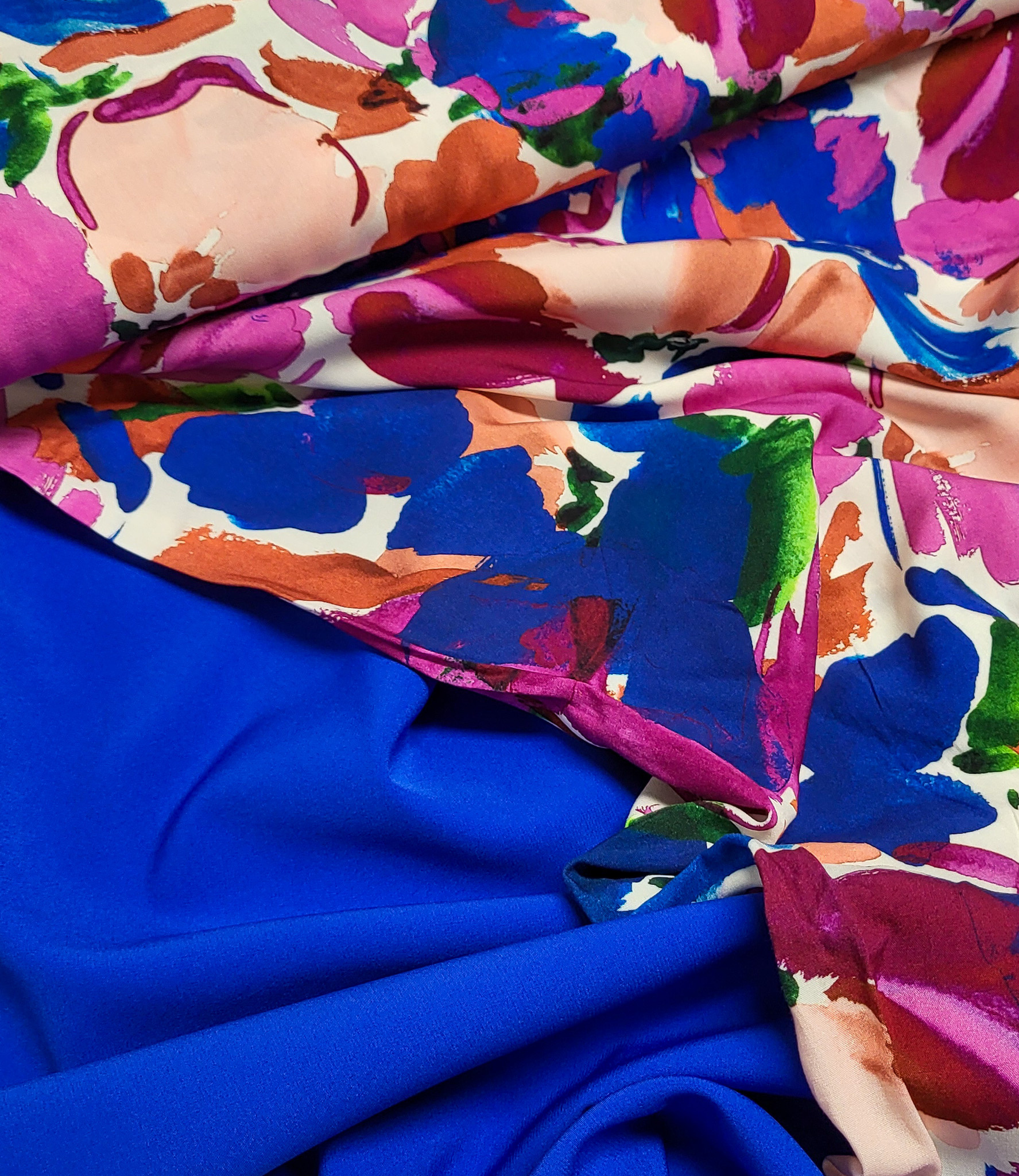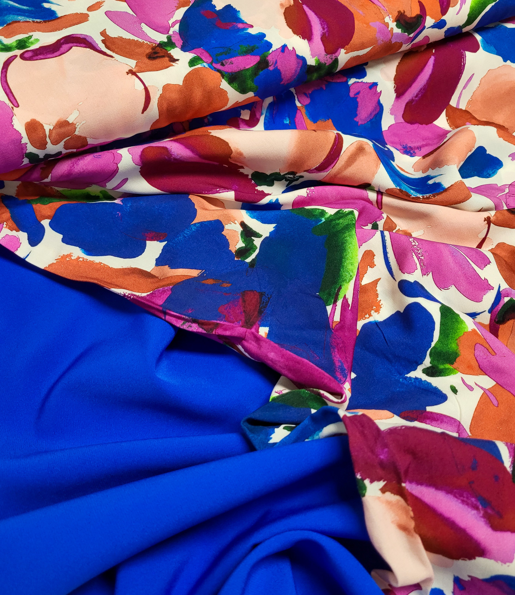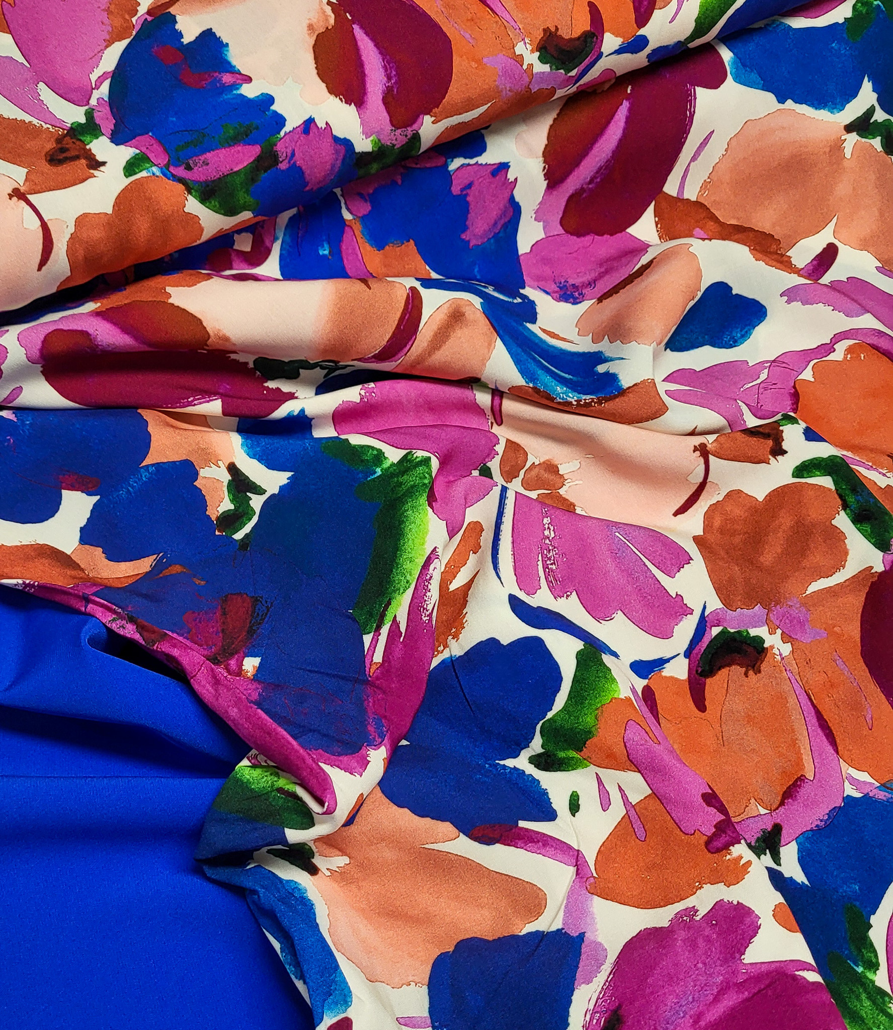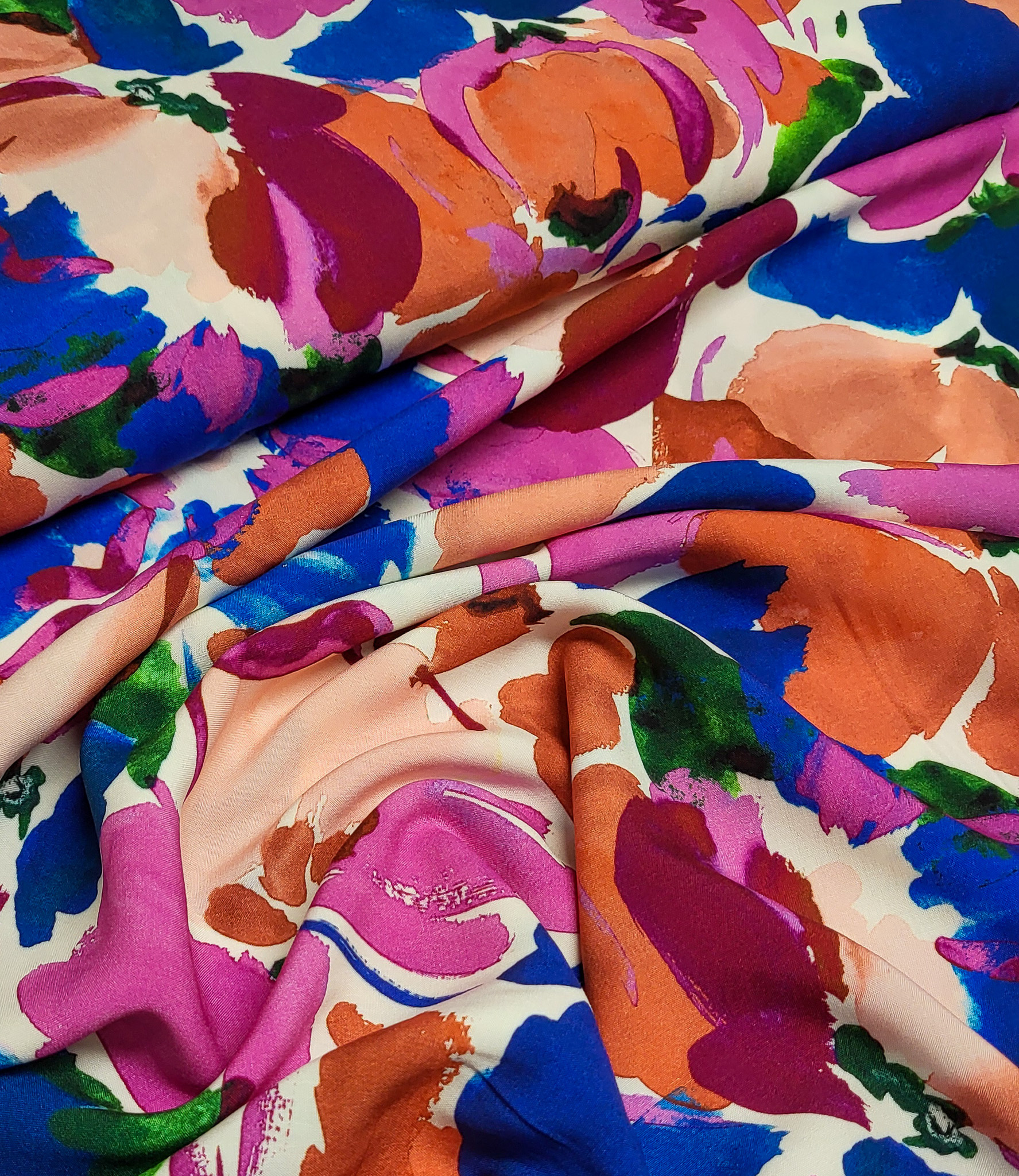 A viscose fabric with painted flowers. Beautiful for a blouse, dress, or flowing, loose-fitting trousers.
