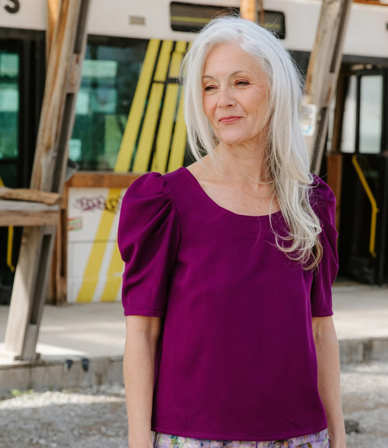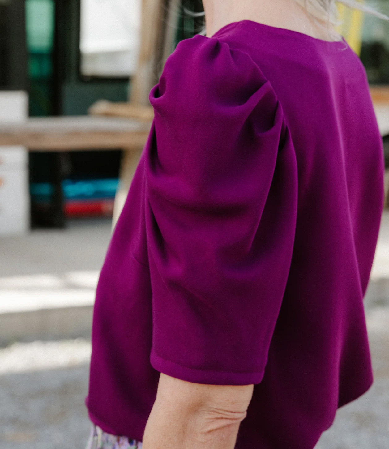 Sewing level : BEGINNER if you choose easy-to-sew fabrics such as cotton poplin, dupioni, or linen. ADVANCED if you choose more supple or smoother fabrics. The technical aspects of the pattern are : carefully making the sleeve pleats, attaching the sleeves to the bodice, and gathering the fabric.