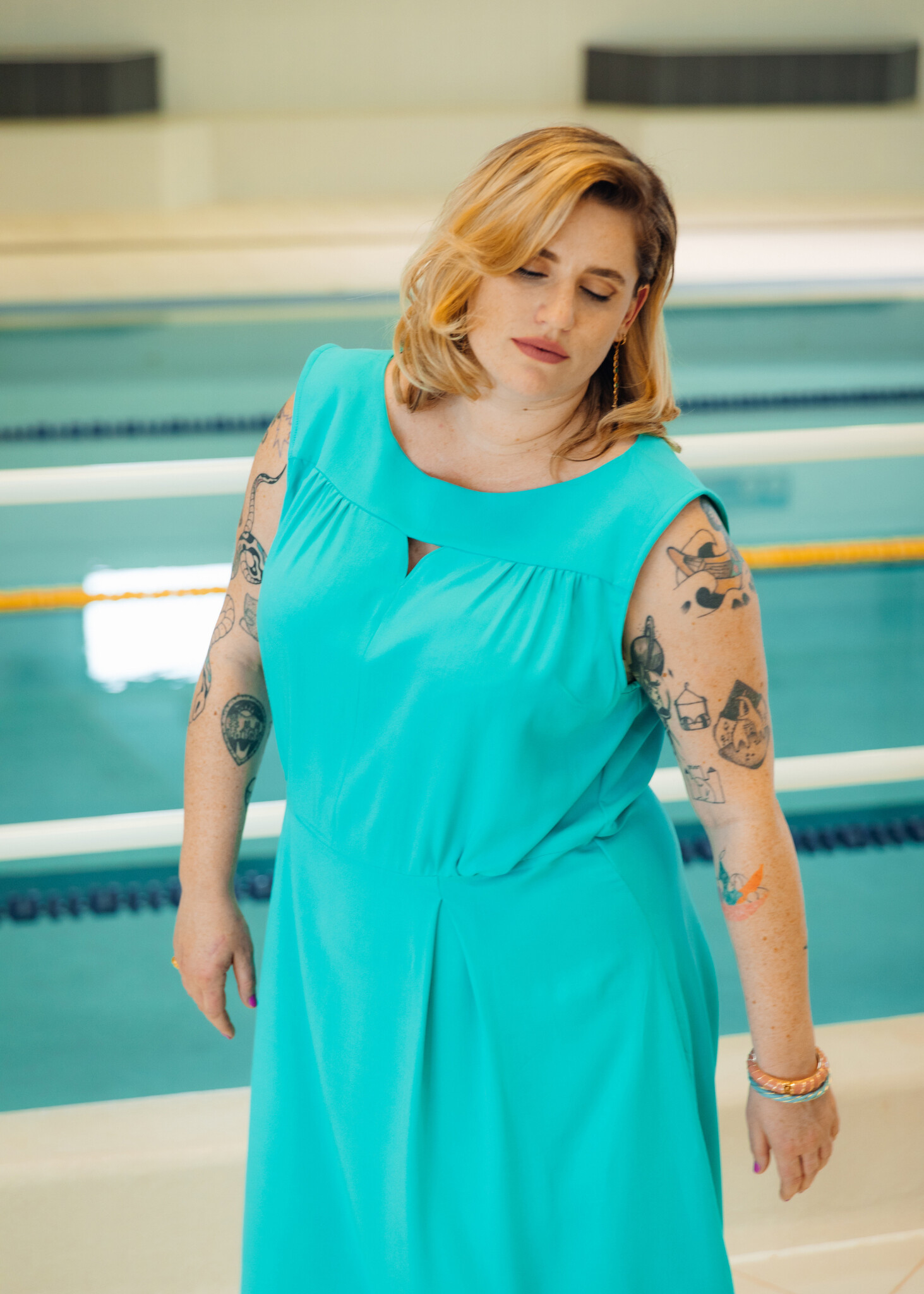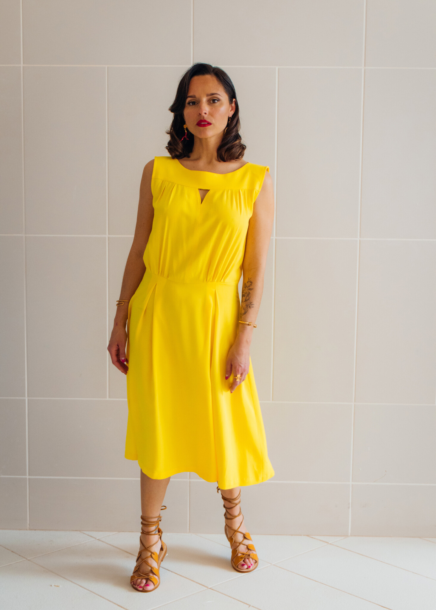 This beautiful dress accentuates the waist and draws attention to your neckline due to the beautiful cut-out. The two stitched pleats ensure that the wide skirt does not make the hips appear wider. This dress is very flattering for every figure.