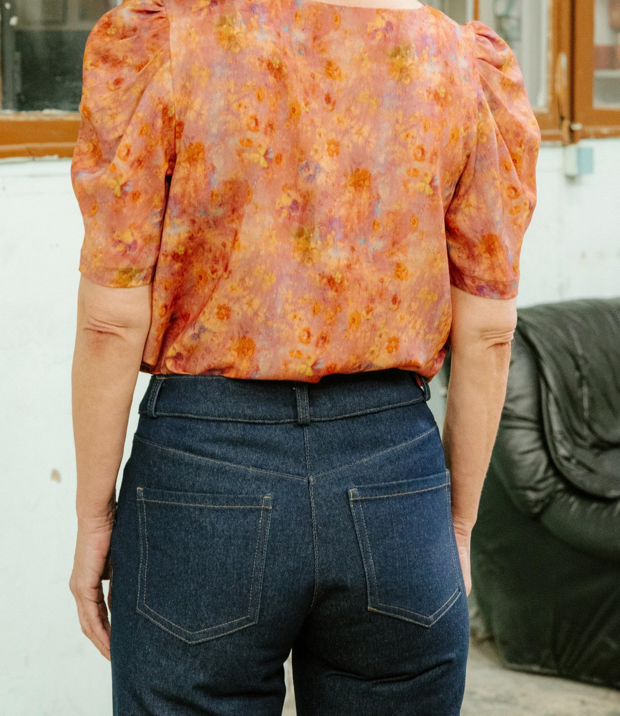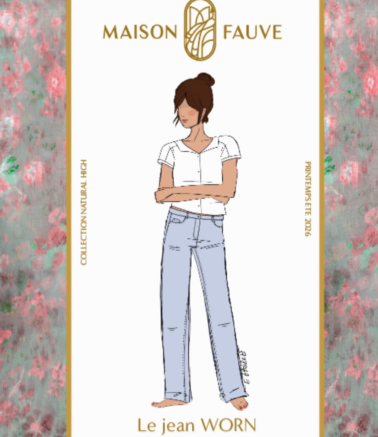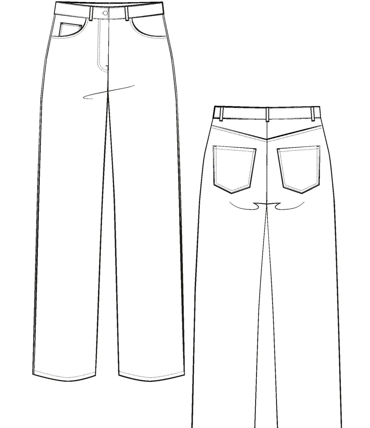 The Worn pattern is available in sizes 34 to 52. It is a pair of straight-leg jeans with a slightly dropped waistband. If you fall between two sizes, measure your hip circumference.