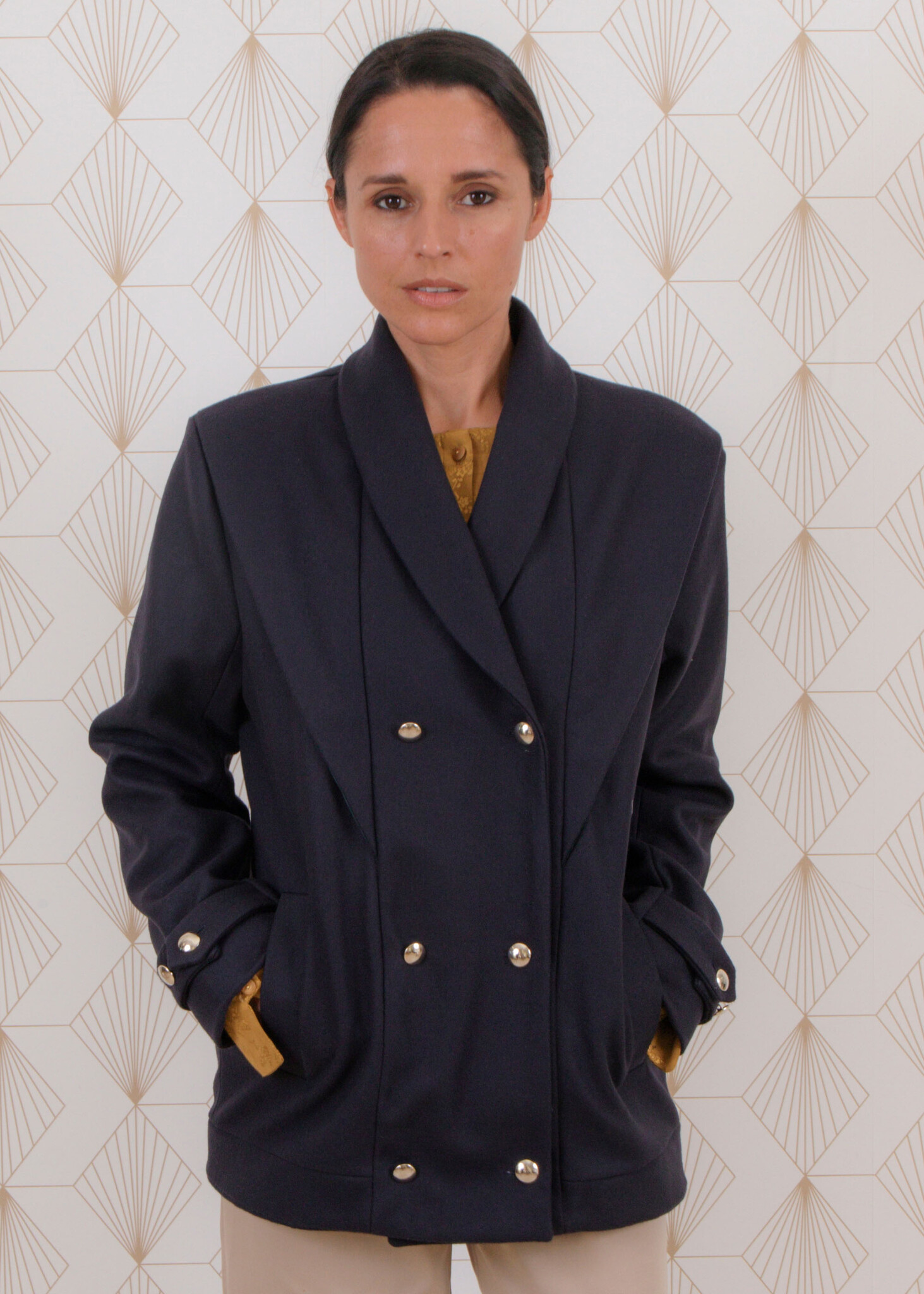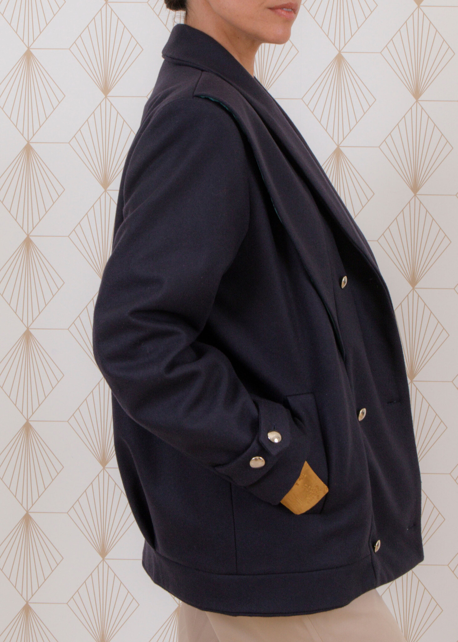Sewing level : intermediate , the technical points are the welt pocket, the lining/jacket construction, the shawl collar and the belt.